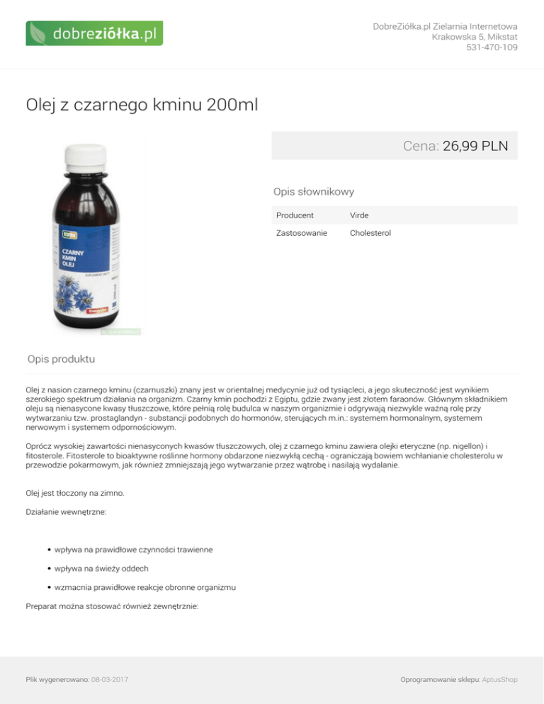 DobreZiółka.pl Zielarnia Internetowa Krakowska 5, Mikstat 531-470-109 Olej z czarnego kminu 200ml Cena: 26,99 PLN Opis słownikowy Producent Virde Zastosowanie Cholesterol Opis produktu Olej z nasion czarnego kminu (czarnuszki) znany jest w orientalnej medycynie już od tysiącleci, a jego skuteczność jest wynikiem szerokiego spektrum działania na organizm. Czarny kmin pochodzi z Egiptu, gdzie zwany jest złotem faraonów. Głównym składnikiem oleju są nienasycone kwasy tłuszczowe, które pełnią rolę budulca w naszym organizmie i odgrywają niezwykle ważną rolę przy wytwarzaniu tzw. prostaglandyn - substancji podobnych do hormonów, sterujących m.in.: systemem hormonalnym, systemem nerwowym i systemem odpornościowym. Oprócz wysokiej zawartości nienasyconych kwasów tłuszczowych, olej z czarnego kminu zawiera olejki eteryczne (np. nigellon) i fitosterole. Fitosterole to bioaktywne roślinne hormony obdarzone niezwykłą cechą - ograniczają bowiem wchłanianie cholesterolu w przewodzie pokarmowym, jak również zmniejszają jego wytwarzanie przez wątrobę i nasilają wydalanie. Olej jest tłoczony na zimno. Działanie wewnętrzne: wpływa na prawidłowe czynności trawienne wpływa na świeży oddech wzmacnia prawidłowe reakcje obronne organizmu Preparat można stosować również zewnętrznie: Plik wygenerowano: 08-03-2017 Oprogramowanie sklepu: AptusShop DobreZiółka.pl Zielarnia Internetowa Krakowska 5, Mikstat 531-470-109 do masażu obolałych pleców i zwiotczałych mięśni; u dzieci (po rozrzedzeniu odpowiednim olejkiem w stosunku 1:5) do masażu brzuszka przy wzdęciach; pielęgnacji skóry Składniki: czarny kmin ( olej z nasion) 1ml, kminek zwyczajny 0,2ml, olej z oliwki 8,8 ml w 10ml preparatu. Substancje dodatkowe: witamina E - alfa - tokoferol (antyoksydant). Porcja produktu zalecana do spożycia w ciągu dnia: 1 - 2 małych łyżeczek na dobę. Nie stosować u dzieci. Nie przekraczać zalecanej dawki dziennej. Przechowywać w suchym miejscu w temperaturze pokojowe, chronić przed światłem. Produkt nie może być stosowany jako substytut zróżnicowanej diety. Po otwarciu spożyć przed upływem jednego miesiąca Plik wygenerowano: 08-03-2017 Powered by TCPDF (www.tcpdf.org) Oprogramowanie sklepu: AptusShop