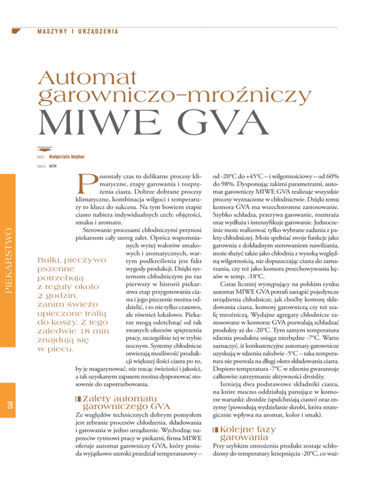 maszyny i urządzenia Automat garowniczo–mroźniczy MIWE GVA tekst: Małgorzata Majdan piekarstwo zdjęcia: GETH 20 P ozostały czas to delikatne procesy klimatyczne, etapy garowania i rozprężenia ciasta. Dobrze dobrane procesy klimatyczne, kombinacja wilgoci i temperatury to klucz do sukcesu. Na tym bowiem etapie ciasto nabiera indywidualnych cech: objętości, smaku i aromatu. Sterowanie procesami chłodniczymi przynosi piekarzom cały szereg zalet. Oprócz wspomnianych wyżej walorów smakowych i aromatycznych, warBułki, pieczywo tym podkreślenia jest fakt wygody produkcji. Dzięki syspszenne temom chłodniczym po raz potrzebują pierwszy w historii piekarz reguły około stwa etap przygotowania cia2 godzin, sta i jego pieczenie można odzanim świeżo dzielić, i to nie tylko czasowo, upieczone trafią ale również lokalowo. Piekarze mogą odetchnąć od tak do koszy. Z tego zwanych okresów spiętrzenia zaledwie 18 min pracy, szczególnie tej w trybie znajdują się nocnym. Systemy chłodnicze w piecu. otwierają możliwość produkcji większej ilości ciasta po to, by je magazynować, nie tracąc świeżości i jakości, a tak uzyskanym zapasem można dysponować stosownie do zapotrzebowania. Zalety automatu garowniczego GVA Ze względów technicznych dobrym pomysłem jest zebranie procesów chłodzenia, składowania i garowania w jedno urządzenie. Wychodząc naprzeciw rytmowi pracy w piekarni, firma MIWE oferuje automat garowniczy GVA, który posiada wyjątkowo szeroki przedział temperaturowy – od -20°C do +45°C – i wilgotnościowy – od 60% do 98%. Dysponując takimi parametrami, automat garowniczy MIWE GVA realizuje wszystkie procesy wyznaczone w chłodnictwie. Dzięki temu komora GVA ma wszechstronne zastosowanie. Szybko schładza, przerywa garowanie, rozmraża oraz wydłuża i intensyfikuje garowanie. Jednocześnie może realizować tylko wybrane zadania z palety chłodniczej. Może spełniać swoje funkcje jako garownia z dokładnym sterowaniem nawilżania, może służyć także jako chłodnia z wysoką względną wilgotnością, nie dopuszczając ciasta do zamarzania, czy też jako komora przechowywania kęsów w temp. -18°C. Coraz liczniej występujący na polskim rynku automat MIWE GVA potrafi zastąpić pojedyncze urządzenia chłodnicze, jak choćby komorę składowania ciasta, komorę garowniczą czy też szafę mroźniczą. Wydajne agregaty chłodnicze zastosowane w komorze GVA pozwalają schładzać produkty aż do -20°C. Tym samym temperatura rdzenia produktu osiąga niezbędne -7°C. Warto zaznaczyć, iż konkurencyjne automaty garownicze uzyskują w rdzeniu zaledwie -5°C – taka temperatura nie pozwala na długi okres składowania ciasta. Dopiero temperatura -7°C w rdzeniu gwarantuje całkowite zatrzymanie aktywności drożdży. Istnieją dwa podstawowe składniki ciasta, na które mocno oddziałują panujące w komorze warunki: drożdże (spulchniają ciasto) oraz enzymy (powodują wydzielanie skrobi, która strategicznie wpływa na aromat, kolor i smak). Kolejne fazy garowania Przy szybkim zmrożeniu produkt zostaje schłodzony do temperatury krzepnięcia -20°C, co waż- ci. Mniejsza utrata temperatury to mniejsze zużycie energii. A jeśli o energii, to należy wymienić jeszcze jeden szczegół – garownia GVA wyposażona jest w skośny obszar wlotowy, naprowadzający powietrze bezpośrednio do parownika, nie powodujący zbędnego oblodzenia blaszek. Energia potrzebna do rozmrażania oblodzonych blaszek może zostać w ten sposób zaoszczędzona. W komorze zamontowane są także odporne na uderzenia wózków ramy z tworzywa sztucznego. Mocną stroną komory garowniczej GVA jest opatentowany system prowadzenia powietrza w formie paneli. Parowniki mają nie tylko dużą powierzchnię, ale dokładnie dobrane odległości blaszek, które gwarantują najlepszą wydajność chłodniczą. Wielkość garowni, odległości blaszek parowników oraz wszelkie drobne szczegóły dopasowywane są indywidualnie. Nowością w automacie garowniczym MIWE GVA jest intuicyjne sterowanie MIWE TC, znane wcześniej z wyposażenia pieców MIWE. Wydajne, wielostronne i wygodne MIWE TC w formie dużego ekranu pozwala na łatwe definiowanie procesów (obrazkowo) i bezpieczne ich przywoływanie. Użytkownicy GVA informują o lepszej jakości i lepszym zachowaniu świeżości produktów. Jeden z piekarzy, nie kryjąc zadowolenia, z dumą potwierdza: „Produkujemy bułki o tak wysokiej jakości, jakiej nie mieliśmy dotąd. Pozwala nam to zdystansować mocną konkurencję na rynku piekarskim”. Do większości naszych klientów najbardziej przemawia końcowy efekt, „powtarzalna i wysoka jakość produktów”. Inna wypowiedź podkreśla walory niskiego zużycia energii i mimo niedużej wilgotności niski poziom wysuszania kęsów. marzec ne, bez niszczenia struktury ciasta. Garowanie zostaje zatrzymane. W takich warunkach ciasto może być składowane dość długo (w zależności od tego, czy kęsy są zapakowane, czy nie). Aktywność drożdży zostaje całkowicie wstrzymana, natomiast nadal w nieznacznym stopniu aktywne są enzymy. Ciasto na bułki przy zmrożeniu w rdzeniu do -7°C może być przechowywane w automacie GVA do 4 dni, a ciasto francuskie – nawet do 10 dni. Kolejna faza to rozmrażanie do 0°C – ciasto przechodzi w fazę opóźnienia garowania, w której nieaktywne są drożdże, nieznaczną aktywność wykazują jedynie enzymy. Najbardziej pożądany etap to przedział niskich temperatur dodatnich, faza wydłużonego garowania, w której przy temp. ok. +4°C tworzą się szczególnie intensywne walory smakowe. Przyczyniają się do tego niska aktywność drożdży i jednocześnie duża aktywność enzymów. Jest to sprawdzona metoda wśród piekarzy świadomie dążących do intensyfikacji aromatu i poprawy struktury ciasta. Po sześciu, ośmiu godzinach wydłużonego garowania ciasto osiąga w przeciągu kolejnych 2, 3 godzin poziom intens