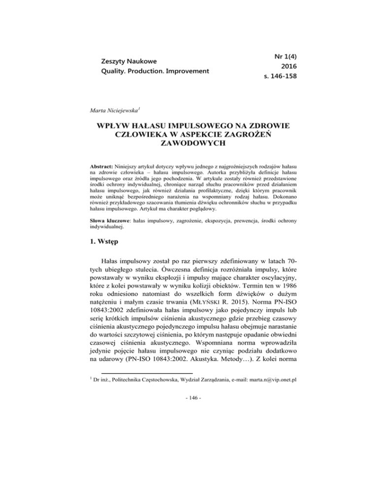 Nr 1(4) Zeszyty Naukowe Quality. Production. Improvement 2016 s. 146-158 Marta Niciejewska1 WPŁYW HAŁASU IMPULSOWEGO NA ZDROWIE CZŁOWIEKA W ASPEKCIE ZAGROŻEŃ ZAWODOWYCH Abstract: Niniejszy artykuł dotyczy wpływu jednego z najgroźniejszych rodzajów hałasu na zdrowie człowieka – hałasu impulsowego. Autorka przybliżyła definicje hałasu impulsowego oraz źródła jego pochodzenia. W artykule zostały również przedstawione środki ochrony indywidualnej, chroniące narząd słuchu pracowników przed działaniem hałasu impulsowego, jak również działania profilaktyczne, dzięki którym pracownik może uniknąć bezpośredniego narażenia na wspomniany rodzaj hałasu. Dokonano również przykładowego szacowania tłumienia dźwięku ochronników słuchu w przypadku hałasu impulsowego. Artykuł ma charakter poglądowy. Słowa kluczowe: hałas impulsowy, zagrożenie, ekspozycja, prewencja, środki ochrony indywidualnej. 1. Wstęp Hałas impulsowy został po raz pierwszy zdefiniowany w latach 70tych ubiegłego stulecia. Ówczesna definicja rozróżniała impulsy, które powstawały w wyniku eksplozji i impulsy mające charakter oscylacyjny, które z kolei powstawały w wyniku kolizji obiektów. Termin ten w 1986 roku odniesiono natomiast do wszelkich form dźwięków o dużym natężeniu i małym czasie trwania (MŁYŃSKI R. 2015). Norma PN-ISO 10843:2002 zdefiniowała hałas impulsowy jako pojedynczy impuls lub serię krótkich impulsów ciśnienia akustycznego gdzie przebieg czasowy ciśnienia akustycznego pojedynczego impulsu hałasu obejmuje narastanie do wartości szczytowej ciśnienia, po którym następuje opadanie obwiedni czasowej ciśnienia akustycznego. Wspomniana norma wprowadziła jedynie pojęcie hałasu impulsowego nie czyniąc podziału dodatkowo na udarowy (PN-ISO 10843:2002. Akustyka. Metody…). Z kolei norma 1 Dr inż., Politechnika Częstochowska, Wydział Zarządzania, e-mail: [email protected] - 146 - Nr 1(4) Zeszyty Naukowe Quality. Production. Improvement 2016 s. 146-158 PN-N-01307:1994 za hałas impulsowy podaje hałas, który składa się z jednego lub wielu zdarzeń dźwiękowych – każde o czasie trwania mniejszym niż 1 sekunda (PN-N-01307:1994. Hałas- dopuszczalne…). Hałas impulsowy jest bardzo istotnym zagrożeniem dla słuchu. Posiada bowiem inny mechanizm oddziaływania na system słuchowy niż ma to miejsce w przypadku hałasu ustalonego. Ubytek słuchu nie jest związany z wieloletnią ekspozycją na hałas. Do utraty słuchu może nastąpić nawet po jednym zdarzeniu, w którym wystąpi ekspozycja na silny impuls akustyczny (KORADECKA D. 2008). Hałas impulsowy to przykład hałasu krótkotrwałego, ale bardzo uciążliwego. Najistotniejszym zagrożeniem dla człowieka związanym właśnie z dźwiękami impulsowymi jest ryzyko uszkodzenia słuchu. 2. Źródła powstawania hałasu impulsowego Ryzyko uszkodzenia słuchu rośnie wraz z mocą źródła, a maleje ze wzrostem odległości pomiędzy osoba a źródłem. Bardzo istotna jest także droga propagacji dźwięku, gdzie fala akustyczna może podlegać zarówno rozproszeniu, jak i tłumieniu. Dźwięki impulsowe zazwyczaj są dobrze rozpoznawalne przez człowieka, jednak czasem pewna część impulsów jest niezauważalna. Dzieje się to wówczas, gdy wiele źródeł hałasu dociera do naszego narządu słuchu jednocześnie. W psychoakustyce nazywa się takie zjawisko maskowaniem (KUKULSKI B. 2016). Jak już zostało wspomniane, dźwiękami impulsowymi nazywa się zdarzenia akustyczne, które cechują się wysokim poziomem ciśnienia akustycznego, a przy tym trwają bardzo krótko – często są to tysięczne części sekundy. O hałasie impulsowym mówi się zatem wtedy, gdy jest powodem uciążliwości akustycznej lub stanowi realne zagrożenie uszkodzenia słuchu pracownika (ENGEL Z., ZAWIESKA W. 2010). Regulacje dotyczące problematyki ekspozycji na hałas impulsowy oraz ochrony pracowników przed narażeniem na niego znajdują się w rozporządzeniu Ministra Pracy i Polityki Społecznej. Zawiera ono również zdefiniowane najistotniejsze parametry hałasu impulsowego, - 147 - Nr 1(4) Zeszyty Naukowe Quality. Production. Improvement 2016 s. 146-158 a mianowicie – maksymalny poziom dźwięku A, szczytowy poziom dźwięku C oraz poziom ekspozycji na hałas odniesiony do 8-godzinnego dnia pracy. Oczywiście w odniesieniu do każdego z wyżej wymienionych parametrów zostały określone zarówno najwyższe dopuszczalne natężenia – NDN, jak i wartości progów działania, które zawarte są w tabeli 1. Tabela 1. Najwyższe dopuszczalne natężenia (NDN) i wartości progów działania Parametr Maksymalny poziom dźwięku A Szczytowy poziom dźwięku C Poziom ekspozycji na hałas odniesiony do 8-godzinnego dnia pracy NDN [dB] 115 135 Próg działania [dB] 135 85 80 Źródło: Opracowanie własne na podstawie GAŁUSZA M. 2014 Szczytowy poziom dźwięku C hałasu impulsowego, który wytwarzany jest na stanowiskach pracy w przemyśle przyjmuje wartości nawet do około 150 dB. Hałas ten jest związany najczęściej ze zderzeniami obiektów, a impulsy akustyczne, które w ten sposób powstają mają charakter oscylacyjny. Źródła hałasu impulsowego w przemyśle to prasy, pistolety gwoździujące, młoty pneumatyczne, młoty parowo-matrycowe, zakuwarki, znakowniki, nożyce gilotynowe itd. (MŁYŃSKI R. 2015). Źródłem hałasu impulsowego jest również broń palna, czyli pistolety, karabiny i broń dużego kalibru. Hałas impulsowy wytwarzany jest również podczas eksplozji materiałów wybuchowych. Wśród narażonych na działanie hałasu impulsowego pochodzącego z wyżej wymienionych źródeł są pracownicy służb mundurowych, osoby pełniące funkcje w siłach zbrojnych, pracownicy testujący broń (przemysł zbrojeniowy), myśliwi, pracownicy kamieniołomów itp. (MŁYŃSKI R. 2013). Sport to kolejne źródło omawianego w niniejszym artykule hałasu. Przede wszystkim 