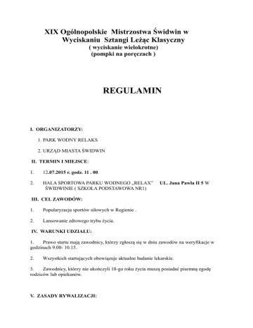 XIX Ogólnopolskie Mistrzostwa Świdwin w Wyciskaniu Sztangi Leżąc Klasyczny ( wyciskanie wielokrotne) (pompki na poręczach ) REGULAMIN I. ORGANIZATORZY: 1. PARK WODNY RELAKS 2. URZĄD MIASTA ŚWIDWIN II. TERMIN I MIEJSCE: 1. 12.07.2015 r. godz. 11 . 00 2. HALA SPORTOWA PARKU WODNEGO „RELAX” ŚWIDWINIE ( SZKOŁA PODSTAWOWA NR1) UL. Jana Pawła II 5 W III. CEL ZAWODÓW: 1. Popularyzacja sportów siłowych w Regionie . 2. Lansowanie zdrowego trybu życia. IV. WARUNKI UDZIAŁU: 1. Prawo startu mają zawodnicy, którzy zgłoszą się w dniu zawodów na weryfikacje w godzinach 9.00- 10.15. 2. Wszystkich startujących obowiązuje aktualne badanie lekarskie. 3. Zawodnicy, którzy nie ukończyli 18-go roku życia muszą posiadać pisemną zgodę rodziców lub opiekunów. V. ZASADY RYWALIZACJI: 1.Zawodnicy mogą startować jedynie w obcisłych spodenkach oraz w koszulkach z krótkim rękawkiem. 2. Dopuszcza się stosowanie opasek ściągających na nadgarstki. 3. Zaliczenie boju nastąpi po spełnieniu następujących wymogów: - wyciskamy na dwie komendy : pierwsza to komenda „start” następuje po zdjęciu sztangi ze stojaków i pełnym zablokowaniu sztangi w stawie łokciowym, druga komenda to „ stojak” po wyciśnięciu sztangi i pełnym zablokowaniu ramion w stawach łokciowych . 4. Podejście spalone: - oderwane pośladki od ławeczki - nie stosowanie się do komend - odbicie sztangi od ciała - oderwanie głowy od ławeczki - oderwanie stopy od podłoża (dozwolone krawędziowanie) - cofnięcie się sztangi podczas wyciskania 5. Rywalizacja wyciskania klasycznego odbędzie się w następujących kategoriach wagowych : - 73kg według tabeli Wilks a.; 85kg według tabeli Wilks a. ; 100kg według tabeli Wilks a.; + 100 kg według tabeli Wilks a. juniorów do 21 roku życia według tabeli Wilks a.; kobiet według tabeli Wilks a.; weteranów 40-50 lat według tabeli Wilks a; weteranów +50 lat według tabeli Wilks a. 6. Rywalizacja w wielokrotnym wyciskaniu cc własnej wagi ciała. - zaokrąglenia ciężaru w dół co 2,5 kg - przy takiej samej liczbie powtórzeń wygrywa lżejszy zawodnik - zaliczone podejście następuje po pełnym zablokowaniu ciężaru w stawie łokciowym 7. Rywalizacja w pompkach na poręczach z obciążeniem 20 kg - podejście zaliczone po zejściu do kąta prostego i wyprostowaniu stawu łokciowego - maksymalny odpoczynek między ruchami to 4 sekundy. 8. Zgłoszenia przyjmowane są do 7 lipca 2015 roku na adres [email protected] VI. NAGRODY: 1. Za zajęcie I-III miejsca w każdej kategorii zawodnicy otrzymują medale, dyplomy, oraz nagrody rzeczowe. 2. Każdy z zawodników otrzyma dyplom za uczestnictwo. 3. Zawodnicy , którzy zajmą miejsca od 1 do 4 otrzymają koszulki okolicznościowe. VII. FINANSOWANIE IMPREZY: 1. Zawodnicy i osoby towarzyszące przyjeżdżają na koszt własny. 2. W zawodach obowiązuje opłata startowa w wysokości 25 zł za jedną konkurencję i po 15 zł za każdą następną konkurencję. Za start we wszystkich konkurencjach opłata wysokości 50 zł. 3. VIII. POSTANOWIENIA KOŃCOWE: 1. Organizator nie ponosi żadnej odpowiedzialności z tytułu wypadków podczas trwania zawodów i dotyczy to zarówno zawodników, sędziów i obsługi technicznej. 2. Obowiązek ubezpieczenia spoczywa na zawodnikach lub stowarzyszeniu delegującym go na te zawody. 3. Odprawa techniczna odbędzie się 30 minut przed rozpoczęciem turnieju. 4. Opłata startowa będzie pobierana przy ważeniu zawodników. 5. Prawo interpretacji niniejszego regulaminu należy wyłącznie do organizatora. 6. Organizator prosi o potwierdzenie udziału w turnieju. UWAGI: 1. TELEFON KONTAKTOWY- 509229805 ORGANIZATOR