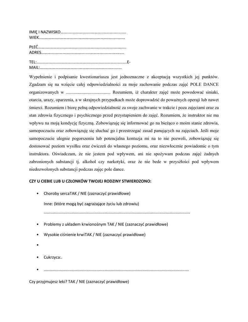 IMIĘ I NAZWISKO………………………………………………………. WIEK………………………………………………………………........... PŁEĆ………………………………………………………………………….. ADRES……………………………………………………………........... TEL:…………………………………………………………………………….EMAIL:…………………………………………………………….......... Wypełnienie i podpisanie kwestionariusza jest jednoznaczne z akceptacją wszystkich jej punktów. Zgadzam się na wzięcie całej odpowiedzialności za moje zachowanie podczas zajęć POLE DANCE organizowanych w ........................................ Rozumiem, iż charakter zajęć może powodować siniaki, otarcia, urazy, oparzenia, a w skrajnych przypadkach może doprowadzić do poważnych operaji lub nawet śmierci. Rozumiem i biorę pełną odpowiedzialność za swoje zachwanie w trakcie i poza zajęciami oraz za stan zdrowia fizycznego i psychicznego przed przystapieniem do zajęć. Rozumiem, że instruktor nie ma wpływu na moją kondycję fizyczną. Zobowiązuję się informować go na bieżąco o moim stanie zdrowia, samopoczuciu oraz zobowiązuję się słuchać go i przestrzegać zasad panujących na zajęciach. Jeśli moje samopoczucie ulegnie pogorszeniu lub potencjalna kontuzja mi na to nie pozwoli, zobowiązuję się dostosować poziom wysiłku oraz ćwiczeń do własnego poziomu, oraz niezwłocznie powiadomic o tym instruktora. Oświadczam, że nie jestem pod wpływem, ani nie spożywam podczas zajęć żadnych zabronionych substancji tj. alkohol czy narkotyki, oraz że nie bede w przysżłości pod wpływem niedozwolonych substancji podczas zajęc pole dance. CZY U CIEBIE LUB U CZŁONKÓW TWOJEJ RODZINY STWIERDZONO: • Choroby sercaTAK / NIE (zaznaczyć prawidłowe) Inne: (które mogą być zagrażające życiu lub zdrowiu) .................................................................................................................................. • Problemy z układem krwionośnym TAK / NIE (zaznaczyć prawidłowe) • Wysokie ciśnienie krwiTAK / NIE (zaznaczyć prawidłowe) • • Cukrzyca:. • ................................................................................................................................. Czy przyjmujesz leki? TAK / NIE (zaznaczyć prawidłowe) Jeśli tak to (jakie?)………………………………………………………………………………................................... Czy jesteś na coś przewlekle chora/y? TAK / NIE (zaznaczyć prawidłowe) Jeśli tak to na co? ................................................................................................................. Czy jesteś na coś uczulona/y? TAK / NIE (zaznaczyć prawidłowe) Jeśli tak to na co? .................................................................................................................. Czy obenie posiadasz jakieś niedoleczone kontuzje? TAK / NIE (zaznaczyć prawidłowe) Jeśli tak to (jakie?)………………………………………………………………………………................................... Czy jesteś w ciąży lub byłaś w ostatnich 3 miesiącach?.......................................................................................................................... Czy masz wadę postawy? skrzywienie kręgosłupa? TAK / NIE (zaznaczyć prawidłowe) Jeśli tak to (jakie?)………………………………………………………………………………..................................... Czy jesteś aktywna/y fizycznie? TAK / NIE (zaznaczyć prawidłowe) jeśli tak, jaką/jakie aktywniości fizyczne uprawiasz? .............................................................. .............................................................................................................................................. Jaka jest twoja motywacja do rozpoczecia ćwiczeń pole dance? .............................................................................................................................................. Czy brałaś/łeś już kiedyś udział w takich zajęciach? TAK / NIE (zaznaczyć prawidłowe) Jeśli tak jak długo:................................................................................................................... ………………………………………………………………………………………… (Data i podpis kursanta)