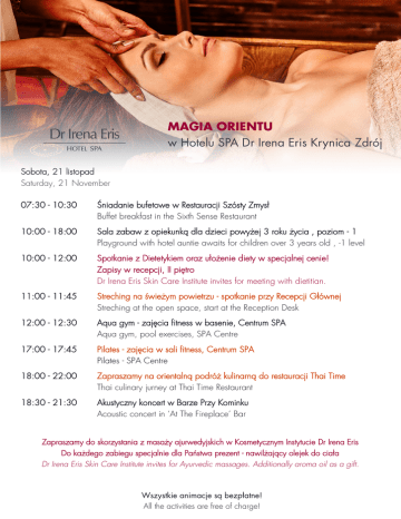 MAGIA ORIENTU w Hotelu SPA Dr Irena Eris Krynica Zdrój Sobota, 21 listopad Saturday, 21 November 07:30 - 10:30 Śniadanie bufetowe w Restauracji Szósty Zmysł Buffet breakfast in the Sixth Sense Restaurant 10:00 - 18:00 Sala zabaw z opiekunką dla dzieci powyżej 3 roku życia , poziom - 1 Playground with hotel auntie awaits for children over 3 years old , -1 level 10:00 - 12:00 Spotkanie z Dietetykiem oraz ułożenie diety w specjalnej cenie! Zapisy w recepcji, II piętro Dr Irena Eris Skin Care Institute invites for meeting with dietitian. 11:00 - 11:45 Streching na świeżym powietrzu - spotkanie przy Recepcji Głównej Streching at the open space, start at the Reception Desk 12:00 - 12:30 Aqua gym - zajęcia fitness w basenie, Centrum SPA Aqua gym, pool exercises, SPA Centre 17:00 - 17:45 Pilates - zajęcia w sali fitness, Centrum SPA Pilates - SPA Centre 18:00 - 22:00 Zapraszamy na orientalną podróż kulinarną do restauracji Thai Time Thai culinary jurney at Thai Time Restaurant 18:30 - 21:30 Akustyczny koncert w Barze Przy Kominku Acoustic concert in ‘At The Fireplace’ Bar Zapraszamy do skorzystania z masaży ajurwedyjskich w Kosmetycznym Instytucie Dr Irena Eris Do każdego zabiegu specjalnie dla Państwa prezent - nawilżający olejek do ciała Dr Irena Eris Skin Care Institute invites for Ayurvedic massages. Additionally aroma oil as a gift. Wszystkie animacje są bezpłatne! All the activities are free of charge!