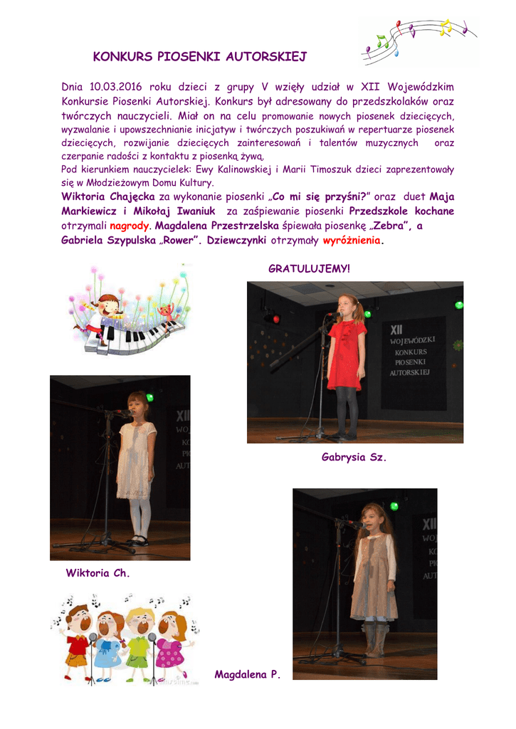 KONKURS PIOSENKI AUTORSKIEJ Dnia 10.03.2016 roku dzieci z grupy V wzięły udział w XII Wojewódzkim Konkursie Piosenki Autorskiej. Konkurs był adresowany do przedszkolaków oraz twórczych nauczycieli. Miał on na celu promowanie nowych piosenek dziecięcych, wyzwalanie i upowszechnianie inicjatyw i twórczych poszukiwań w repertuarze piosenek dziecięcych, rozwijanie dziecięcych zainteresowań i talentów muzycznych oraz czerpanie radości z kontaktu z piosenką żywą. Pod kierunkiem nauczycielek: Ewy Kalinowskiej i Marii Timoszuk dzieci zaprezentowały się w Młodzieżowym Domu Kultury. Wiktoria Chajęcka za wykonanie piosenki „Co mi się przyśni?” oraz duet Maja Markiewicz i Mikołaj Iwaniuk za zaśpiewanie piosenki Przedszkole kochane otrzymali nagrody. Magdalena Przestrzelska śpiewała piosenkę „Zebra”, a Gabriela Szypulska „Rower”. Dziewczynki otrzymały wyróżnienia. GRATULUJEMY! Gabrysia Sz. Wiktoria Ch. Magdalena P. Wręczenie nagrody dla Mai i Mikołaja. Maja M. i Mikołaj I. Dzieci, które otrzymały nagrody. Przedszkolaki wyróżnione w konkursie.
