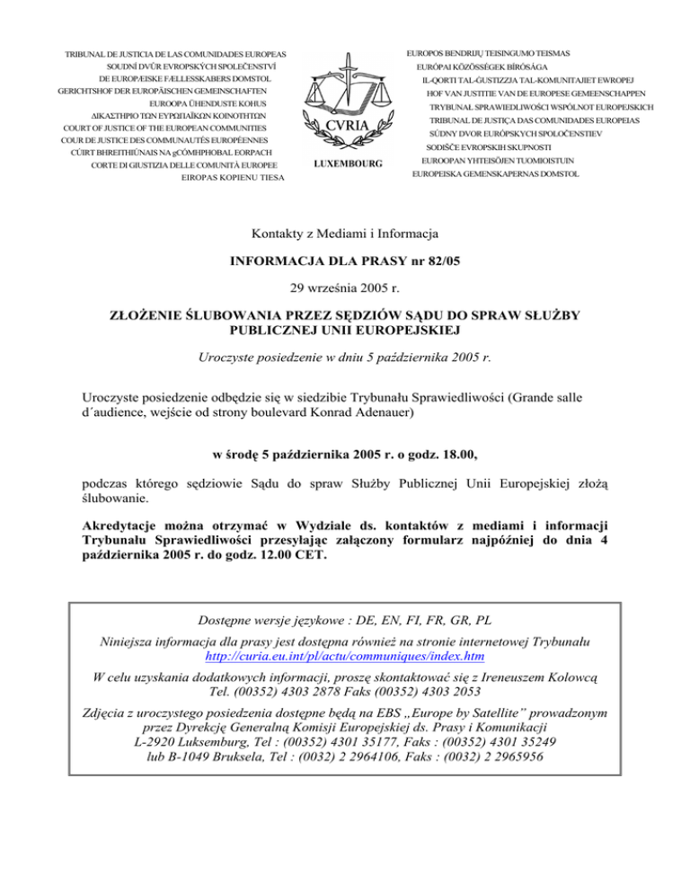 EUROPOS BENDRIJŲ TEISINGUMO TEISMAS TRIBUNAL DE JUSTICIA DE LAS COMUNIDADES EUROPEAS SOUDNÍ DVŮR EVROPSKÝCH SPOLEČENSTVÍ EURÓPAI KÖZÖSSÉGEK BÍRÓSÁGA DE EUROPÆISKE FÆLLESSKABERS DOMSTOL IL-QORTI TAL-ĠUSTIZZJA TAL-KOMUNITAJIET EWROPEJ GERICHTSHOF DER EUROPÄISCHEN GEMEINSCHAFTEN HOF VAN JUSTITIE VAN DE EUROPESE GEMEENSCHAPPEN EUROOPA ÜHENDUSTE KOHUS TRYBUNAŁ SPRAWIEDLIWOŚCI WSPÓLNOT EUROPEJSKICH ∆ΙΚΑΣΤΗΡΙΟ ΤΩΝ ΕΥΡΩΠΑΪΚΩΝ ΚΟΙΝΟΤΗΤΩΝ TRIBUNAL DE JUSTIÇA DAS COMUNIDADES EUROPEIAS COURT OF JUSTICE OF THE EUROPEAN COMMUNITIES SÚDNY DVOR EURÓPSKYCH SPOLOČENSTIEV COUR DE JUSTICE DES COMMUNAUTÉS EUROPÉENNES SODIŠČE EVROPSKIH SKUPNOSTI CÚIRT BHREITHIÚNAIS NA gCÓMHPHOBAL EORPACH EUROOPAN YHTEISÖJEN TUOMIOISTUIN CORTE DI GIUSTIZIA DELLE COMUNITÀ EUROPEE EUROPEISKA GEMENSKAPERNAS DOMSTOL EIROPAS KOPIENU TIESA Kontakty z Mediami i Informacja INFORMACJA DLA PRASY nr 82/05 29 września 2005 r. ZŁOŻENIE ŚLUBOWANIA PRZEZ SĘDZIÓW SĄDU DO SPRAW SŁUŻBY PUBLICZNEJ UNII EUROPEJSKIEJ Uroczyste posiedzenie w dniu 5 października 2005 r. Uroczyste posiedzenie odbędzie się w siedzibie Trybunału Sprawiedliwości (Grande salle d´audience, wejście od strony boulevard Konrad Adenauer) w środę 5 października 2005 r. o godz. 18.00, podczas którego sędziowie Sądu do spraw Służby Publicznej Unii Europejskiej złożą ślubowanie. Akredytacje można otrzymać w Wydziale ds. kontaktów z mediami i informacji Trybunału Sprawiedliwości przesyłając załączony formularz najpóźniej do dnia 4 października 2005 r. do godz. 12.00 CET. Dostępne wersje językowe : DE, EN, FI, FR, GR, PL Niniejsza informacja dla prasy jest dostępna również na stronie internetowej Trybunału http://curia.eu.int/pl/actu/communiques/index.htm W celu uzyskania dodatkowych informacji, proszę skontaktować się z Ireneuszem Kolowcą Tel. (00352) 4303 2878 Faks (00352) 4303 2053 Zdjęcia z uroczystego posiedzenia dostępne będą na EBS „Europe by Satellite” prowadzonym przez Dyrekcję Generalną Komisji Europejskiej ds. Prasy i Komunikacji L-2920 Luksemburg, Tel : (00352) 4301 35177, Faks : (00352) 4301 35249 lub B-1049 Bruksela, Tel : (0032) 2 2964106, Faks : (0032) 2 2965956 INFORMACJE PRAKTYCZNE Zapewniamy Państwu możliwość korzystania z sali dla prasy z wyposażeniem biurowym (telefony: linie analogowe i linie ISDN). Uwaga: • przedstawiciele mediów powinni korzystać z wejścia do budynku Thomas More od strony Boulevard Konrad Adenauer; • publiczność powinna zachować ciszę i pozostać na miejscach do zakończenia rozprawy; • podczas rozprawy zabronione jest korzystanie z telefonów komórkowych i innych urządzeń elektronicznych emitujących sygnały dźwiękowe; • zabronione jest używanie lamp błyskowych i innego dodatkowego oświetlenia; • fotografowie i operatorzy kamer nie mogą się poruszać po sali rozpraw w celu wykonywania zdjęć lub filmowania; • w razie obecności wielu fotografów i operatorów kamer, Wydział ds. kontaktów z mediami i informacji może wyznaczyć dopuszczalną ich liczbę. AKREDYTACJA Akredytację należy przesłać faksem przed godz. 12.00 CET dnia 4 października 2005 r. na numer: (00352) 4303 2500 Dotyczy: Uroczyste posiedzenie w dniu 5 października 2005 r. W celu uzyskania dodatkowych informacji, proszę skontaktować się z sekretariatem Wydziału ds. kontaktów z mediami i informacji Tel: (00 352) 4303 2035 Nazwisko: Organizacja: Rodzaj mediów: Liczba osób: Numer kontaktowy: Tel. : Faks : E-mail : Wniosek o udzielenie zezwolenia na fotografowanie / filmowanie (niepotrzebne skreślić): TAK / NIE W braku odmiennej decyzji Trybunału na dwa dni przed rozprawą, Państwa wniosek zostaje przyjęty.