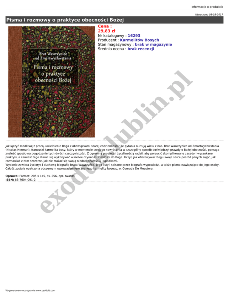 Informacje o produkcie Utworzono 08-03-2017 Pisma i rozmowy o praktyce obecności Bożej Cena : 29,83 zł .lu bl in .p l Nr katalogowy : 16293 Producent : Karmelitów Bosych Stan magazynowy : brak w magazynie Średnia ocena : brak recenzji od us Jak łączyć modlitwę z pracą, uwielbienie Boga z obowiązkami szarej codzienności? Te pytania nurtują wielu z nas. Brat Wawrzyniec od Zmartwychwstania (Nicolas Herman), francuski karmelita bosy, który w momencie swojego nawrócenia w szczególny sposób doświadczył prawdy o Bożej obecności, pomaga znaleźć sposób na pogodzenie tych dwóch rzeczywistości. Z ogromną prostotą i życzliwością radził, aby porzucić skomplikowane zasady i wyszukane praktyki, a zamiast tego starać się wykonywać wszelkie czynności z miłości do Boga. Uczył, jak ofiarowywać Bogu swoje serce pośród pilnych zajęć, jak rozmawiać z Nim szczerze, jak nie zrażać się swoją niedoskonałością i upadkami. Wydanie zawiera życiorys i duchową biografię brata Wawrzyńca, jego listy i spisane przez biografa wypowiedzi, a także pisma nawiązujące do jego osoby. Całość została opatrzona obszernym wprowadzeniem znanego karmelity bosego, o. Conrada De Meestera. ex Oprawa: Format: 205 x 145, ss. 256, opr. twarda ISBN: 83-7604-091-2 Wygenerowano w programie www.oscGold.com