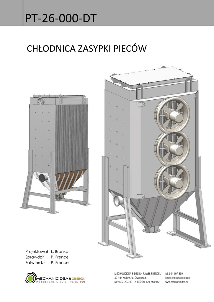 PT-26-000-DT CHŁODNICA ZASYPKI PIECÓW Projektował Ł. Brańka Sprawdził P. Frencel Zatwierdził P. Frencel MECHANICIDEA & DESIGN PAWEŁ FRENCEL 30-434 Kraków, ul. Owocowa 6 NIP: 622-223-90-12, REGON: 121 758 942 tel. 504 107 399 [email protected] www.mechanicidea.pl CHŁODNICA ZASYPKI PIECÓW 21 listopada 2016 Spis treści 1. Podstawa opracowania 3 2. Przedmiot i zakres opracowania 3 3. Lokalizacja 3 4. Opis 3 5. Warunki techniczne wykonania 5 6. Zabezpieczenie antykorozyjne 6 7. Uwagi końcowe 7 8. Spis dokumentacji 7 | MECHANICIDEA & DESIGN, 30-434 KRAKÓW, UL. OWOCOWA 6 2 21 listopada 2016 CHŁODNICA ZASYPKI PIECÓW 1. Podstawa opracowania zlecenie zamawiającego nr: 500-45948491-p.0010 wizja lokalna inwentaryzacja uzgodnienia z użytkownikiem 2. Przedmiot i zakres opracowania Przedmiotem opracowania jest wykonanie dokumentacji technicznej Inwestor: SGL CARBON POLSKA S.A Ul. Węgierska 188 33-300 Nowy Sącz Zakres prac obejmuje: Opracowanie dokumentacji odtworzeniowej na podstawie istniejącej chłodnicy zasypki pieców 3. Lokalizacja SGL CARBON POLSKA S.A Ul. Węgierska 188 33-300 Nowy Sącz 4. Opis Urządzenie, którego dokumentacja została otworzona to chłodnica zasypki pieców, która służy do schładzania spalin z pieców. Całość chłodnicy wykonana jako konstrukcja stalowa, wyposażona w trzy wentylatory wymuszające przepływ powietrza przez radiator. Nad radiatorem przyspawany dach chłodnicy wraz z pokrywą rewizyjną oraz króćcem wlotowym spalin. Pod radiatorem przyspawany jest Lej wyposażony w trzy króćce z czego jeden boczny w zależności od konfiguracji jest zaślepiony, drugi pełni funkcję wylotu spalin, trzeci na spodzie leja odprowadza wytrącony ze spalin pył. Całość przyspawana do konstrukcji wsporczej. | MECHANICIDEA & DESIGN, 30-434 KRAKÓW, UL. OWOCOWA 6 3 CHŁODNICA ZASYPKI PIECÓW 21 listopada 2016 Pokrywa rewizyjna Wlot Spalin Dach chłodnicy Radiator Dysza wentylatorowa Wentylator Lej stożkowy Wylot Spalin Zaślepka Konstrukcja wsporcza Odprowadzenie pyłu Rys. 1 Budowa chłodnicy | MECHANICIDEA & DESIGN, 30-434 KRAKÓW, UL. OWOCOWA 6 4 21 listopada 2016 CHŁODNICA ZASYPKI PIECÓW 5. Warunki techniczne wykonania Poszczególne zespoły wykonać zgodnie z dokumentacją. Warunki techniczne wykonania i montażu poszczególnych elementów zostały podane na rysunkach wykonawczych i zestawieniowych, a elementy zakupowe zgodnie z dokumentacją producenta. Odstępstwa od gatunków materiałów, wymiarów, tolerancji, klas chropowatości powierzchni należy dokonywać w porozumieniu z projektantem. Po wykonaniu poszczególnych elementów wg załączonej dokumentacji należy sprawdzić, jakość wykonania połączeń spawanych oraz skręcanych. Po wykonanych pracach przeprowadzić szczegółowe oględziny i wszelkie ubytki w powłoce antykorozyjnej uzupełnić wg zaleceń producenta farb. Spoiny Wszystkie spoiny pachwinowe należy wykonać 0,7 grubości cieńszego łączonych elementów a czołowe na grubość przekroju. Poziom wymagań dla systemu jakości – standardowy wg PN-EN ISO 3834-3:2007. Poziom jakości według niezgodności spawalniczych występujących w złączach spawanych – C: według PN-EN ISO 5817:2009. Złącza spawane i przyległe do nich strefy powinny być wolne od wszelakich wad powierzchniowych i wewnętrznych, obniżających bezpieczeństwo. Złącza spawane powinny mieć własności co najmniej takie jak minimalne własności wymagane dla materiałów łączonych, o ile w projektowej dokumentacji technicznej nie określono innych własności. Połączenia na śruby Nakrętka i łeb śruby powinny bezpośrednio lub przez podkładkę dokładnie przylegać do łączonych powierzchni (ewentualne nierówności wyrównać). Sprawdzić i oczyścić śruby, nakrętki i podkładki. Nasmarować gwinty śrub i powierzchnie kontaktowe nakrętek. Jeżeli w dokumentacji nie zostało podane inaczej, należy zastosować pastę molibdenową. Śruby winny być dociągnięte odpowiednimi narzędziami, z dopuszczonym momentem podanym w dokumentacji technicznej. w przypadku, gdy nie jest on podany, należy śruby dokręcać momentem powszechnie praktykowanym przez firmy montażowe. Wszystkie typy uszczelek po ściśnięciu ulegają relaksacji (rozluźnieniu) i w skutek tego efektu zachodzi konieczność ponownego dokręcenia śrub po ok. 24h. Śruba w otworze nie powinna przesuwać się ani drgać przy obstukiwaniu młotkiem kontrolnym. | MECHANICIDEA & DESIGN, 30-434 KRAKÓW, UL. OWOCOWA 6 5 21 listopada 2016 CHŁODNICA ZASYPKI PIECÓW 6. Zabezpieczenie antykorozyjne ZESTAW MALARSKI EP-PUR 9 /1/2003/W Epoksydowo-poliuretanowy ISO 12944-5/S2.15/S3.16/S9.10 Dopuszcza się zastosowanie równoważnego zestawu malarskiego. Krótka charakterystyka: Zestaw farb złożony z dwuskładnikowej farby epoksydowej EPIRUST stanowiącej warstwę podkładową oraz emalii nawierzchniowej poliuretanowej EMAPUR tworzy powłoki dobrze przyczepne do podłoża stalowego, stalowego ocynkowanego i aluminiowego jest elastyczny, o wysokiej wytrzymałości mechanicznej. Powłoki odporne na działanie agresywnych czynników atmosferycznych oraz promieniowania UV. Przeznaczenie: Do antykorozyjnego zabezpieczenia zewnętrznego powierzchni stalowych, stalowych ocynkowanych i aluminiowych. Zestaw może być stosowany jako zestaw renowacyjny. Temperatura stosowania: Dla farby EMAPUR: podłoża - min -5oC (podłoże wolne od lodu i szronu) oraz temperatura podłoża co najmniej 3oC wyższa od temperatury punktu rosy. Dla farby EPIRUST: podłoża - min +5oC oraz temperatura podłoża co najmniej 3oC wyższa od temperatury punktu rosy. Przygotowanie podłoża: powierzchnia stalowa oczyszczona do stopnia czystości co najmniej Sa2/St3 wg PN-ISO 8501-1, sucha, odtłuszczona, pozbawiona soli i kurzu. Uwagi technologiczne: | MECHANICIDEA & DESIGN, 30-434 KRAKÓW, UL. OWOCOWA 6 6 CHŁODNICA ZASYPKI PIECÓW 21 listopada 2016 Po kolejnych warstwach przeciwkorozyjnych (EPIRUST) mal