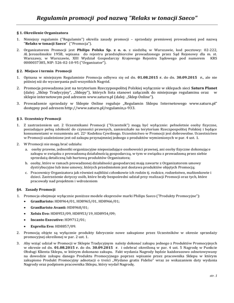 Regulamin promocji pod nazwą "Relaks w tonacji Saeco"