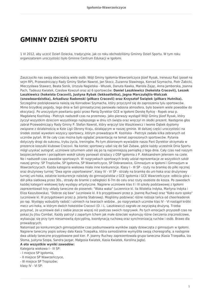 Igołomia-Wawrzeńczyce GMINNY DZIEŃ SPORTU 1 VI 2012, aby uczcić Dzień Dziecka, tradycyjnie, jak co roku obchodziliśmy Gminny Dzień Sportu. W tym roku organizatorem uroczystości było Gminne Centrum Edukacji w Igołomi. Zaszczyciło nas swoją obecnością wiele osób: Wójt Gminy Igołomia-Wawrzeńczyce Józef Rysak, Ireneusz Raś (poseł na sejm RP), Przewodniczący Rady Gminy Stefan Nawrot, Jan Skocz, Zuzanna Stawinoga, Konrad Szymacha, Piotr Żabicki, Mieczysława Stawarz, Beata Sonik, Urszula Nagielska - Włusek, Danuta Kawka, Mariola Zając, Anna Jamborska, Joanna Pach, Tadeusz Kwiatek, Czesław Kowzuń oraz aż 6 sportowców: Daniel Laszkiewicz (hokeista Cracovii), Leszek Laszkiewicz (hokeista Cracovii), Justyna Rybak (lekkoatletka), Jagna Marczułajtis-Walczak (snowboardzistka), Arkadiusz Radomski (piłkarz Cracovii) oraz Krzysztof Świątek (piłkarz Hutnika). Szczególne podziękowania należą się Konradowi Szymacha, który przyczynił się do zaproszenia tylu sportowców. Mimo brzydkiej pogody, tego dnia w Sali gimnastycznej panowała radosna atmosfera, było bowiem wiele powodów do ekscytacji. Po uroczystym powitaniu gości przez Panią Dyrektor GCE w Igołomi Dorotę Ryńcę - Ropek oraz p. Magdalenę Kozińską - Pietrzyk nadszedł czas na przemowy. Jako pierwszy wystąpił Wójt Gminy Józef Rysak, który życzył wszystkim dzieciom wszystkiego najlepszego w dniu ich święta oraz wręczył im słodki prezent. Następnie głos zabrał Przewodniczący Rady Gminy P. Stefan Nawrot, który wręczył Izie Waszkiewicz i Iwonie Dąbek dyplomy związane z działalnością w Kole Ligii Obrony Kraju, działającym w naszej gminie. W dalszej części uroczystości na środek zostali wywołani wszyscy sportowcy, którym prowadząca M. Kozińska - Pietrzyk zadała kilka zebranych od uczniów pytań. W tle cały czas można było oglądać prezentację na temat zaproszonych sportowców. Pytania dotyczyły drogi do sukcesu, trybu życia, treningów. Po tym zbiorowym wywiadzie nasza Pani Dyrektor otrzymała w prezencie koszulki klubowe Cracovii. Na koniec sportowcy udali się do Sali Zabaw, gdzie każdy uczestnik Dnia Sportu mógł uzyskać autograf, uczniowie szturmem udali się po tą najcenniejszą pamiątkę z tego dnia. Cały czas nad naszym bezpieczeństwem i porządkiem wokół szkoły panowali strażacy z OSP Igołomia z P. Aleksandrem Jeleniem na czele. No i nadszedł czas zawodów sportowych. W rozgrywkach sportowych brały udział reprezentacje ze wszystkich szkół naszej gminy: SP Tropiszów, SP Igołomia, SP Wawrzeńczyce, SP Dobranowice, Gimnazjum w Igołomi i Gimnazjum w Wawrzeńczycach. Każda kategoria wiekowa miała inne konkurencje. Klasy I - III SP - rzuty na bramkę do piłki ręcznej oraz drużynowy turniej "Dwa ognie usportowione", klasy IV - VI SP - strzały na bramkę do uni-hoka oraz drużynowy turniej uni-hoka, ostatnie konkurencje należały do gimnazjalistów z GCE Igołomia i GCE Wawrzeńczyce: odbicia góra dół piłka siatkową przez 30s., strzały do bramki z odległości 6-7m do celu oraz rzuty osobiste do kosza. Po zawodach każdej kategorii wiekowej były występy artystyczne. Najpierw uczniowie klas II i III szkoły podstawowej z Igołomi zaprezentowali trzy układy taneczne do piosenek: "Waka waka" (uczennice kl. IIa Wioletta Indyka, Martyna Indyka i Eliza Kaszubowska), "Dobrze się baw" (uczniowie kl. II b przygotowani przez p. Joannę Ruchwę) oraz "Koko euro spoko" (uczniowie kl. III przygotowani przez p. Jolantę Stabrawę). Mogliśmy podziwiać różne rodzaje tańca od cheerleaderek po rap. Występy wzbudziły radość i uśmiech na twarzach widzów., po rozgrywkach uczniów klas IV - VI nastąpił krótki mecz uni-hoka, w którym dwóch hokeistów Cracovii (D. i L. Laszkiewicz) zagrało ze zwycięską drużyną. Trzeba przyznać, że uczniowie dali z siebie jeszcze więcej niż podczas swoich rozgrywek. Po tych emocjach przyszedł czas na pokaz Jiu Jitsu Combat. Każdy patrzył z zapartym tchem jak małe dzieciaki wykonują różne ćwiczenia zręcznościowe, wykazując się przy tym niesamowitą dyscypliną, koordynacją ruchową oraz synchronizacją ruchów i osób. Brawo dla prowadzących. Natomiast po konkurencjach gimnazjalistów czas podsumowania wyników zajęły dziewczęta z gimnazjum w Igołomi. Najpierw taneczny popis solowy dała Kasia Trzepałka, która samodzielnie wymyśliła swoją choreografię, a następnie dwa układy taneczne przygotowane pod kier. P. Joanny Ruchwy zaprezentowała grupa taneczna (Kasia Trzepałka, Iza Słoma, Justyna Szopa, Sandra Jazgar, Małgosia Kwiatek, Kasia Kwiatek, Karolina Jagła). A oto wszystkie wyniki zawodów: Kategoria wiekowa I - III SP: - I miejsce SP Igołomia, - II miejsce SP Wawrzeńczyce, - III miejsce SP Tropiszów; klasy IV - VI SP: 1 Igołomia-Wawrzeńczyce - I miejsce SP Tropiszów, - II miejsce SP Wawrzeńczyce, - III miejsce SP Igołomia; Gimnazjum (wszystkie nagrody zgarnęli uczniowie z Wawrzeńczyc): - I miejsce K. Duda/Ł. Głowa, - II miejsce A. Maziarz/M. Gałuszka, - III miejsce A. Wilk/K. Giemza Wszyscy zawodnicy mogli zrobić pamiątkowe zdjęcia ze sportowcami, myślę, że każdy dobrze się bawił tego dnia. Na koniec trzeba dodać, że wiele osób było zaangażowane w organizację tego święta: - Katarzyna Lenczewska - Nowak i Katarzyna Kazanowska - koordynacja - Magdalena Kozińska - Pietrzyk - prowadzenie - Klaudia Latała, Krzysztof Zawadzki, Piotr Kurcap - przygotowanie i prowadzenie konkurencji sportowych - Agata Ramza - przygotowanie zaproszeń i dyplomów - Joanna Ruchwa i Jolanta Stabrawa - oprawa artystyczna - Oraz wielu innych zaangażowanych przy wypisywaniu dyplomów (Małgorzata Igielska), rozdawaniu wody i słodyczy dla zawodników (s. Elżbieta Stopa i Małgorzata Szwajda) oraz przygotowaniu pomieszczeń. Wszystkim bardzo dziękujemy za pomoc. Joanna Ruchwa 2