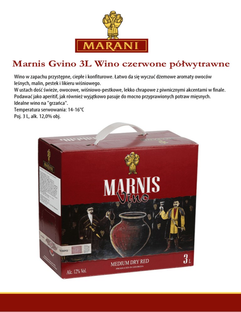 Marnis Gvino 3L Wino czerwone półwytrawne Wino w zapachu przystępne, ciepłe i konfiturowe. Łatwo da się wyczuć dżemowe aromaty owoców leśnych, malin, pestek i likieru wiśniowego. W ustach dość świeże, owocowe, wiśniowo-pestkowe, lekko chrapowe z piwnicznymi akcentami w finale. Podawać jako aperitif, jak również wyjątkowo pasuje do mocno przyprawionych potraw mięsnych. Idealne wino na "grzańca". Temperatura serwowania: 14-16°C Poj. 3 L, alk. 12,0% obj.