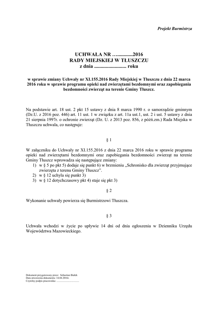 Projekt Burmistrza UCHWAŁA NR …............2016 RADY MIEJSKIEJ W TŁUSZCZU z dnia ......................... roku w sprawie zmiany Uchwały nr XI.155.2016 Rady Miejskiej w Tłuszczu z dnia 22 marca 2016 roku w sprawie programu opieki nad zwierzętami bezdomnymi oraz zapobiegania bezdomności zwierząt na terenie Gminy Tłuszcz. Na podstawie art. 18 ust. 2 pkt 15 ustawy z dnia 8 marca 1990 r. o samorządzie gminnym (Dz.U. z 2016 poz. 446) art. 11 ust. 1 w związku z art. 11a ust.1, ust. 2 i ust. 5 ustawy z dnia 21 sierpnia 1997r. o ochronie zwierząt (Dz. U. z 2013 poz. 856, z póżń.zm.) Rada Miejska w Tłuszczu uchwala, co następuje: §1 W załączniku do Uchwały nr XI.155.2016 z dnia 22 marca 2016 roku w sprawie programu opieki nad zwierzętami bezdomnymi oraz zapobiegania bezdomności zwierząt na terenie Gminy Tłuszcz wprowadza się następujące zmiany: 1) w § 5 po pkt 5) dodaje się punkt 6) w brzmieniu „Schronisko dla zwierząt przyjmujące zwierzęta z terenu Gminy Tłuszcz”. 2) w § 12 uchyla się punkt 3) 3) w § 12 dotychczasowy pkt 4) staje się pkt 3) §2 Wykonanie uchwały powierza się Burmistrzowi Tłuszcza. §3 Uchwała wchodzi w życie po upływie 14 dni od dnia ogłoszenia w Dzienniku Urzędu Województwa Mazowieckiego. Dokument przygotowany przez: Sebastian Białek Data utworzenia dokumentu: 14.04.2016r. Czytelny podpis pracownika: ................................... Uzasadnienie do Uchwały Nr ................. 2016 Rady Miejskiej w Tłuszczu z dnia ..........................2016r. w sprawie zmiany Uchwały nr XI.155.2016 Rady Miejskiej w Tłuszczu z dnia 22 marca 2016 roku w sprawie programu opieki nad zwierzętami bezdomnymi oraz zapobiegania bezdomności zwierząt na terenie Gminy Tłuszcz. Po analizie prawnej Uchwały nr XI.155.2016 przez Oddział Nadzoru Prawnego nad Organami Samorządów z Mazowieckiego Urzędu Wojewódzkiego w Warszawie wskazano o konieczności wprowadzenia poniższych zmian. W załączniku do Uchwały nr XI.155.2016 z dnia 22 marca 2016 roku w sprawie programu opieki nad zwierzętami bezdomnymi oraz zapobiegania bezdomności zwierząt na terenie Gminy Tłuszcz wprowadza się następujące zmiany: 1) w § 5 po pkt 5) dodaje się punkt 6) w brzmieniu „Schronisko dla zwierząt przyjmujące zwierzęta z terenu Gminy Tłuszcz”. 2) w § 12 uchyla się punkt 3) 3) w § 12 dotychczasowy pkt 4) staje się pkt 3)