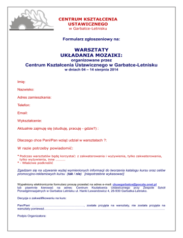 CENTRUM KSZTAŁCENIA USTAWICZNEGO w Garbatce-Letnisku Formularz zgłoszeniowy na: WARSZTATY UKŁADANIA MOZAIKI: organizowane przez Centrum Kształcenia Ustawicznego w Garbatce-Letnisku w dniach 04 – 14 sierpnia 2014 Imię: Nazwisko: Adres zamieszkania: Telefon: Email: Wykształcenie: Aktualnie zajmuję się (studiuję, pracuję - gdzie?) : Dlaczego chce Pani/Pan wziąć udział w warsztatach ?: W razie potrzeby powiadomić: Podczas warsztatów będę korzystać: z zakwaterowania i wyżywienia, tylko zakwaterowania, tylko wyżywienia, inne ……….. - Właściwe podkreślić Zgadzam się na używanie wyżej wymienionych informacji do tworzenia katalogu kursu oraz celów promocyjno-reklamowych kursu (tak / nie) [niepotrzebne wykasować] Wypełniony elektronicznie formularz proszę przesłać na adres e-mail: [email protected] lub pisemnie kierować na adres: Centrum Kształcenia Ustawicznego przy Zespole Szkół Ponadgimnazjalnych w Garbatce Letnisku ul. Hanki Lewandowicz 4, 26-930 Garbatka-Letnisko. Decyzja o zakwalifikowaniu na kurs: Pan/Pani ……………………………………………, została przyjęta na warsztaty, nie została przyjęta na warsztaty ponieważ………………………………………………………………………………………………………. Podpis Organizatora: