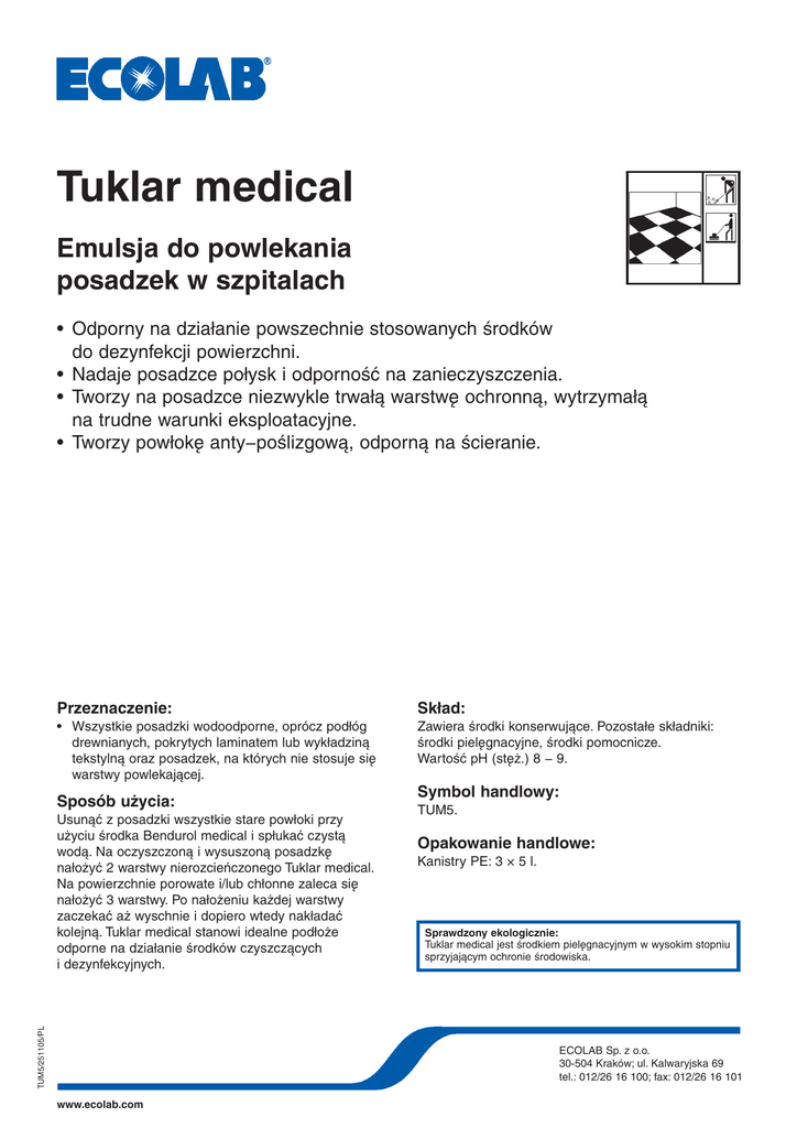 Tuklar medical Emulsja do powlekania posadzek w szpitalach • Odporny na działanie powszechnie stosowanych środków do dezynfekcji powierzchni. • Nadaje posadzce połysk i odporność na zanieczyszczenia. • Tworzy na posadzce niezwykle trwałą warstwę ochronną, wytrzymałą na trudne warunki eksploatacyjne. • Tworzy powłokę anty−poślizgową, odporną na ścieranie. Przeznaczenie: Skład: • Wszystkie posadzki wodoodporne, oprócz podłóg drewnianych, pokrytych laminatem lub wykładziną tekstylną oraz posadzek, na których nie stosuje się warstwy powlekającej. Zawiera środki konserwujące. Pozostałe składniki: środki pielęgnacyjne, środki pomocnicze. Wartość pH (stęż.) 8 − 9. Sposób użycia: TUM5/251105/PL Usunąć z posadzki wszystkie stare powłoki przy użyciu środka Bendurol medical i spłukać czystą wodą. Na oczyszczoną i wysuszoną posadzkę nałożyć 2 warstwy nierozcieńczonego Tuklar medical. Na powierzchnie porowate i/lub chłonne zaleca się nałożyć 3 warstwy. Po nałożeniu każdej warstwy zaczekać aż wyschnie i dopiero wtedy nakładać kolejną. Tuklar medical stanowi idealne podłoże odporne na działanie środków czyszczących i dezynfekcyjnych. Symbol handlowy: TUM5. Opakowanie handlowe: Kanistry PE: 3 × 5 l. Sprawdzony ekologicznie: Tuklar medical jest środkiem pielęgnacyjnym w wysokim stopniu sprzyjającym ochronie środowiska. ECOLAB Sp. z o.o. 30-504 Kraków; ul. Kalwaryjska 69 tel.: 012/26 16 100; fax: 012/26 16 101 www.ecolab.com