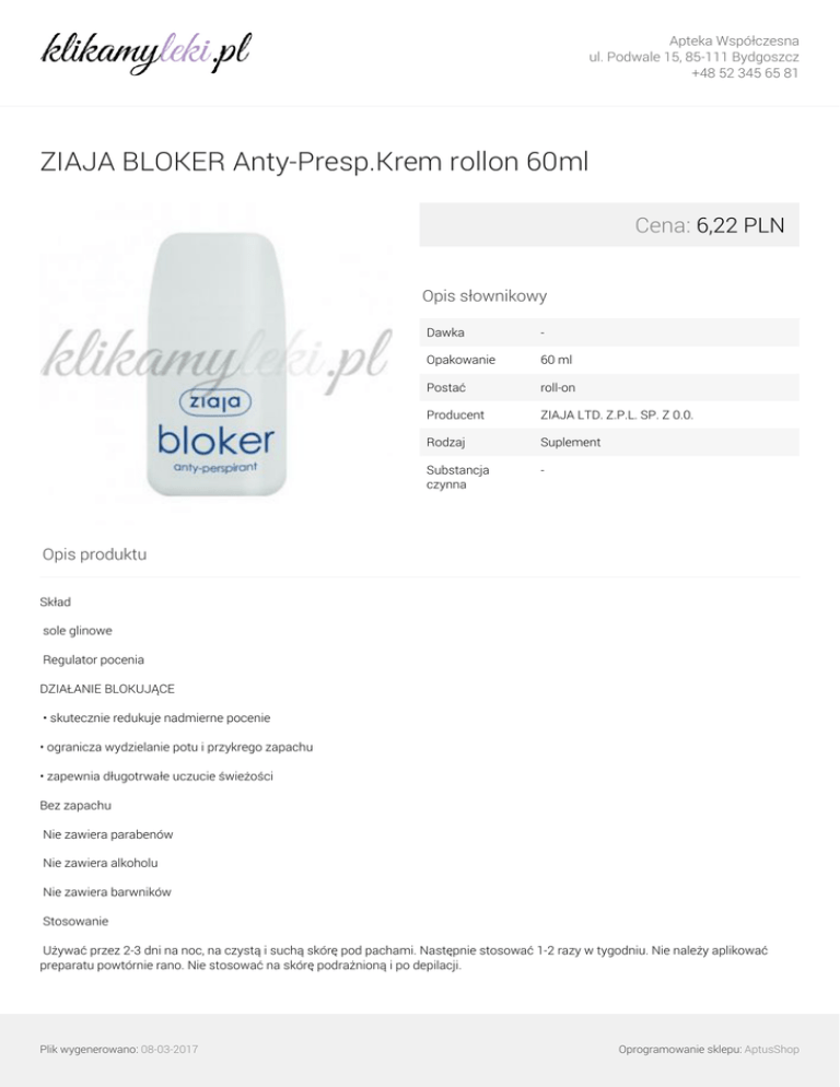 Apteka Współczesna ul. Podwale 15, 85-111 Bydgoszcz +48 52 345 65 81 ZIAJA BLOKER Anty-Presp.Krem rollon 60ml Cena: 6,22 PLN Opis słownikowy Dawka - Opakowanie 60 ml Postać roll-on Producent ZIAJA LTD. Z.P.L. SP. Z 0.0. Rodzaj Suplement Substancja czynna - Opis produktu Skład sole glinowe Regulator pocenia DZIAŁANIE BLOKUJĄCE • skutecznie redukuje nadmierne pocenie • ogranicza wydzielanie potu i przykrego zapachu • zapewnia długotrwałe uczucie świeżości Bez zapachu Nie zawiera parabenów Nie zawiera alkoholu Nie zawiera barwników Stosowanie Używać przez 2-3 dni na noc, na czystą i suchą skórę pod pachami. Następnie stosować 1-2 razy w tygodniu. Nie należy aplikować preparatu powtórnie rano. Nie stosować na skórę podrażnioną i po depilacji. Plik wygenerowano: 08-03-2017 Oprogramowanie sklepu: AptusShop Apteka Współczesna ul. Podwale 15, 85-111 Bydgoszcz +48 52 345 65 81 PREPARAT TESTOWANY DERMATOLOGICZNIE I ALERGOLOGICZNIE . Plik wygenerowano: 08-03-2017 Powered by TCPDF (www.tcpdf.org) Oprogramowanie sklepu: AptusShop