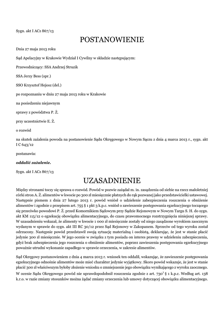 Sygn. akt I ACz 867/13 POSTANOWIENIE Dnia 27 maja 2013 roku Sąd Apelacyjny w Krakowie Wydział I Cywilny w składzie następującym: Przewodniczący: SSA Andrzej Struzik SSA Jerzy Bess (spr.) SSO Krzysztof Hejosz (del.) po rozpoznaniu w dniu 27 maja 2013 roku w Krakowie na posiedzeniu niejawnym sprawy z powództwa P. Ż. przy uczestnictwie E. Ż. o rozwód na skutek zażalenia powoda na postanowienie Sądu Okręgowego w Nowym Sączu z dnia 4 marca 2013 r., sygn. akt I C 643/12 postanawia: oddalić zażalenie. Sygn. akt I ACz 867/13 UZASADNIENIE Między stronami toczy się sprawa o rozwód. Powód w pozwie zażądał m. in. zasądzenia od siebie na rzecz małoletniej córki stron A. Ż. alimentów w kwocie po 300 zł miesięcznie płatnych do rąk pozwanej jako przedstawicielki ustawowej. Następnie pismem z dnia 27 lutego 2013 r. powód wniósł o udzielenie zabezpieczenia roszczenia o obniżenie alimentów i zgodnie z przepisem art. 755 § 1 pkt 3 k.p.c. wniósł o zawieszenie postępowania egzekucyjnego toczącego się przeciwko powodowi P. Ż. przed Komornikiem Sądowym przy Sądzie Rejonowym w Nowym Targu S. H. do sygn. akt KM 115/12 o egzekucję obowiązku alimentacyjnego, do czasu prawomocnego rozstrzygnięcia niniejszej sprawy. W uzasadnieniu wskazał, że alimenty w kwocie 1 000 zł miesięcznie zostały od niego zasądzone wyrokiem zaocznym wydanym w sprawie do sygn. akt III RC 30/12 przez Sąd Rejonowy w Zakopanem. Sprzeciw od tego wyroku został odrzucony. Następnie powód przedstawił swoją sytuację materialną i osobistą, deklarując, że jest w stanie płacić jedynie 300 zł miesięcznie. W jego ocenie w związku z tym posiada on interes prawny w udzieleniu zabezpieczenia, gdyż brak zabezpieczenia jego roszczenia o obniżenie alimentów, poprzez zawieszenia postępowania egzekucyjnego poważnie utrudni wykonanie zapadłego w sprawie orzeczenia, w zakresie alimentów. Sąd Okręgowy postanowieniem z dnia 4 marca 2013 r. wniosek ten oddalił, wskazując, że zawieszenie postępowania egzekucyjnego odnośnie alimentów może mieć charakter jedynie wyjątkowy. Skoro powód wskazuje, że jest w stanie płacić 300 zł właściwszym byłoby złożenie wniosku o zmniejszenie jego obowiązku wynikającego z wyroku zaocznego. W ocenie Sądu Okręgowego powód nie uprawdopodobnił roszczenia zgodnie z art. 7301 § 1 k.p.c. Według art. 138 k.r.o. w razie zmiany stosunków można żądać zmiany orzeczenia lub umowy dotyczącej obowiązku alimentacyjnego. Powód sam we wniosku o udzielenie zabezpieczenia przyznaje, że do zmiany stosunków nie doszło, gdyż w sprawie III RC 30/12 Sąd nie badał jego sytuacji finansowej. Zażalenie na to postanowienie złożył powód, zaskarżając je w całości i wnosząc o jego zmianę przez uwzględnienie wniosku i zasądzenie kosztów według norm przepisanych. Postanowieniu zarzucił naruszenie przepisów art. 7301 § 1 k.p.c. w zw. z art. 138 k.r.o. poprzez ich niewłaściwe zastosowanie i przyjęcie, że powód nie uprawdopodobnił roszczenia, a także poprzez przyjęcie, że nie doszło do zmiany stosunków, aby można było żądać zmiany orzeczenia lub umowy dotyczącej obowiązku alimentacyjnego. W uzasadnieniu wskazał, że doszło do zmiany sytuacji, gdyż ta jest inna niż wzięta pod uwagę przez Sąd Rejonowy w Zakopanem przy wydawaniu wyroku. Po raz kolejny powód opisał swoją sytuację materialną. Sąd Apelacyjny zważył, co następuje: Zażalenie jest bezzasadne i nie zasługuje na uwzględnienie. Stosownie do treści art. 730 § 1 k.p.c. w każdej sprawie cywilnej podlegającej rozpoznaniu przez sąd lub sąd polubowny można żądać udzielenia zabezpieczenia. Zgodnie z § 2 tego przepisu sąd może udzielić zabezpieczenia przed wszczęciem postępowania lub w jego toku. Po uzyskaniu przez uprawnionego tytułu wykonawczego dopuszczalne jest udzielenie zabezpieczenia tylko wtedy, jeżeli ma ono na celu zabezpieczenie roszczenia o świadczenie, którego termin spełnienia jeszcze nie nastąpił. Jak z tego wynika, wstępnym warunkiem zasadności wniosku o zabezpieczenie, pierwotnym wobec przesłanek określonych w art. 7301 k.p.c., jest samo dochodzenie roszczenia. Tymczasem w przedmiotowej sprawie brak jak dotychczas roszczenia, które mogłoby zostać zabezpieczone przez zawieszenie postępowania egzekucyjnego. Powód zgłosił w pozwie i podtrzymuje na obecnym etapie żądanie, by w wyroku rozwodowym orzec alimenty na rzecz córki w kwocie 300 zł – po ujawnieniu wyroku Sądu Rejonowego w Zakopanem, sygn. akt III RC 30/12 wnosząc o orzeczenie tych alimentów w miejsce zasądzonych w tamtym wyroku. Orzeczenie takie ze swej istoty będzie określało wysokość alimentów po uprawomocnieniu się wyroku rozwodowego, nie może natomiast działać wstecz i określać alimentów z mocą wsteczną, za okres trwania sprawy rozwodowej. Tymczasem powód we wniosku domagał się zabezpieczenia tego roszczenia poprzez zawieszenie postępowania egzekucyjnego do czasu zakończenia sprawy o rozwód. Wskazany sposób zabezpieczenia jest całkowicie nieadekwatny do zgłoszonego roszczenia, gdyż odnosi się do okresu, w którym alimenty będą obowiązywały w dotychczasowej wysokości niezależnie od treści wyroku rozwodowego i ewentualnego uwzględnienia żądania zgłoszonego w pozwie przez powoda. Nie można zatem twierdzić, by brak takiego zabezpieczenia uniemożliwił lub poważnie utrudnił wykonanie zapadłego w sprawie orzeczenia lub w inny sposób uniemożliwił lub poważnie utrudnił osiągnięcie celu postępowania w sprawie. Zgłoszony we wniosku sposób zabezpieczenia można by rozważyć, jeśli powód zgłosiłby wniosek o uregulowanie obowiązku alimentacyjnego na etapie sprawy rozwodowej, zgodnie z art. 445 k.p.c., np. poprzez zmniejszenie wysokości obowiązku alimentacyjnego. Rozstrzygnięcie takiego wniosku zgodne z żądaniem powoda mogłoby wywierać skutek za czas od chwili jego zgłoszenia, zatem ni