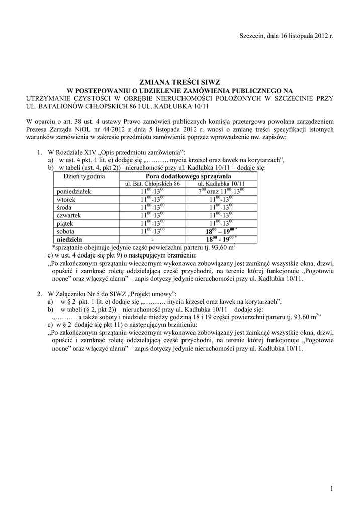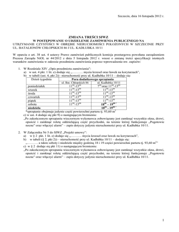 Szczecin, dnia 16 listopada 2012 r. ZMIANA TREŚCI SIWZ W POSTĘPOWANIU O UDZIELENIE ZAMÓWIENIA PUBLICZNEGO NA UTRZYMANIE CZYSTOŚCI W OBRĘBIE NIERUCHOMOŚCI POŁOŻONYCH W SZCZECINIE PRZY UL. BATALIONÓW CHŁOPSKICH 86 I UL. KADŁUBKA 10/11 W oparciu o art. 38 ust. 4 ustawy Prawo zamówień publicznych komisja przetargowa powołana zarządzeniem Prezesa Zarządu NiOL nr 44/2012 z dnia 5 listopada 2012 r. wnosi o zmianę treści specyfikacji istotnych warunków zamówienia w zakresie przedmiotu zamówienia poprzez wprowadzenie nw. zapisów: 1. W Rozdziale XIV „Opis przedmiotu zamówienia”: a) w ust. 4 pkt. 1 lit. e) dodaje się „………. mycia krzeseł oraz ławek na korytarzach”, b) w tabeli (ust. 4, pkt 2)) –nieruchomość przy ul. Kadłubka 10/11 – dodaje się: Dzień tygodnia Pora dodatkowego sprzątania ul. Bat. Chłopskich 86 00 ul. Kadłubka 10/11 00 poniedziałek 11 -13 700 oraz 1100-1300 wtorek 1100-1300 1100-1300 00 00 środa 11 -13 1100-1300 00 00 czwartek 11 -13 1100-1300 piątek 1100-1300 1100-1300 00 00 sobota 11 -13 1800 – 1900 * niedziela 1800 - 1900 * *sprzątanie obejmuje jedynie część powierzchni parteru tj. 93,60 m2 c) w ust. 4 dodaje się pkt 9) o następującym brzmieniu: „Po zakończonym sprzątaniu wieczornym wykonawca zobowiązany jest zamknąć wszystkie okna, drzwi, opuścić i zamknąć roletę oddzielającą część przychodni, na terenie której funkcjonuje „Pogotowie nocne” oraz włączyć alarm” – zapis dotyczy jedynie nieruchomości przy ul. Kadłubka 10/11. 2. W Załączniku Nr 5 do SIWZ „Projekt umowy”: a) w § 2 pkt. 1 lit. e) dodaje się „………. mycia krzeseł oraz ławek na korytarzach”, b) w tabeli (§ 2, pkt 2)) – nieruchomość przy ul. Kadłubka 10/11 – dodaje się: „………. a także soboty i niedziele między godziną 18 i 19 części powierzchni parteru tj. 93,60 m2” c) w § 2 dodaje się pkt 11) o następującym brzmieniu: „Po zakończonym sprzątaniu wieczornym wykonawca zobowiązany jest zamknąć wszystkie okna, drzwi, opuścić i zamknąć roletę oddzielającą część przychodni, na terenie której funkcjonuje „Pogotowie nocne” oraz włączyć alarm” – zapis dotyczy jedynie nieruchomości przy ul. Kadłubka 10/11. 1