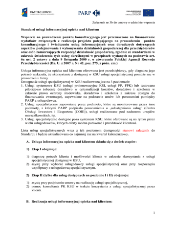 Załącznik nr 3b do umowy o udzielnie wsparcia Standard usługi informacyjnej opieka nad klientem Wsparcie na prowadzenie punktu konsultacyjnego jest przeznaczone na finansowanie wydatków związanych z realizacja projektu polegającego na prowadzeniu punktu konsultacyjnego i świadczeniu usług informacyjnych oraz doradczych dotyczących aspektów podejmowania i wykonywania działalności gospodarczej dla przedsiębiorców oraz osób zamierzających rozpocząć działalność gospodarczą, zgodnie ze standardami w zakresie świadczenia tych usług określonymi w przepisach wydanych na podstawie art. 6a ust. 2 ustawy z dnia 9 listopada 2000 r. o utworzeniu Polskiej Agencji Rozwoju Przedsiębiorczości (Dz. U. z 2007 r. Nr 42, poz. 275, z późn. zm.) Usługa informacyjna opieka nad klientem oferowana jest przedsiębiorcy, gdy diagnoza jego potrzeb wykazała, że skorzystanie z dostępnej w KSU usługi specjalistycznej pomoże mu w prowadzeniu firmy. Dostępność usługi specjalistycznej w KSU realizowana jest na 3 poziomach: 1. Usługi systemowe KSU (usługi proinnowacyjne KSI, usługi FP, FPK) lub testowane pilotażowo (obecnie doradztwo w optymalizacji kosztów, doradztwo i szkolenia w zakresie prawa ochrony środowiska, doradztwo i szkolenia z zakresu dostępu do finansowania zwrotnego), zapewniane na podstawie umów lub porozumień pomiędzy PARP a usługodawcą. 2. Usługi specjalistyczne zapewniane przez podmioty, które są monitorowane przez inne podmioty, z którymi PARP podpisała porozumienia o „udostępnianiu usług” (Centra Obsługi Inwestora i Eksportera (COIE)), usługi realizowane pod nadzorem urzędów marszałkowskich, itp. 3. Usługi specjalistyczne dostępne poza systemem KSU, które oferowane są na rynku przez wielu usługodawców, których oferty można porównać i przedstawić klientowi. Lista usług specjalistycznych wraz z ich poziomem dostępności stanowi załącznik do Standardu i będzie aktualizowana co najmniej raz na kwartał kalendarzowy. A. Usługa informacyjna opieka nad klientem składa się z dwóch etapów: 1) Etap I obejmuje: 1) diagnozę potrzeb klienta i możliwości klienta w zakresie skorzystania z usługi specjalistycznej dostępnej w KSU, 2) asystę przy wyborze usługodawcy usługi specjalistycznej oraz przy rozpoczęciu współpracy z usługodawcą specjalistycznym. 2) Etap II (tylko dla usług dostępnych na poziomie I i II) obejmuje: 1) asystę przy podpisaniu umowy na realizację usługi specjalistycznej, 2) pomoc konsultanta PK KSU w trakcie korzystania z usługi specjalistycznej przez klienta. B. Realizacja usługi informacyjnej opieka nad klientem: 1 Etap I 1. Diagnoza potrzeb klienta wymagających skorzystania z usługi specjalistycznej, która obejmuje analizę sytuacji i potrzeb klienta w kontekście konkretnej usługi specjalistycznej. Konsultant, wspólnie z klientem analizują w jaki sposób skorzystanie z dostępnej w KSU usługi specjalistycznej pozwoli rozwiązać problem klienta lub przyczyni się do lepszego funkcjonowania jego firmy. Elementem diagnozy jest także wstępne ustalenie tego czy klient jest kwalifikowalny do uzyskania wybranej przez siebie usługi. Diagnoza wspomagana jest formularzem diagnozy dostępnym w SI KSU. Wzór formularza zostanie ustalony przez PARP przy udziale konsultantów PK KSU. W wyniku diagnozy klient otrzymuje informację co do tego w jaki sposób wybrana przez niego usługa pomoże mu w rozwinięciu działalności. Konsultant przedstawi i wyjaśni zakres i warunki dostępu do usługi. 2. Asysta przy wyborze usługodawcy usługi specjalistycznej oraz przy rozpoczęciu współpracy z usługodawcą specjalistycznym, obejmuje: 1) przedstawienie listy usługodawców wybranej usługi specjalistycznej; sprawdzenie dostępności poszczególnych usługodawców (może się zdarzyć, że niektórzy usługodawcy będą mieli długą kolejkę); ustalenie wspólnie z klientem warunków wyboru usługodawcy oraz pomoc w wyborze, 2) udzielenie wyczerpującej informacji nt. zasad korzystania z usługi specjalistycznej, w tym co do jej zakresu, sposobu świadczenia, czasu trwania, zasad finansowania (w tym odpłatności za usługę) obowiązków usługodawcy i usługobiorcy, możliwych efektów dla klienta itp., 3) pomoc w ustaleniu terminu i warunków pierwszego spotkania klienta z usługodawcą usługi specjalistycznej (w zależności od decyzji klienta, konsultant PK KSU może w spotkaniu uczestniczyć), 4) potwierdzenie przez konsultanta, czy spotkanie klienta z usługodawcą odbyło się oraz ustalenie dalszych etapów realizacji usługi (w zależności od decyzji klienta oraz poziomu dostępności usługi). Konsultant kontaktuje się z klientem lub usługodawcą w celu potwierdzenia spotkania. Zakończenie usługi informacyjnej opieka nad klientem na etapie I, potwierdzonej odbyciem spotkania klienta z usługodawca usługi specjalistycznej oznacza realizację tzw. „krótkiej” usługi informacyjnej opieka nad klientem. Realizacja pełnych dwóch etapów usługi oznacza realizację tzw. „długiej” usługi. Do realizacji etapu II usługi konsultant przystępuje jeżeli: 1) klient wyrazi gotowość, aby konsultant PK KSU asystował mu przy korzystaniu z usługi specjalistycznej; 2) etap I dotyczył „opieki” przy korzystaniu z usługi dostępnej na poziomie 1 lub 2. Etap II 1. Asysta przy podpisaniu umowy na realizację usługi specjalistycznej obejmuje: pomoc klientowi w analizie umowy na realizację usługi specjalistycznej; wyjaśnienie jej zapisów oraz pomoc w negocjowaniu jej warunków; zwracanie klientowi uwagi na zabezpieczanie jego interesów w trakcie realizacji usługi (prawo do poufności danych, ochrony danych osobowych itp.). Na życzenie klienta konsultant pomaga przy analizie wymagań kwalifikacyjnych klienta do skorzystania z usługi. 2 2. Pomoc konsultanta PK KSU w trakcie korzystania przez klienta, z usługi specjalistycznej obejmuje: 1) pomoc w negocjowaniu terminów rea