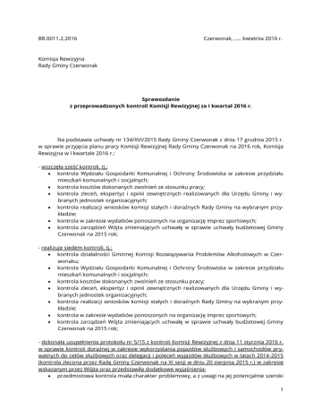 BR.0011.2.2016 Czerwonak, ….. kwietnia 2016 r. Komisja Rewizyjna Rady Gminy Czerwonak Sprawozdanie z przeprowadzonych kontroli Komisji Rewizyjnej za I kwartał 2016 r. Na podstawie uchwały nr 134/XVI/2015 Rady Gminy Czerwonak z dnia 17 grudnia 2015 r. w sprawie przyjęcia planu pracy Komisji Rewizyjnej Rady Gminy Czerwonak na 2016 rok, Komisja Rewizyjna w I kwartale 2016 r.: - wszczęła sześć kontroli, tj.: kontrola Wydziału Gospodarki Komunalnej i Ochrony Środowiska w zakresie przydziału mieszkań komunalnych i socjalnych; kontrola kosztów dokonanych zwolnień ze stosunku pracy; kontrola zleceń, ekspertyz i opinii zewnętrznych realizowanych dla Urzędu Gminy i wybranych jednostek organizacyjnych; kontrola realizacji wniosków komisji stałych i doraźnych Rady Gminy na wybranym przykładzie; kontrola w zakresie wydatków ponoszonych na organizację imprez sportowych; kontrola zarządzeń Wójta zmieniających uchwałę w sprawie uchwały budżetowej Gminy Czerwonak na 2015 rok; - realizuje siedem kontroli, tj.: kontrola działalności Gminnej Komisji Rozwiązywania Problemów Alkoholowych w Czerwonaku; kontrola Wydziału Gospodarki Komunalnej i Ochrony Środowiska w zakresie przydziału mieszkań komunalnych i socjalnych; kontrola kosztów dokonanych zwolnień ze stosunku pracy; kontrola zleceń, ekspertyz i opinii zewnętrznych realizowanych dla Urzędu Gminy i wybranych jednostek organizacyjnych; kontrola realizacji wniosków komisji stałych i doraźnych Rady Gminy na wybranym przykładzie; kontrola w zakresie wydatków ponoszonych na organizację imprez sportowych; kontrola zarządzeń Wójta zmieniających uchwałę w sprawie uchwały budżetowej Gminy Czerwonak na 2015 rok; - dokonała uzupełnienia protokołu nr 5/15 z kontroli Komisji Rewizyjnej z dnia 11 stycznia 2016 r. w sprawie kontroli doraźnej w zakresie wykorzystania pojazdów służbowych i samochodów prywatnych do celów służbowych oraz delegacji i poleceń wyjazdów służbowych w latach 2014-2015 (kontrola zlecona przez Radę Gminy Czerwonak na XI sesji w dniu 20 sierpnia 2015 r.) w zakresie wskazanym przez Wójta oraz przedstawiła dodatkowe wyjaśnienia: przedmiotowa kontrola miała charakter problemowy, a z uwagi na jej potencjalnie szeroki 1 zakres Zespół Kontrolny, jeszcze przed przystąpieniem do czynności kontrolnych, podjął decyzję, że kontrolą objęte zostaną wybrane osoby i dokumenty, o czym Pan Wójt został poinformowany pismem z 23 września 2015 roku. Należy również podkreślić, że kontrola miała charakter doraźny i była bezpośrednio związana z sygnałami o nieprawidłowościach, jakie miały miejsce w związku z rozliczaniem delegacji służbowych, a potencjalny materiał, który mógłby zostać poddany analizie był tak szeroki, że czynnościom kontrolnym poddano jedynie wybrane dokumenty i zagadnienia. Z kolei brak wyraźnego doprecyzowania typu kontroli w protokole był drobnym uchybieniem formalnym, które nie miało żadnego wpływu na proces kontrolny oraz jego merytoryczne rezultaty. Uzupełnienie protokołu w/w kontroli zawiera te informacje; Zespół Kontrolny w protokole z kontroli wyraźnie wskazał datę rozpoczęcia kontroli (28 września 2015 r.), natomiast kontrola została zakończona 28 grudnia 2015 r. Brak tej daty w protokole jest drobnym niedopatrzeniem Zespołu Kontrolnego, za co w imieniu Zespołu przepraszam i jednocześnie informuję, że w przypadku kolejnych kontroli będziemy zwracać na te elementy szczególną uwagę. W uzupełnieniu protokołu w/w kontroli informacja ta została uwzględniona; odnosząc się do uwagi dotyczącej braku wyjaśnień osób, które zostały objęte kontrolą należy zauważyć, że wyjaśnienia wszystkich osób objętych kontrolą nie były możliwe albo też nie były uzasadnione. Należy zauważyć, że Pan T.[…] S.[…] nie pracuje już w urzędzie, a do wyjazdów i ich rozliczeń Pana J.[…] B.[…] Zespół Kontrolny nie miał uwag. Z kolei sprawą dotyczącą Pani Ewy Jedlikowskiej zajmowała się w okresie trwania kontroli prokuratura, a Zespół Kontrolny nie zamierzał wchodzić w kompetencje prokuratury, posiadającej odpowiednie uprawnienia i instrumenty. Należy też zaznaczyć, że Zespół Kontrolny nie posiadał i nie mógł posiadać żadnych informacji dotyczących postępowania prokuratorskiego oprócz samego faktu jego prowadzenia, ponieważ nie był stroną w tym postępowaniu. Zespół Kontrolny z pewnością prosiłby o wyjaśnienia, gdyby zidentyfikował inne nieprawidłowości; ponadto należy podkreślić, że wbrew opinii zawartej w zastrzeżeniach i uwagach do protokołu z kontroli (cyt. „absolutnie nie można zgodzić się ze stwierdzeniem, jakoby Pani Ewa Jedlikowska poświadczyła nieprawdę”) Zespół Kontrolny w żaden sposób nie wskazał konkretnej osoby, która poświadczyła nieprawdę. Stwierdzono natomiast bez wątpienia niezgodność dokumentacji ze stanem faktycznym (w dokumencie delegacji jest napisane, że trasę Poznań-Szczecin i z powrotem Pani Ewa Jedlikowska pokonała prywatnym samochodem, natomiast w toku kontroli jednoznacznie ustalono, że trasa ta została pokonana autobusem); ustalenie, kto dokładnie poświadczył nieprawdę nie leży w kompetencjach Zespołu Kontrolnego, ale prokuratury, która po zawiadomieniu o możliwości popełnienia przestępstwa przez lokalnego dziennikarza powinna ustalić (np. na podstawie analizy grafologicznej) osoby odpowiedzialne za stwierdzone nieprawidłowości. Przewodniczący Komisji Rewizyjnej Robert Maciejewski 2