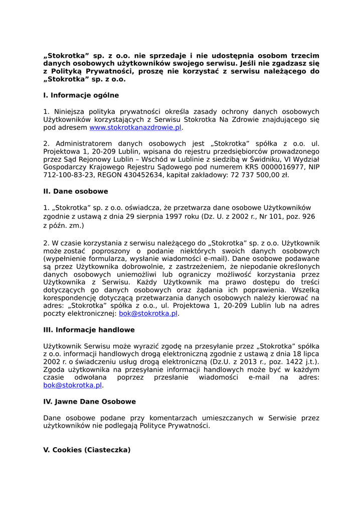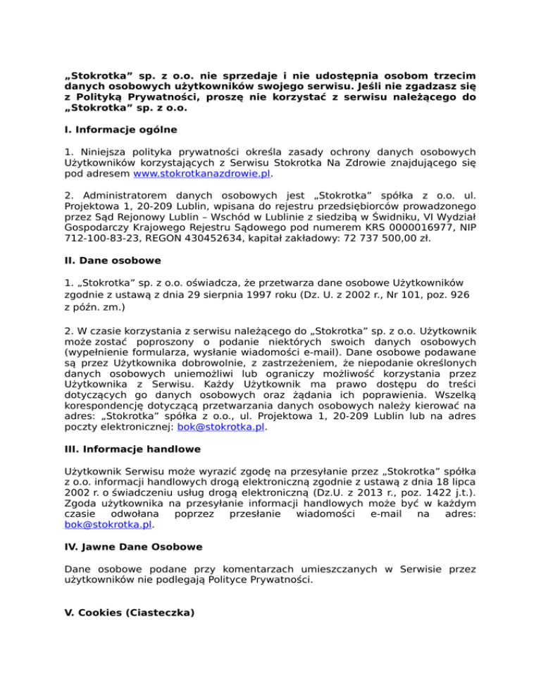 „Stokrotka” sp. z o.o. nie sprzedaje i nie udostępnia osobom trzecim danych osobowych użytkowników swojego serwisu. Jeśli nie zgadzasz się z Polityką Prywatności, proszę nie korzystać z serwisu należącego do „Stokrotka” sp. z o.o. I. Informacje ogólne 1. Niniejsza polityka prywatności określa zasady ochrony danych osobowych Użytkowników korzystających z Serwisu Stokrotka Na Zdrowie znajdującego się pod adresem www.stokrotkanazdrowie.pl. 2. Administratorem danych osobowych jest „Stokrotka” spółka z o.o. ul. Projektowa 1, 20-209 Lublin, wpisana do rejestru przedsiębiorców prowadzonego przez Sąd Rejonowy Lublin – Wschód w Lublinie z siedzibą w Świdniku, VI Wydział Gospodarczy Krajowego Rejestru Sądowego pod numerem KRS 0000016977, NIP 712-100-83-23, REGON 430452634, kapitał zakładowy: 72 737 500,00 zł. II. Dane osobowe 1. „Stokrotka” sp. z o.o. oświadcza, że przetwarza dane osobowe Użytkowników zgodnie z ustawą z dnia 29 sierpnia 1997 roku (Dz. U. z 2002 r., Nr 101, poz. 926 z późn. zm.) 2. W czasie korzystania z serwisu należącego do „Stokrotka” sp. z o.o. Użytkownik może zostać poproszony o podanie niektórych swoich danych osobowych (wypełnienie formularza, wysłanie wiadomości e-mail). Dane osobowe podawane są przez Użytkownika dobrowolnie, z zastrzeżeniem, że niepodanie określonych danych osobowych uniemożliwi lub ograniczy możliwość korzystania przez Użytkownika z Serwisu. Każdy Użytkownik ma prawo dostępu do treści dotyczących go danych osobowych oraz żądania ich poprawienia. Wszelką korespondencję dotyczącą przetwarzania danych osobowych należy kierować na adres: „Stokrotka” spółka z o.o., ul. Projektowa 1, 20-209 Lublin lub na adres poczty elektronicznej: [email protected]. III. Informacje handlowe Użytkownik Serwisu może wyrazić zgodę na przesyłanie przez „Stokrotka” spółka z o.o. informacji handlowych drogą elektroniczną zgodnie z ustawą z dnia 18 lipca 2002 r. o świadczeniu usług drogą elektroniczną (Dz.U. z 2013 r., poz. 1422 j.t.). Zgoda użytkownika na przesyłanie informacji handlowych może być w każdym czasie odwołana poprzez przesłanie wiadomości e-mail na adres: [email protected]. IV. Jawne Dane Osobowe Dane osobowe podane przy komentarzach umieszczanych w Serwisie przez użytkowników nie podlegają Polityce Prywatności. V. Cookies (Ciasteczka) Serwis www.stokrotkanazdrowie.pl wykorzystuje pliki cookies, w których znajdują się informacje niezbędne do prawidłowego funkcjonowania serwisu. Pliki cookies nie pozwalają na identyfikację Użytkownika, za ich pomocą nie są również przetwarzane dane osobowe. Cookies są nieszkodliwe ani dla komputera ani dla jego użytkownika i jego danych. Pliki cookies wykorzystywane są do: 1. Konfiguracji serwisu, 2. Uwierzytelniania Użytkownika w serwisie i zapewnienia sesji użytkownika w serwisie, 3. Realizacji procesów niezbędnych dla pełnej funkcjonalności serwisu, 4. Analiz i badań oraz audytu oglądalności 5. Świadczenia usług reklamowych 6. Komunikacji z serwisem społecznościowym Aby zmienić ustawienia dotyczące cookies, należy odszukać w swojej przeglądarce: „Ustawienia zaawansowane › Prywatność › Ustawienia treści” lub „Pliki cookie”. Wówczas będzie można: - wyłączyć/przywrócić obsługę cookies, - usunąć zapamiętane cookies, - zablokować przechowywanie cookies. Więcej szczegółów można znaleźć w instrukcji obsługi danej przeglądarki. VI. Inne serwisy Polityka Prywatności nie dotyczy serwisów i firm, których dane kontaktowe podane są w serwisie www.stokrotkanazdrowie.pl