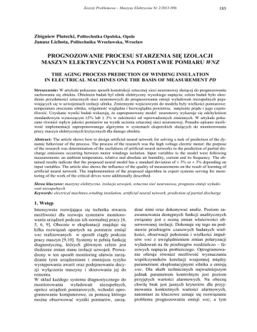Zeszyty Problemowe – Maszyny Elektryczne Nr 2/2013 (99) 185 Zbigniew Plutecki, Politechnika Opolska, Opole Janusz Lichota, Politechnika Wrocławska, Wrocław PROGNOZOWANIE PROCESU STARZENIA SIĘ IZOLACJI MASZYN ELEKTRYCZNYCH NA PODSTAWIE POMIARU WNZ THE AGING PROCESS PREDICTION OF WINDING INSULATION IN ELECTRICAL MACHINES ONE THE BASIS OF MEASUREMENT PD Streszczenie: W artykule pokazano sposób konstrukcji sztucznej sieci neuronowej służącej do prognozowania zachowania się obiektu. Obiektem badań był silnik elektryczny wysokiego napięcia; celem badań było określenie przydatności sztucznych sieci neuronowych do prognozowania emisji wyładowań niezupełnych pojawiających się w uzwojeniach izolacji silnika. Zmiennymi wejściowymi do modelu były wielkości pomiarowe: temperatura otoczenia silnika, wilgotność względna i bezwzględna powietrza, natężenie prądu i jego częstotliwość. Uzyskane wyniki badań wskazują, że zaproponowany model neuronowy wykazuje się odchyleniem standardowym wynoszącym ±5% lub ± 3% w zależności od wprowadzonych zmiennych. W artykule pokazano również wpływ jakości pomiarów na wynik uczenia sztucznej sieci neuronowej. Ponadto opisano możliwość implementacji zaproponowanego algorytmu w systemach eksperckich służących do monitorowania pracy maszyn elektrycznych krytycznych dla danego obiektu. Abstract: The article shows how to design artificial neural network for solving a task of prediction of the dynamic behaviour of the process. The process of the research was the high voltage electric motor; the purpose of the research was determination of the usefulness of artificial neural networks to the prediction of partial discharge emissions occurring between motor windings isolation. Input variables to the model were following measurements: an ambient temperature, relative and absolute air humidity, current and its frequency. The obtained results indicate that the proposed neural model has a standard deviation of ± 5% or ± 3% depending on input variables. The article also shows the influence of the quality of measurements on the result of learning of artificial neural network. The implementation of the proposed algorithm in expert systems serving for monitoring of the work of the critical drives were additionally described. Słowa kluczowe: maszyny elektryczne, izolacja uzwojeń, sztuczna sieć neuronowa, prognoza emisji wyładowań niezupełnych Keywords: electrical machines,winding insulation, artificial neural network, prediction of partial discharge 1. Wstęp Intensywnie rozwijająca się technika stwarza możliwości dla rozwoju systemów monitorowania urządzeń podczas ich normalnej pracy [4, 5, 6, 9]. Obecnie w eksploatacji znajduje się kilka rozwiązań opartych na pomiarze emisji wnz realizowanych w sposób ciągły podczas pracy maszyn [9,10]. Systemy te pełnią funkcję diagnostyczną, których głównym celem jest śledzenie zmian stanu izolacji uzwojeń. Prowadzony w ten sposób monitoring ułatwia zarządzanie tymi urządzeniami i zmniejsza ryzyko występowania awarii oraz podejmowaniu decyzji wyłączenia maszyny i skierowania jej do remontu. W skład każdego systemu diagnostycznego do monitorowania wyładowań niezupełnych, oprócz urządzeń pomiarowych, wchodzi oprogramowanie komputerowe, za pomocą którego można obserwować wyniki pomiarów, zarzą- dzać nimi oraz dokonywać analiz. Poziom zaawansowania dostępnych funkcji analitycznych związany jest z oceną zmian właściwości obserwowanej izolacji. Dokonuje się tego na podstawie przebiegów czasowych badanych wielkości, obserwacji położenia i wielkości impulsów wnz z uwzględnieniem zmian polaryzacji wyładowań na tle przebiegów rozdzielczo – fazowych napięcia probierczego. Oprogramowanie oferuje również możliwość wyznaczania współczynników korelacji wzajemnej między parametrami eksploatacyjnymi silnika a emisją wnz. Dla służb technicznych najważniejszym jednak parametrem kontrolnym jest poziom przyjętych wartości alarmowych. Na obecną chwilę brak jest jasnych kryteriów dla przyjmowania konkretnych wartości alarmowych, natomiast za kluczowe uznaje się rozwiązanie problemu prognozowania emisji wnz, a tym 186 Zeszyty Problemowe – Maszyny Elektryczne Nr 2/2013 (99) samym procesu starzenia się izolacji uzwojeń w wyniku przemysłowej eksploatacji maszyn elektrycznych na podstawie znajomości obecnego stanu technicznego izolacji oraz przebiegu tych zmian jakie obserwowano w okresie minionym. Biorąc pod uwagę ilość zmiennych parametrów zewnętrznych mających wpływ na procesy starzenia się izolacji oraz brak jednoznacznych zależności opisujących te upływy na proces starzenia, prognozowanie emisji wnz można realizować jedynie metodami przybliżonymi [7, 8, 9, 10]. Wpływ na aktywność wnz ma wiele czynników. Do najważniejszych należy zaliczyć m.in. napięcie U, prąd I, częstotliwość f, obciążenie, drgania mechaniczne, temperaturę otoczenia silnika T, wilgotność względną ϕ i bezwzględną x powietrza, a także przebieg czasowy t wymienionych wyżej zmiennych [7, 8, 9, 10]. Temperatura T oraz wilgotność powietrza ϕ, x jest wynikiem wymiany ciepła i masy jaka dokonuje się między pracującą maszyny elektrycznej, a otaczającym ją środowiskiem. Natężenie prądu I wynika z obciążenia napędu. Z kolei częstotliwość f jest zakłóceniem wnoszonym przez zewnętrzną sieć elektroenergetyczną. Drgania mechaniczne są nieodzowną cechą pracy maszyn wirujących i świadczą o oddziaływaniach dynamicznych jakie powstają w obrębie maszyny i jej posadowienia. Istnieje możliwość predykcji stanu izolacji uzwojeń silnika poprzez prognozę aktywności wnz, zakładając rozkład prawdopodobieństwa zakłóceń z jakimi mamy do czynienia przy badaniu wpływu poszczególnych zmiennych. Do modelowania własności dynamicznych silnika zastosowano sigmoidalne sztuczne sieci neuronowe [1] ze w