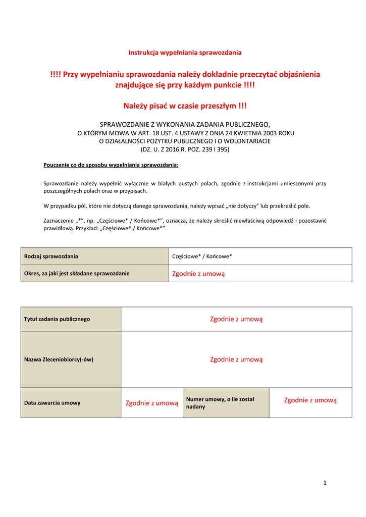 Instrukcja wypełniania sprawozdania !!!! Przy wypełnianiu sprawozdania należy dokładnie przeczytać objaśnienia znajdujące się przy każdym punkcie !!!! Należy pisać w czasie przeszłym !!! SPRAWOZDANIE Z WYKONANIA ZADANIA PUBLICZNEGO, O KTÓRYM MOWA W ART. 18 UST. 4 USTAWY Z DNIA 24 KWIETNIA 2003 ROKU O DZIAŁALNOŚCI POŻYTKU PUBLICZNEGO I O WOLONTARIACIE (DZ. U. Z 2016 R. POZ. 239 I 395) Pouczenie co do sposobu wypełniania sprawozdania: Sprawozdanie należy wypełnić wyłącznie w białych pustych polach, zgodnie z instrukcjami umieszonymi przy poszczególnych polach oraz w przypisach. W przypadku pól, które nie dotyczą danego sprawozdania, należy wpisać „nie dotyczy” lub przekreślić pole. Zaznaczenie „*”, np. „Częściowe* / Końcowe*”, oznacza, że należy skreślić niewłaściwą odpowiedź i pozostawić prawidłową. Przykład: „Częściowe* / Końcowe*”. Rodzaj sprawozdania Częściowe* / Końcowe* Okres, za jaki jest składane sprawozdanie Zgodnie z umową Tytuł zadania publicznego Zgodnie z umową Nazwa Zleceniobiorcy(-ów) Zgodnie z umową Data zawarcia umowy Zgodnie z umową Numer umowy, o ile został nadany Zgodnie z umową 1 Część I. Sprawozdanie merytoryczne 1. Informacja, czy zakładany(-ne) cel(e) realizacji zadania publicznego został(y) osiągnięty(-te) w wymiarze określonym w części IV pkt 4 oferty. Jeżeli nie, należy wskazać dlaczego. Należy szczegółowo opisać założone cele określone w części IV pkt 4 oferty oraz opisać w jaki sposób zostały one osiągnięte. Jeśli nie udało się zrealizować któregoś z celów należy wyjaśnić dlaczego. 2. Opis osiągniętych rezultatów wraz z liczbowym określeniem skali działań zrealizowanych w ramach zadania (należy opisać osiągnięte rezultaty zadania publicznego i sposób, w jaki zostały zmierzone; należy wskazać rezultaty trwałe oraz w jakim stopniu realizacja zadania przyczyniła się do osiągnięcia jego celu) Należy opisać założone rezultaty zadania określone w części IV pkt 5 oferty i opisać w jaki sposób zostały one osiągnięte, np.: ilość uczestników, osób przeszkolonych, liczba spotkań, zajęć, treningów itp. 3. Szczegółowy opis wykonania poszczególnych działań (opis powinien zawierać szczegółową informację o zrealizowanych działaniach zgodnie z umową, z uwzględnieniem stopnia oraz skali ich wykonania, a także wyjaśnić ewentualne odstępstwa w ich realizacji; w opisie należy przedstawić również informację o zaangażowanym wkładzie osobowym i wkładzie rzeczowym w realizację działań; w przypadku realizacji działania przez podmiot niebędący stroną umowy1) należy to wyraźnie wskazać w opisie tego działania) Opis powinien być zgodny z założeniami w ofercie rozpisanymi w części IV pkt 1. 4. Opis, w jaki sposób dofinansowanie z dotacji inwestycji związanych z realizacją zadania wpłynęło na jego wykonanie 2) Należy wpisać „nie dotyczy” 1) Dotyczy podzlecenia realizacji zadania, o którym mowa w art. 16 ust. 4 ustawy z dnia 24 kwietnia 2003 r. o działalności pożytku publicznego i o wolontariacie. 2) Wypełnić jedynie w przypadku, gdy dotacja była przekazana na dofinansowanie inwestycji. 2 Część II. Sprawozdanie z wykonania wydatków 1. Rozliczenie wydatków w roku …………. Koszty zgodnie z umową (w zł) Kategoria kosztu Rodzaj kosztów koszt całkowity z dotacji z innych środków finansowych3) z wkładu osobowego4) Faktycznie poniesione wydatki (w zł) z wkładu rzeczowego5), 6) Numer(y) lub nazwa(-wy) działania(-łań) zgodnie z umową całkowite wydatki z dotacji7) z innych środków finansowych3) z wkładu z wkładu osobowego4) rzeczowego5), 6) Numer(y) lub nazwa(-wy) działania(-łań) zgodnie z umową Koszty merytoryczne8) bezpośrednio związane z realizacją zadania, tj. osiągnięciem celu (np. zakup materiałów, art. spożywczych, nagród, umowy z terapeutami, trenerami itp.) I Nr Koszty po stronie: poz. ……………………………………….: (nazwa zleceniobiorcy) 1 wynagrodzenie 2 transport 3 mat. biurowe 4 art. sportowe 5 art. spożywcze Razem: 3) Na przykład środki finansowe oferenta, inne środki publiczne (np. dotacje), świadczenia pieniężne od odbiorców zadania. Wkładem osobowym są praca społeczna członków i świadczenia wolontariuszy zaangażowane w realizację zadania publicznego. 5) Wypełnić jedynie w przypadku, gdy umowa zobowiązywała do wykazania wkładu rzeczowego. 6) Wkładem rzeczowym są np. nieruchomości, środki transportu, maszyny, urządzenia. Zasobem rzeczowym może być również zasób udostępniony, względnie usługa świadczona na rzecz tej organizacji przez inny podmiot nieodpłatnie (np. usługa transportowa, hotelowa, poligraficzna itp.) wykorzystana w realizacji zadania publicznego. 7) Należy uwzględnić także środki finansowe pochodzące z odsetek bankowych od dotacji oraz z innych przychodów (np. ze sprzedaży towarów lub usług wytworzonych lub świadczonych w ramach realizacji zadania publicznego). 8) Należy wpisać koszty bezpośrednio związane z celem realizowanego zadania publicznego. W przypadku oferty wspólnej powyższe koszty należy wpisać dla każdego oferenta oddzielnie. W przypadku większej liczby kosztów istnieje możliwość dodawania kolejnych wierszy. 4) 3 Koszty obsługi zadania publicznego, w tym koszty administracyjne koszty pośrednio związane z realizacją zadania, tj. osiągnięciem celu (np. księgowość, czynsz, opłaty bankowe, media, wywóz nieczystości, rachunki za telefon, internet itp.) II Nr Koszty po stronie: poz. ……………………………………….: (nazwa zleceniobiorcy) 1 księgowość 2 opłaty bankowe 3 czynsz 4 media Razem: III Koszty poszczególnych zleceniobiorców ogółem9): ………………………………… : (nazwa zleceniobiorcy 1) …………………….………… : (nazwa zleceniobiorcy 2) Ogółem: 9) Dotyczy oferty wspólnej