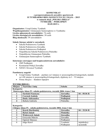KOMUNIKAT z przeprowadzonych zawodów sportowych II TYMBARSKI BIEG KONSTYTUCJI 3 MAJA – 2015 w ramach akcji „POLSKA BIEGA” TYMBARK – PODŁOPIEŃ 02.05.2015 r. Organizator: Urząd Gminy Tymbark Współorganizator: Gimnazjum Samorządowe w Tymbarku Liczba zgłoszonych zawodników: 74 osób Liczba startujących zawodników: 39 osób Bieg ukończyło: 39 zawodników Szkoły biorące udział w zawodach: Szkoła Podstawowa Tymbark Szkoła Podstawowa Zawadka Szkoła Podstawowa Podłopień Niepubliczna Szkoła Podstawowa Piekiełko Niepubliczne Gimnazjum Piekiełko Gimnazjum Samorządowe Tymbark Instytucje czuwające nad bezpieczeństwem zawodników: OSP Podłopień Komisariat Policji Zawadka NZOZ Chiramed Tymbark Fundatorzy nagród Urząd Gminy Tymbark – puchary za I miejsca w poszczególnych kategoriach, medale za I-III miejsca w poszczególnych kategoriach, dyplomy za I – VI miejsca Firma Maspex – fundator napojów WYNIKI BIEGU: Miejsce Nazwisko i imię Szkoła Kategoria: Dziewczęta, klasa IV, szkoła podstawowa, rocznik 2004, trasa 1 km 1 Surdziel Faustyna Zawadka 2 Czernek Izabela Podłopień 3 Duda Aleksandra Podłopień Bubula Gabriela Piekiełko 4 Kategoria: Chłopcy klasa IV, szkoła podstawowa, rocznik 2004, trasa 1 km 1 Kurek Bartłomiej Zawadka 2 Hybel Jakub Piekiełko 3 Wołowczyk Jakub Zawadka 4 Goryczka Marcin Zawadka 5 Ogórek Mateusz Podłopień 6 Jułga Karol Tymbark/ Podłopień Czas 04 : 09,96 R 04 : 25,56 R najmłodszy uczestnik Kategoria: Dziewczęta, klasa V- VI , szkoła podstawowa, rocznik 2002-2003, trasa 2 km 1 Odziomek Aleksandra Tymbark 11 : 13 ,52 R 2 Bubula Irmina Tymbark 3 Rybka Renata Tymbark 4 Nowak Anna Zawadka 5 Czopek Angelika Tymbark 6 Dziadoń Julia Zawadka 7 Kordeczka Aneta Zawadka 8 Młynarczyk Dominika Tymbark 9 Kaleta Angelika Piekiełko 10 Rusnak Agata Piekiełko 11 Stapińska Agata Tymbark 12 Sojka Martyna Tymbark Kategoria: Chłopcy, klasa V- VI, szkoła podstawowa, rocznik 2002-2003, trasa 2 km 1 Gajda Michał Tymbark 10 : 51 ,00 2 Kaim Kacper Piekiełko Kategoria: Dziewczęta, klasa I-III, gimnazjum, rocznik 1999-2001, trasa 2 km 1 Smaga Gabriela Tymbark 2 Sędzik Kinga Tymbark 3 Kurek Aleksandra Tymbark 4 Zapała Patrycja Tymbark 5 Zapała Natalia Tymbark 6 Rokosz Elwira Tymbark 7 Wagner Małgorzata Tymbark 8 Grzegorzek Klaudia Tymbark 9 Trojanowska Aleksandra Tymbark 10 Grochmal Julia Tymbark 11 Banach Marcelina Tymbark Kategoria: Chłopcy, klasa I-III, gimnazjum, rocznik 1999-2001, trasa 2 km 1 Moskal Jakub Tymbark 2 Buszek Przemysław Tymbark 3 Puchała Wojciech Tymbark 4 Klimek Filip Piekiełko 10 : 29,52 R 10 : 01,28 Bardzo dziękujemy nauczycielom - opiekunom zawodników oraz rodzicom za pomoc podczas zawodów. Dziękujemy również firmie Florad za udostępnienie parkingu i zaplecza sanitarnego. Organizator oraz współorganizator zawodów
