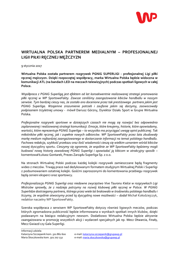 WIRTUALNA POLSKA PARTNEREM MEDIALNYM – PROFESJONALNEJ LIGII PIŁKI RĘCZNEJ MĘŻCZYZN 9 stycznia 2017 Wirtualna Polska została partnerem rozgrywek PGNiG SUPERLIGI - profesjonalnej Ligi piłki ręcznej mężczyzn. Dzięki rozpoczętej współpracy, marka Wirtualna Polska będzie widoczna w komunikacji ATL (na bandach LED na meczach telewizyjnych) podczas spotkań ligowych w całej Polsce. Współpraca z PGNiG Superligą jest efektem od lat konsekwentnie realizowanej strategii promowania piłki ręcznej w WP SportoweFakty. Zawsze ceniliśmy zaangażowanie kibiców handballu w naszym serwisie. Tym bardziej cieszy nas, że zostało ono docenione przez tak prestiżowego partnera jakim jest PGNiG Superliga. Wzajemne zrozumienie potrzeb i zaufanie jakim się darzymy, zaowocowały podpisaniem trzyletniej umowy - mówił Dariusz Górzny, Dyrektor Działu Sport w Grupie Wirtualna Polska. Profesjonalne rozgrywki sportowe w dzisiejszych czasach nie mogą się rozwijać bez odpowiednio zaplanowanej i realizowanej strategii komunikacji. Emocje, które kreujemy, historie, które opowiadamy, wartości, które reprezentuje PGNiG Superliga – to wszystko ma przyciągać uwagę opinii publicznej. Tak miłośników piłki ręcznej, jak i zupełnie nowych odbiorców. WP SportoweFakty przez lata zbudowały markę medium najbardziej zaangażowanego w dostarczanie informacji na temat polskiego handballu. Fachowa redakcja, szybkość przekazu oraz ilość wiadomości cieszą się wielkim uznaniem wśród kibiców naszej dyscypliny sportu. Cieszymy się ogromnie, że wspólnie ze WP SportoweFakty będziemy mogli budować nową historię zawodowej PGNiG Superligi i opowiadać ją kibicom w atrakcyjny sposób – komentował Łukasz Gontarek, Prezes Zarządu Superliga Sp. z o.o. Na stronach Wirtualnej Polski podczas każdej kolejki rozgrywek zamieszczane będą fragmenty wideo z meczów. Trwają prace nad dedykowanym formatem studyjnym Wirtualnej Polski i Superligi z podsumowaniem ostatniej kolejki. Gośćmi zaproszonymi do komentowania przebiegu rozgrywek będą cenieni eksperci oraz sportowcy. Profesjonalizacja PGNiG Superligi oraz niedawne zwycięstwo Vive Tauronu Kielce w rozgrywkach Ligi Mistrzów sprawiły, że z nadzieja patrzymy na rozwój klubowej piłki ręcznej w Polsce. W PGNiG Superlidze dostrzegamy partnera, którego przez wiele lat brakowało w środowisku polskiego handballu i liczymy, że wspólnie otworzymy przed tą dyscypliną nowe możliwości – dodał Michał Kołodziejczyk, redaktor naczelny WP SportoweFakty. Szeroka współpraca z serwisem WP SportoweFakty dotyczy również ligowych meczów, podczas których zgromadzona publiczność będzie informowana o wynikach spotkań innych klubów, dzięki podawanym na bieżąco redakcyjnym newsom. Dodatkowo Wirtualna Polska będzie aktywnie zaangażowana w promocję wszystkich akcji i wydarzeń specjalnych jak np. Mecz Otwarcia, Finały, Mecz Gwiazd czy Gala Superligi. Informacji udziela: Katarzyna Szczepanik kom. 501 861 600 Maria Skoczkowska kom. 502 707 232 e-mail: [email protected] e-mail: [email protected]