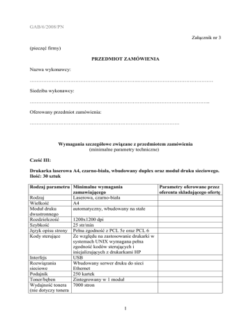 GAB/6/2008/PN Załącznik nr 3 (pieczęć firmy) PRZEDMIOT ZAMÓWIENIA Nazwa wykonawcy: ……………………………………………………….……………………………………… Siedziba wykonawcy: …………………………………………………………………………………………….. Oferowany przedmiot zamówienia: ……………………………….……………………………………………. Wymagania szczegółowe związane z przedmiotem zamówienia (minimalne parametry techniczne) Cześć III: Drukarka laserowa A4, czarno-biała, wbudowany duplex oraz moduł druku sieciowego. Ilość: 30 sztuk Rodzaj parametru Minimalne wymagania Parametry oferowane przez oferenta składającego ofertę zamawiającego Rodzaj Laserowa, czarno-biała Wielkość A4 Moduł druku automatyczny, wbudowany na stałe dwustronnego Rozdzielczość 1200x1200 dpi Szybkość 25 str/min Język opisu strony Pełna zgodność z PCL 5e oraz PCL 6 Kody sterujące Ze względu na zastosowanie drukarki w systemach UNIX wymagana pełna zgodność kodów sterujących i inicjalizujących z drukarkami HP Interfejs USB Rozwiązania Wbudowany serwer druku do sieci sieciowe Ethernet Podajnik 250 kartek Toner/bęben Zintegrowany w 1 moduł Wydajność tonera 7000 stron (nie dotyczy tonera 1 dostarczonego z drukarką) ObciąŜenie Pamięć Obsługiwane systemy operacyjne Język sterowników WyposaŜenie Normy eco Waga max: Gwarancja 15000 stron/ miesiąc 32 MB Windows 98, Windows XP Prof, Windows Serwer 2003 Polski kabel USB w komplecie, długość 2 metry, ekranowany (w oplocie). EnergyStar 11 kg 36 miesięcy Drukarka atramentowa kolorowa A4. Ilość : 30 sztuk Rodzaj parametru Minimalne wymagania Parametry oferowane przez zamawiającego oferenta składającego ofertę Rodzaj Atramentowa, kolorowa, Wielkość A4 Moduł druku automatyczny, w zestawie dwustronnego Rozdzielczość 1200x1200 dpi Prędkość druku w 9 str/min czerni tryb normal Prędkość druku w 5 str/min kolorze tryb normal Język opisu strony Pełna zgodność z PCL 3 Interfejs USB, Ethernet Rozwiązania Wbudowany adapter do druku w sieci sieciowe Ethernet Podajnik 150 arkuszy ObciąŜenie 5000 stron/ miesiąc Pamięć 32 MB Obsługiwane Windows 2000 Prof, Windows XP Prof, systemy operacyjne Windows Vista Język sterowników Polski WyposaŜenie kabel USB w komplecie, 2 metry, ekranowany (w oplocie) Normy eco EnergyStar Waga Max: 7,5 kg Gwarancja 36 miesięcy 2 Drukarka atramentowa kolorowa, przenośna do notebooka. Ilość : 20 sztuk Rodzaj parametru Rodzaj Parametry oferowane przez wykonawcę Format Minimalne wymagania zamawiającego przenośna drukarka kolorowa A4 Rozdzielczość 1200x1200 dpi Interfejsy USB, Bluetooth Zasilacz w komplecie Akumulator w komplecie Sterowniki Windows 2000/XP/Vista Język Uwagi Zgodny z PCL3 kabel USB w komplecie, jeŜeli moduł Bluetooth nie jest wbudowany musi być w zestawie EnergyStar 36 miesięcy Normy eco Gwarancja Uwagi Drukarka kolorowa, atramentowa, formatu A3+. Ilość : 2 sztuki Rodzaj parametru Minimalne wymagania Parametry oferowane przez zamawiającego oferenta składającego ofertę Rodzaj Kolorowa, atramentowa Wielkość A3+ Moduł druku automatyczny, wbudowany na stałe dwustronnego Rozdzielczość 1200x1200 dpi Szybkość tryb W czerni do 15 str/min normal W kolorze do 14 str/min Język opisu strony PCL 3 Interfejs USB, Ethernet Komunikacja USB, wbudowany serwer druku do sieci Fast Ethernet Podajnik 250 arkuszy ObciąŜenie 6000 stron/ miesiąc Pamięć 32 MB Obsługiwane Windows 2000, Windows XP Prof, systemy operacyjne Windows Vista 3 Język sterowników Polski WyposaŜenie kabel USB w komplecie, 2 metry, ekranowany (w oplocie) Normy eco EnergyStar Gwarancja 36 miesięcy Dostawa: Dostawa sprzętu o którym mowa w części III nastąpi do siedziby WyŜszego Urzędu Górniczego w Katowicach w 2 transzach po 30 sztuk drukarek laserowych lub atramentowych. Pozostałe drukarki z tego zamówienia mogą zostać dostarczone wraz z pierwszą lub drugą transzą. Pierwsza dostawa nastąpi w terminie 2 tygodni od dnia podpisania umowy. Akceptacja lub jej brak nastąpi w momencie dostawy. W wypadku braku akceptacji dostawca jest zobowiązany do odbioru całości dostarczonych drukarek i usunięcia braków na własny koszt w terminie 10 dni od zawiadomienia o braku akceptacji. Zamawiający prosi o składanie ofert wg. załączonej tabeli specyfikacji. miejscowość, dnia: ………….…………..…... …………...………………......…..… Imiona i nazwiska osób uprawnionych do reprezentowania wykonawcy ………………..…………….. czytelny podpis 4