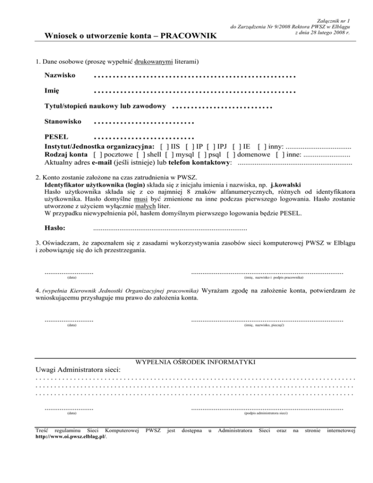Wniosek o utworzenie konta – PRACOWNIK Załącznik nr 1 do Zarządzenia Nr 9/2008 Rektora PWSZ w Elblągu z dnia 28 lutego 2008 r. 1. Dane osobowe (proszę wypełnić drukowanymi literami) ...................................................... Imię ...................................................... Tytuł/stopień naukowy lub zawodowy ........................... Stanowisko ........................... PESEL ........................... Nazwisko Instytut/Jednostka organizacyjna: [ ] IIS [ ] IP [ ] IPJ [ ] IE [ ] inny: ................................... Rodzaj konta [ ] pocztowe [ ] shell [ ] mysql [ ] psql [ ] domenowe [ ] inne: ......................... Aktualny adres e-mail (jeśli istnieje) lub telefon kontaktowy: ............................................................. 2. Konto zostanie założone na czas zatrudnienia w PWSZ. Identyfikator użytkownika (login) składa się z inicjału imienia i nazwiska, np. j.kowalski Hasło użytkownika składa się z co najmniej 8 znaków alfanumerycznych, różnych od identyfikatora użytkownika. Hasło domyślne musi być zmienione na inne podczas pierwszego logowania. Hasło zostanie utworzone z użyciem wyłącznie małych liter. W przypadku niewypełnienia pól, hasłem domyślnym pierwszego logowania będzie PESEL. Hasło: .................................................................................. 3. Oświadczam, że zapoznałem się z zasadami wykorzystywania zasobów sieci komputerowej PWSZ w Elblągu i zobowiązuję się do ich przestrzegania. .......................... ................................................................................. (data) (imię, nazwisko i podpis pracownika) 4. (wypełnia Kierownik Jednostki Organizacyjnej pracownika) Wyrażam zgodę na założenie konta, potwierdzam że wnioskującemu przysługuje mu prawo do założenia konta. .......................... ................................................................................. (data) (imię, nazwisko, pieczęć) WYPEŁNIA OŚRODEK INFORMATYKI Uwagi Administratora sieci: ..................................................................................... ..................................................................................... ..................................................................................... .......................... ................................................................................. (data) Treść regulaminu Sieci Komputerowej http://www.oi.pwsz.elblag.pl/. (podpis administratora sieci) PWSZ jest dostępna u Administratora Sieci oraz na stronie internetowej Załącznik nr 2 do Zarządzenia Nr 9/2008 Rektora PWSZ w Elblągu z dnia 28 lutego 2008 r. 2.Wniosek o utworzenie konta – STUDENT 3. Dane osobowe (proszę wypełnić drukowanymi literami) Nazwisko Imię Nr indeksu Rok studiów ...................................................... ...................................................... ........... ...... ........................... PESEL Instytut [ ] IIS [ ] IP [ ] IPJ [ ] IE Tryb studiów [ ] stacjonarny [ ] niestacjonarny Rodzaj konta [ ] pocztowe [ ] shell [ ] mysql [ ] postgres Aktualny adres e-mail (jeśli istnieje) lub telefon kontaktowy: ............................................................. 4. Konto zostanie założone na okres studiów. Identyfikator użytkownika (login) składa się z akronimu pełnej nazwy instytutu oraz numeru albumu (np. iis99999) Hasło użytkownika składa się z co najmniej 8 znaków alfanumerycznych, różnych od identyfikatora użytkownika. Hasło domyślne musi być zmienione na inne podczas pierwszego logowania. Hasło zostanie utworzone z użyciem wyłącznie małych liter. W przypadku niewypełnienia pól, hasłem domyślnym pierwszego logowania będzie PESEL. Hasło: .................................................................................. 5. Oświadczam, że zapoznałem się z zasadami wykorzystywania zasobów sieci komputerowej PWSZ w Elblągu i zobowiązuję się do ich przestrzegania. .......................... ................................................................................. (data) (imię, nazwisko i podpis studenta) (wypełnia Dziekanat) Wyrażam zgodę na założenie konta, potwierdzam że wnioskujący jest studentem PWSZ w Elblągu i przysługuje mu prawo do założenia konta .......................... ................................................................................. (data) (imię, nazwisko, pieczęć) WYPEŁNIA OŚRODEK INFORMATYKI Uwagi Administratora sieci: ..................................................................................... ..................................................................................... ..................................................................................... .......................... ................................................................................. (data) Treść regulaminu Sieci Komputerowej http://www.oi.pwsz.elblag.pl/. (podpis administratora sieci) PWSZ jest dostępna u Administratora Sieci oraz na stronie internetowej Załącznik nr 3 do Zarządzenia Nr 9/2008 Rektora PWSZ w Elblągu z dnia 28 lutego 2008 r. Wniosek o utworzenie konta Jednostki Organizacyjne 3.Dane osoby składającej wniosek (proszę wypełnić drukowanymi literami) ........................................................... Skrócona nazwa jednostki ......................................................... Funkcja osoby wnioskującej w organizacji ............................................ Nazwisko ...................................................... Imię ...................................................... PESEL ........................... Pełna nazwa jednostki Rodzaj konta [ ] pocztowe [ ] shell [ ] mysql [ ] postgres [ ] domenowe [ ] inne: ....................... Aktualny adres e-mail (jeśli istnieje) lub telefon kontaktowy: ............................................................. 4.Konto zostanie założone na czas dz