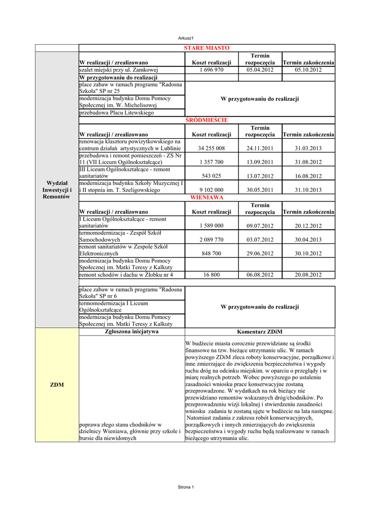Arkusz1 STARE MIASTO W realizacji / zrealizowano szalet miejski przy ul. Zamkowej W przygotowaniu do realizacji place zabaw w ramach programu "Radosna Szkoła" SP nr 25 modernizacja budynku Domu Pomocy Społecznej im. W. Michelisowej przebudowa Placu Litewskiego Koszt realizacji 1 696 970 Termin rozpoczęcia 05.04.2012 Termin zakończenia 05.10.2012 W przygotowaniu do realizacji ŚRÓDMIEŚCIE Wydział Inwestycji i Remontów W realizacji / zrealizowano renowacja klasztoru powizytkowskiego na centrum działań artystycznych w Lublinie przebudowa i remont pomieszczeń - ZS Nr 11 (VII Liceum Ogólnokształcące) III Liceum Ogólnokształcące - remont sanitariatów modernizacja budynku Szkoły Muzycznej I i II stopnia im. T. Szeligowskiego W realizacji / zrealizowano I Liceum Ogólnokształcące - remont sanitariatów termomodernizacja - Zespół Szkół Samochodowych remont sanitariatów w Zespole Szkół Elektronicznych modernizacja budynku Domu Pomocy Społecznej im. Matki Teresy z Kalkuty remont schodów i dachu w Żłobku nr 4 Koszt realizacji Termin rozpoczęcia Termin zakończenia 34 255 008 24.11.2011 31.03.2013 1 357 700 13.09.2011 31.08.2012 543 025 13.07.2012 16.08.2012 30.05.2011 31.10.2013 Koszt realizacji Termin rozpoczęcia Termin zakończenia 1 589 000 09.07.2012 20.12.2012 2 089 770 03.07.2012 30.04.2013 848 700 29.06.2012 30.10.2012 16 800 06.08.2012 20.08.2012 9 102 000 WIENIAWA place zabaw w ramach programu "Radosna Szkoła" SP nr 6 termomodernizacja I Liceum Ogólnokształcące modernizacja budynku Domu Pomocy Społecznej im. Matki Teresy z Kalkuty Zgłoszona inicjatywa ZDM W przygotowaniu do realizacji Komentarz ZDiM W budżecie miasta corocznie przewidziane są środki finansowe na tzw. bieżące utrzymanie ulic. W ramach powyższego ZDiM zleca roboty konserwacyjne, porządkowe i inne zmierzające do zwiększenia bezpieczeństwa i wygody ruchu dróg na odcinku miejskim. w oparciu o przeglądy i w miarę realnych potrzeb. Wobec powyższego po ustaleniu zasadności wniosku prace konserwacyjne zostaną przeprowadzone. W wydatkach na rok bieżący nie przewidziano remontów wskazanych dróg/chodników. Po przeprowadzeniu wizji lokalnej i stwierdzeniu zasadności wniosku zadania te zostaną ujęte w budżecie na lata następne. Natomiast zadania z zakresu robót konserwacyjnych, poprawa złego stanu chodników w porządkowych i innych zmierzających do zwiększenia dzielnicy Wieniawa, głównie przy szkole i bezpieczeństwa i wygody ruchu będą realizowane w ramach bursie dla niewidomych bieżącego utrzymania ulic. Strona 1 Arkusz1 Wieniawa Śródmieście Stare Miasto Ujęte w budżecie ZDM Budowa odcinka o łącznej dł. ok. 2,8 km w celu zwiększenia wydajności i Drogi dojazdowe do węzła drogowego płynności lokalnego i regionalnego "Jakubowice" obwodnicy Miasta Lublin w układu komunikacyjnego ul. ciągu dróg ekspresowych S12,S17 i S19 Poligonowa i skrzyżowanie al. Solidarności, al. Sikorskiego i ul. Gen Ducha. remont obejmuje nawierzchnie jezdni Remont al. Racławickie oraz istniejące chodniki i ścieżki rowerowe remont obejmuje nawierzchnie jezdni Remont ul. Langiewicza oraz istniejące chodniki i ścieżki rowerowe Wykup gruntów oraz wykonanie Budowa ulicy łączącej ul. Szeligowskiego z dokumentacji budowy ulicy wraz z ul. Chodźki przebudową istniejącego odcinka od Szpitala Dziecięcego do ul. Chodźki. remont obejmuje nawierzchnie jezdni Remont ul. Podwale oraz istniejące chodniki i ścieżki rowerowe 2007-2014 2012-2014 2012-2013 2012-2013 2012-2013 Zadania zgłoszone do budżetu na rok 2013 ZDM Dzielnica LUBLIN Wieniawa Nazwa zadania Infrastruktura przystankowa na terenie miasta Lublin Zakres dokumentacja i budowa 30 nowych zatok przystankowych Realizacja Inwestycji / Remontu Inwestycja Kontynuowana 20112014 Opracowanie dokumentacji oraz roboty Przebudowa ul. Sowińskiego (tunel pod Al. budowlane we wszystkich branżach Racławickimi i węzeł drogowy na wraz z budową infrastruktury skrzyżowaniu ulic Głębokiej i Filaretów) rowerowej Nowa Inwestycja 2013-2016 Zaprojektowanie i budowa rurociągu kablowego i zaciągnięcie kabla Opracowanie dokumentacji oraz roboty światłowodowego wzdłuż ul. Głębokiej na budowlane we wszystkich branżach odcinku od al. Kraśnickich do ul. Filaretów Nowa Inwestycja 2013 Wieniawa/Sławi Wykonanie ścieżki rowerowej na al. nek Sikorskiego Remont ul. Miedzianej Remont ul. Szkolnej Remont ul. Żmigród Opracowanie dokumentacji oraz roboty budowlane we wszystkich branżach remont obejmuje nawierzchnie jezdni oraz istniejące chodniki i ścieżki rowerowe remont obejmuje nawierzchnie jezdni oraz istniejące chodniki i ścieżki rowerowe remont obejmuje nawierzchnie jezdni oraz istniejące chodniki i ścieżki rowerowe Nowa Inwestycja 2013 2013-2014 2013-2014 2013 Remont chodników i wjazdów w ul. Obrońców Pokoju na odcinku od ul. Uniwersyteckiej do ul. Akademickiej po prawej stronie oraz na odcinku od ul. Raabego do ul. Akademickiej po lewej stronie remont chodników i wjazdów na posesje wraz z budową ścieżki rowerowej 2013 Remont chodnika w ul. Raabego remont chodników i wjazdów na posesje 2013 Przebudowa ul. Lipowej na odcinku od ul. Opracowanie dokumentacji oraz roboty Krakowskie Przedmieście do ul. Okopowej budowlane Śródmieście Strona 2 Nowa Inwestycja 2013-2014 Arkusz1 Śródmieście Realizacja robót drogowych wraz z kanalizacją deszczową,budowa trakcji trolejbusowej, przebudowa sygnalizacji świetlnej, roboty w zakresie budowy linii energetycznych i telekomunikacyjnych. Przebudowa obejmuje budowę drogi oraz chodniki, ścieżki rowerowe oraz kanalizację deszczową. Budowa obejmuje budowę drogi, chodniki oraz kanalizację deszczową wraz z budową infrastruktury rowerowej Przebudowa obejmuje budowę drogi, chodniki oraz kanalizację deszczową wraz z budową infrastruktury rowerowej Przebudowa ul. Narutowicza (od ul. Głębokiej do ul. Okopowej z ulicami bocznymi Przebudowa ul. Staszica