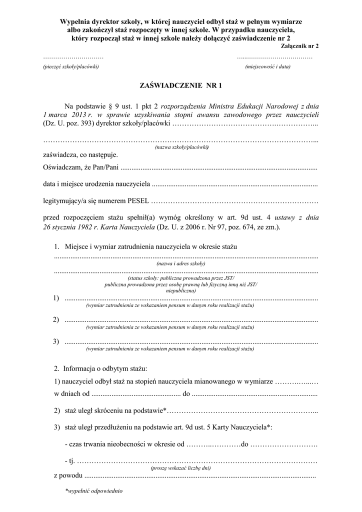 Wypełnia dyrektor szkoły, w której nauczyciel odbył staż w pełnym wymiarze albo zakończył staż rozpoczęty w innej szkole. W przypadku nauczyciela, który rozpoczął staż w innej szkole należy dołączyć zaświadczenie nr 2 Załącznik nr 2 ………………………… …..…………………………… (pieczęć szkoły/placówki) (miejscowość i data) ZAŚWIADCZENIE NR 1 Na podstawie § 9 ust. 1 pkt 2 rozporządzenia Ministra Edukacji Narodowej z dnia 1 marca 2013 r. w sprawie uzyskiwania stopni awansu zawodowego przez nauczycieli (Dz. U. poz. 393) dyrektor szkoły/placówki …………………………………….……………... …………………………………………………………………………………………………... (nazwa szkoły/placówki) zaświadcza, co następuje. Oświadczam, że Pan/Pani ............................................................................................................ data i miejsce urodzenia nauczyciela ........................................................................................... legitymujący/a się numerem PESEL …………………………………………………………… przed rozpoczęciem stażu spełnił(a) wymóg określony w art. 9d ust. 4 ustawy z dnia 26 stycznia 1982 r. Karta Nauczyciela (Dz. U. z 2006 r. Nr 97, poz. 674, ze zm.). 1. Miejsce i wymiar zatrudnienia nauczyciela w okresie stażu ................................................................................................................................................. (nazwa i adres szkoły) ................................................................................................................................................. (status szkoły: publiczna prowadzona przez JST/ publiczna prowadzona przez osobę prawną lub fizyczną inną niż JST/ niepubliczna) 1) ........................................................................................................................................... (wymiar zatrudnienia ze wskazaniem pensum w danym roku realizacji stażu) 2) ........................................................................................................................................... (wymiar zatrudnienia ze wskazaniem pensum w danym roku realizacji stażu) 3) ........................................................................................................................................... (wymiar zatrudnienia ze wskazaniem pensum w danym roku realizacji stażu) 2. Informacja o odbytym stażu: 1) nauczyciel odbył staż na stopień nauczyciela mianowanego w wymiarze ……….…...… w dniach od ................................................. do ..................................................................... 2) staż uległ skróceniu na podstawie*……………………………………………………... 3) staż uległ przedłużeniu na podstawie art. 9d ust. 5 Karty Nauczyciela*: - czas trwania nieobecności w okresie od ………..…………do ………………………. - tj. ……………………………………………………………………………………… (proszę wskazać liczbę dni) z powodu ............................................................................................................................... *wypełnić odpowiednio (podać przyczynę przedłużenia stażu np.: L-4, urlop macierzyński) 4) nauczany w okresie stażu przedmiot/y lub rodzaj prowadzonych zajęć ………………... ..................................................................... w wymiarze ...................................................... 3. Informacja o wymiarze zatrudnienia nauczyciela i nauczanym przez niego przedmiocie lub rodzaju prowadzonych zajęć w dniu wydania zaświadczenia. W dniu wydania zaświadczenia nauczyciel: - zatrudniony był w wymiarze ........................... na stanowisku nauczyciela ……………... ............................................................................................................................................... (podać nazwę przedmiotu lub rodzaj prowadzonych zajęć; w przypadku szkół specjalnych określić rodzaj i stopień niepełnosprawności uczniów; w przypadku nauczycieli przedmiotów zawodowych podać nazwę zawodu oraz nauczany przedmiot lub rodzaj prowadzonych zajęć w ramach kształcenia zawodowego) ................................................................................................................................................. (w przypadku zespołu szkół podać w jakim typie/rodzaju szkoły nauczyciel realizuje przedmiot lub prowadzi zajęcia) - przebywa na urlopie dla poratowania zdrowia*…………………………………………... (wskazać okres) 4. Data zatwierdzenia planu rozwoju zawodowego nauczyciela ........................................... 5. Data złożenia przez nauczyciela sprawozdania z realizacji planu rozwoju zawodowego ............................................................................................................................................ 6. Informacja o ocenie dorobku zawodowego za okres stażu: - data dokonania oceny dorobku zawodowego ................................................................ - uzyskana ocena .............................................................................................................. (pozytywna/negatywna) - data przyjęcia oceny przez nauczyciela ........................................................................ 7. Informacja o ocenie dorobku zawodowego za okres stażu odbytego w poprzednim miejscu zatrudnienia (wypełnić w przypadku nauczyciela, który w okresie stażu zmienił miejsce zatrudnienia)* - data dokonania oceny dorobku zawodowego za okres dotychczas odbytego stażu … ....................................................................................................................................... - uzyskana o