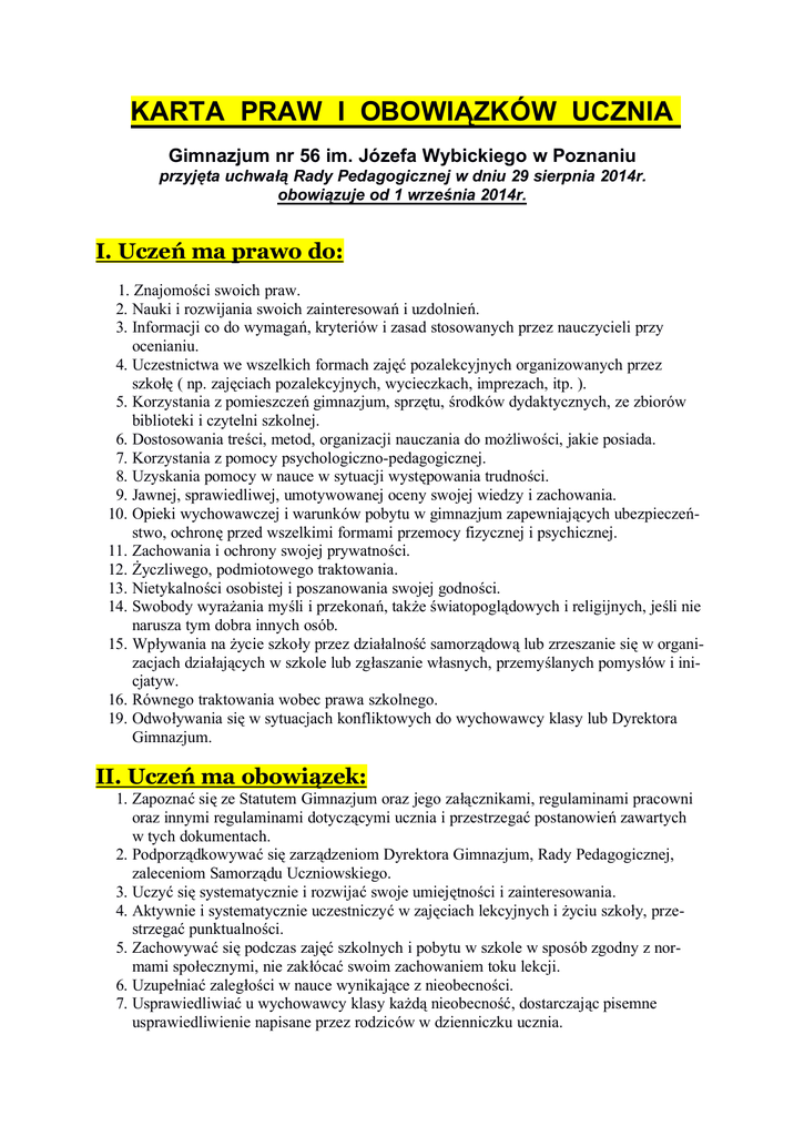KARTA PRAW I OBOWIĄZKÓW UCZNIA Gimnazjum nr 56 im. Józefa Wybickiego w Poznaniu przyjęta uchwałą Rady Pedagogicznej w dniu 29 sierpnia 2014r. obowiązuje od 1 września 2014r. I. Uczeń ma prawo do: 1. Znajomości swoich praw. 2. Nauki i rozwijania swoich zainteresowań i uzdolnień. 3. Informacji co do wymagań, kryteriów i zasad stosowanych przez nauczycieli przy ocenianiu. 4. Uczestnictwa we wszelkich formach zajęć pozalekcyjnych organizowanych przez szkołę ( np. zajęciach pozalekcyjnych, wycieczkach, imprezach, itp. ). 5. Korzystania z pomieszczeń gimnazjum, sprzętu, środków dydaktycznych, ze zbiorów biblioteki i czytelni szkolnej. 6. Dostosowania treści, metod, organizacji nauczania do możliwości, jakie posiada. 7. Korzystania z pomocy psychologiczno-pedagogicznej. 8. Uzyskania pomocy w nauce w sytuacji występowania trudności. 9. Jawnej, sprawiedliwej, umotywowanej oceny swojej wiedzy i zachowania. 10. Opieki wychowawczej i warunków pobytu w gimnazjum zapewniających ubezpieczeństwo, ochronę przed wszelkimi formami przemocy fizycznej i psychicznej. 11. Zachowania i ochrony swojej prywatności. 12. Życzliwego, podmiotowego traktowania. 13. Nietykalności osobistej i poszanowania swojej godności. 14. Swobody wyrażania myśli i przekonań, także światopoglądowych i religijnych, jeśli nie narusza tym dobra innych osób. 15. Wpływania na życie szkoły przez działalność samorządową lub zrzeszanie się w organizacjach działających w szkole lub zgłaszanie własnych, przemyślanych pomysłów i inicjatyw. 16. Równego traktowania wobec prawa szkolnego. 19. Odwoływania się w sytuacjach konfliktowych do wychowawcy klasy lub Dyrektora Gimnazjum. II. Uczeń ma obowiązek: 1. Zapoznać się ze Statutem Gimnazjum oraz jego załącznikami, regulaminami pracowni oraz innymi regulaminami dotyczącymi ucznia i przestrzegać postanowień zawartych w tych dokumentach. 2. Podporządkowywać się zarządzeniom Dyrektora Gimnazjum, Rady Pedagogicznej, zaleceniom Samorządu Uczniowskiego. 3. Uczyć się systematycznie i rozwijać swoje umiejętności i zainteresowania. 4. Aktywnie i systematycznie uczestniczyć w zajęciach lekcyjnych i życiu szkoły, przestrzegać punktualności. 5. Zachowywać się podczas zajęć szkolnych i pobytu w szkole w sposób zgodny z normami społecznymi, nie zakłócać swoim zachowaniem toku lekcji. 6. Uzupełniać zaległości w nauce wynikające z nieobecności. 7. Usprawiedliwiać u wychowawcy klasy każdą nieobecność, dostarczając pisemne usprawiedliwienie napisane przez rodziców w dzienniczku ucznia. 8. Systematycznie przygotowywać się do zajęć szkolnych, wywiązywać się rzetelnie z powierzonych zadań i funkcji. 9. Dbać o swoje zdrowie, higienę osobistą, bezpieczeństwo własne i kolegów, 10. Nie palić papierosów ( w tym również e-papierosów ), nie spożywać alkoholu, nie zażywać środków odurzających. 11. Przeciwstawiać się przejawom agresji i przemocy fizycznej i psychicznej, wszelkim zachowaniom niepożądanym. 12. Okazywać szacunek nauczycielom, innym pracownikom szkoły, swoim kolegom. 13. Kulturalnie zachowywać się w szkole i poza nią, dbać o kulturę słowa. 14. Dbać o honor szkoły, współtworzyć jej dobry wizerunek, godnie reprezentować szkołę na zewnątrz. 15. Szanować symbole państwowe, szkolne, religijne. 16. Szanować poglądy i przekonania innych ludzi, ich godność osobistą. 17. Nosić w czasie zajęć szkolnych odpowiedni strój codzienny, zgodny z postanowieniami Wewnątrzszkolnego Systemu Oceniania Zachowania, a podczas uroczystości stroju galowego, nosić identyfikator, dbać o swój wygląd zewnętrzny. 18. Dbać o atmosferę w klasie i szkole. 19. Dbać o ład i porządek w szkole i terenie przyszkolnym, o mienie szkolne, własne i innych, przeciwdziałać dewastacjom ( za szkody wyrządzone w mieniu szkolnym odpowiadają rodzice ucznia ). 20. Stosować się do szkolnych zakazów dotyczących korzystania z telefonów komórkowych i innych urządzeń elektronicznych podczas zajęć lekcyjnych, samowolnego wychodzenia z budynku szkolnego w czasie trwania lekcji i podczas przerw międzylekcyjnych oraz gry w piłkę i korzystania z urządzeń sportowych podczas spędzania przerw międzylekcyjnych na boisku szkolnym.