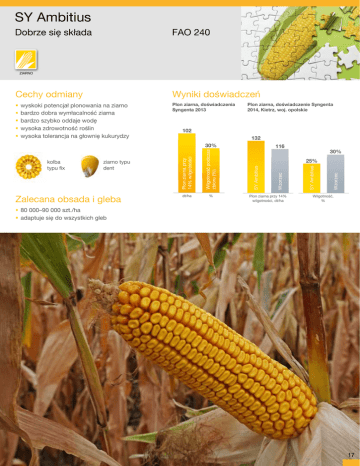 SY Ambitius Dobrze się składa FAO 240 ZIARNO Cechy odmiany Wyniki doświadczeń wyskoki potencjał plonowania na ziarno bardzo dobra wymłacalność ziarna bardzo szybko oddaje wodę wysoka zdrowotność roślin wysoka tolerancja na głownię kukurydzy Plon ziarna, doświadczenia Syngenta 2013 Plon ziarna, doświadczenie Syngenta 2014, Kietrz, woj. opolskie 102 132 Zalecana obsada i gleba Plon ziarna przy 14% wilgotności, dt/ha Wzorzec SY Ambitius % 30% 25% Wzorzec dt/ha 116 SY Ambitius ziarno typu dent Wilgotność podczas zbioru (%) kolba typu fix Plon ziarna przy 14% wilgotności 30% Wilgotność, % 80 000–90 000 szt./ha adaptuje się do wszystkich gleb 17