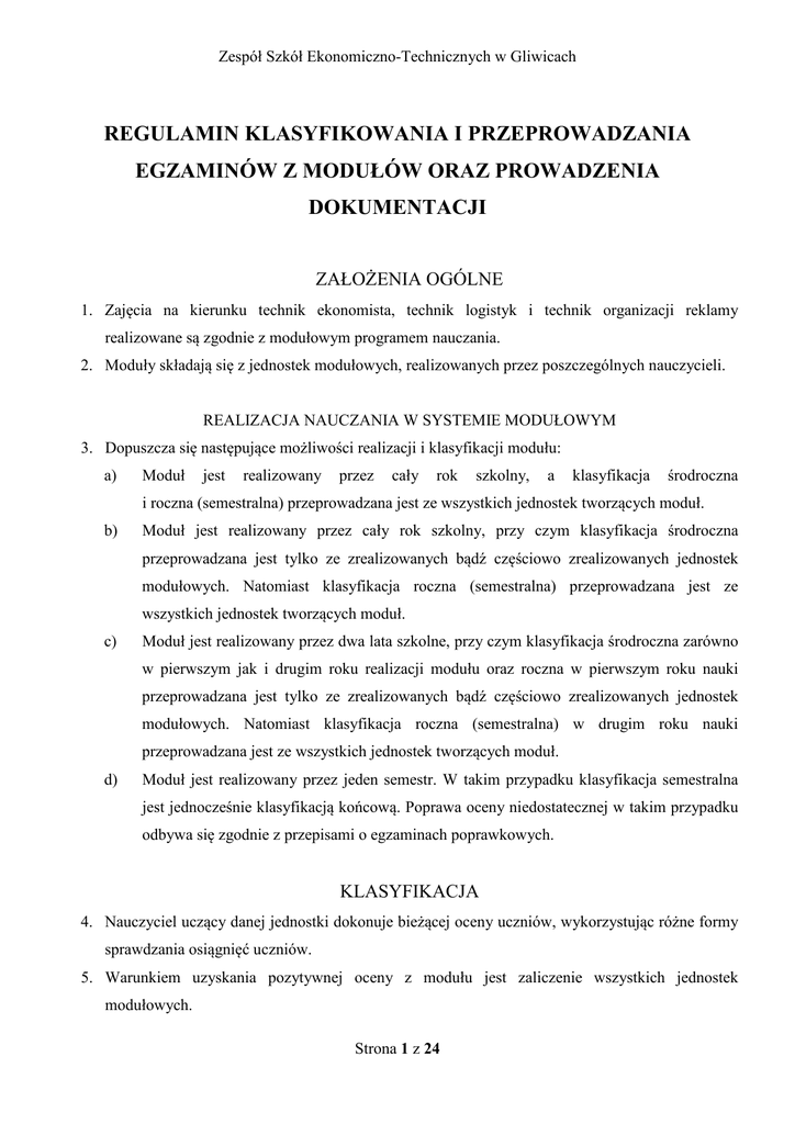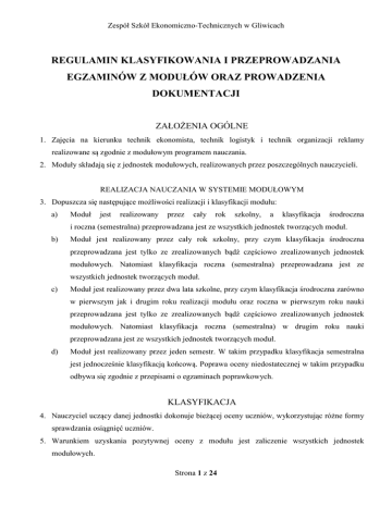 Zespół Szkół Ekonomiczno-Technicznych w Gliwicach REGULAMIN KLASYFIKOWANIA I PRZEPROWADZANIA EGZAMINÓW Z MODUŁÓW ORAZ PROWADZENIA DOKUMENTACJI ZAŁOŻENIA OGÓLNE 1. Zajęcia na kierunku technik ekonomista, technik logistyk i technik organizacji reklamy realizowane są zgodnie z modułowym programem nauczania. 2. Moduły składają się z jednostek modułowych, realizowanych przez poszczególnych nauczycieli. REALIZACJA NAUCZANIA W SYSTEMIE MODUŁOWYM 3. Dopuszcza się następujące możliwości realizacji i klasyfikacji modułu: a) Moduł jest realizowany przez cały rok szkolny, a klasyfikacja środroczna i roczna (semestralna) przeprowadzana jest ze wszystkich jednostek tworzących moduł. b) Moduł jest realizowany przez cały rok szkolny, przy czym klasyfikacja środroczna przeprowadzana jest tylko ze zrealizowanych bądź częściowo zrealizowanych jednostek modułowych. Natomiast klasyfikacja roczna (semestralna) przeprowadzana jest ze wszystkich jednostek tworzących moduł. c) Moduł jest realizowany przez dwa lata szkolne, przy czym klasyfikacja środroczna zarówno w pierwszym jak i drugim roku realizacji modułu oraz roczna w pierwszym roku nauki przeprowadzana jest tylko ze zrealizowanych bądź częściowo zrealizowanych jednostek modułowych. Natomiast klasyfikacja roczna (semestralna) w drugim roku nauki przeprowadzana jest ze wszystkich jednostek tworzących moduł. d) Moduł jest realizowany przez jeden semestr. W takim przypadku klasyfikacja semestralna jest jednocześnie klasyfikacją końcową. Poprawa oceny niedostatecznej w takim przypadku odbywa się zgodnie z przepisami o egzaminach poprawkowych. KLASYFIKACJA 4. Nauczyciel uczący danej jednostki dokonuje bieżącej oceny uczniów, wykorzystując różne formy sprawdzania osiągnięć uczniów. 5. Warunkiem uzyskania pozytywnej oceny z modułu jest zaliczenie wszystkich jednostek modułowych. Strona 1 z 24 Zespół Szkół Ekonomiczno-Technicznych w Gliwicach 6. Oceny śródroczne i roczne (semestralne) z poszczególnych jednostek modułowych nie wchodzą do zestawienia wyników nauczania. 7. Jeżeli w trakcie realizowania modułu uczeń był dwukrotnie klasyfikowany z tej samej jednostki modułowej, wówczas do ustalenia ostatecznej oceny z modułu bierze się pod uwagę ostatni wynik z klasyfikacji tej jednostki. 8. Nauczyciele uczący poszczególnych jednostek modułowych dokonują klasyfikacji śródrocznej i rocznej (semestralnej) najpóźniej 2 dni przed ostatecznym terminem klasyfikacji. 9. Najpóźniej na dzień przed ostatecznym terminem klasyfikacji ZPZ1 ustala oceny z modułu. 10. Przewodniczący ZPZ wyznacza nauczyciela realizującego zajęcia w ramach ocenianego modułu do ustalenia ocen z danego modułu, w danej klasie. 11. Ocenę z modułu ZPZ ustala na podstawie średniej ważonej zgodnie z przyjętymi wagami. Przy czym zakłada się różne wagi dla klasyfikacji śródrocznej i rocznej (semestralnej), jeżeli moduł jest realizowany przez cały rok szkolny, oraz z modułu „Język obcy zawodowy” (załącznik nr 2-4) 12. Dla każdego modułu ustala się inne wagi w zależności od realizowanych jednostek. (załącznik nr 2-4). 13. W przypadku otrzymania jednej lub kilku ocen niedostatecznych z jednostek tworzących moduł, wyklucza się ustalenie oceny z modułu wg średniej ważonej. 14. W trakcie ustalania oceny z modułu stosuje się następujące zasady zaokrąglania: 0,1-0,59 – ocena jest zaokrąglana w dół; 0,60-0,99 – ocena zaokrąglana jest w górę. 15. Oceny śródroczne i roczne (semestralne) z poszczególnych modułów wchodzą do zestawienia wyników nauczania. KLASYFIKACJA – TEST KONTROLNY I PRÓBNY EGZAMIN ZAWODOWY2 TESTY KONTROLNE 16. W celu sprawdzenia stopnia opanowania wiadomości w ramach modułu ZPZ przeprowadza test kontrolny, obejmujący wiadomości ze wszystkich jednostek modułowych. Wyjątkiem jest test kontrolny z modułu: „Ekonomiczno-prawne podstawy gospodarowania”, który nie obejmuje pytań z zakresu jednostki modułowej: „Wykonywanie prac biurowych”. 1 ZPZ – zespół przedmiotów zawodowych. Przez pojęcie „egzamin zawodowy” rozumie się egzamin potwierdzający kwalifikacje zawodowe potwierdzający kwalifikacje w zawodzie. 2 Strona 2 z 24 lub egzamin Zespół Szkół Ekonomiczno-Technicznych w Gliwicach 17. Test kontrolny tworzy zestaw testów z poszczególnych jednostek tworzących moduł. Test z pojedynczej jednostki modułowej składa się z 15 zadań wielokrotnego wyboru, z jedną poprawną odpowiedzią. 18. W wyniku przeprowadzenia testu kontrolnego uczeń otrzymuje oceny z poszczególnych jednostek modułowych, które wliczają się do puli ocen z tych jednostek oraz ocenę za cały test. 19. Zasady oceniania testów kontrolnych są jednolite dla wszystkich jednostek modułowych i modułów (załącznik nr 1). PRÓBNY EGZAMIN ZAWODOWY 20. W celu sprawdzenia stopnia przygotowania ucznia do egzaminu zawodowego, przeprowadza się próbny egzamin potwierdzający kwalifikacje zawodowe lub egzamin potwierdzający kwalifikacje w zawodzie. 21. Próbny egzamin potwierdzający kwalifikacje zawodowe przeprowadza się w klasie IV dla uczniów realizujących tzw. „starą” podstawę programową3 natomiast próbny egzamin potwierdzający kwalifikacje w zawodzie przeprowadza się w klasach realizujących tzw. „nową” podstawę programową4, przed zakończeniem danej kwalifikacji w zawodzie. 22. Uczniowie, którzy nie złożyli deklaracji wyrażającej wolę przystąpienia do egzaminu zawodowego, przystępują do wszystkich testów kontrolnych i egzaminów próbnych zaplanowanych na dany rok szkolny. ZAGADNIENIA WSPÓLNE 23. Ocena z testu i próbnego egzaminu zawodowego ma wpływ na ocenę z modułu wg przyjętej wagi. (załącznik nr 2-6) 24. Test oraz próbny egzamin zawodowy przeprowadzany jest przed wystawieniem oceny rocznej (semestralnej) z modułu na minimum tydzień przed ostatecznym terminem klasyfikacji rocznej (semestralnej). 