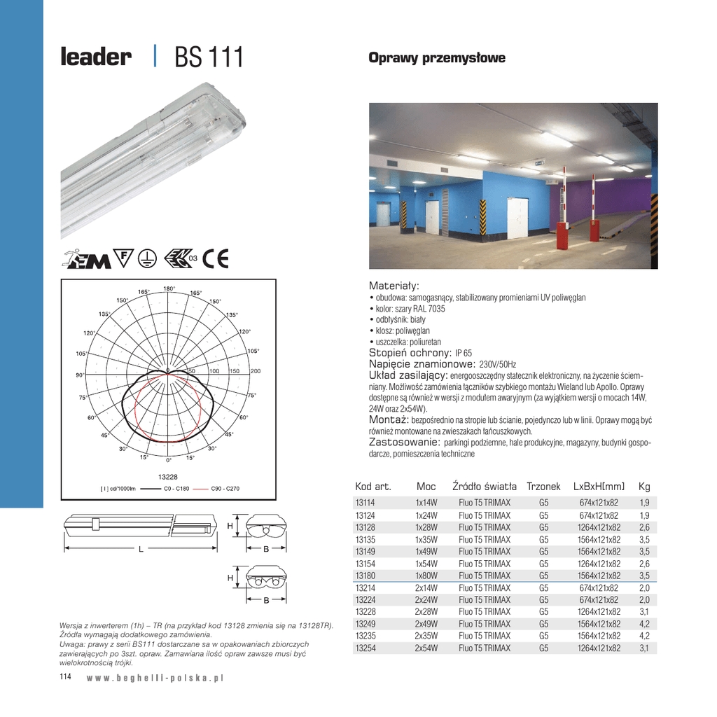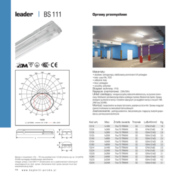 leader BS 111 Oprawy przemysłowe Materiały: Materiały: 50 100 150 200 • •obudowa: obudowa:samogasnący, samogasnący, stabilizowany stabilizowanypromieniami promieniami UV UV poliwęglan poliwęglan • •kolor: kolor:szary szaryRAL RAL7035 7035 • •odbłyśnik: odbłyśnik:biały biały • klosz: • klosz:poliwęglan poliwęglan • •uszczelka: uszczelka:poliuretan poliuretan Stopień 65 Stopień ochrony: ochrony: IPIP65 Napięcie znamionowe: 230V/50Hz Napięcie znamionowe: 230V/50Hz Układ zasilający: energooszczędny statecznik elektroniczny, na życzenie ściemUkład zasilający: energooszczędny statecznik elektroniczny, życzenie niany. Możliwość zamówienia łączników szybkiego montażu Wielandnalub Apollo.ściemniany. Oprawy dostępne również w łączników wersji z modułem (za wyjątkiem wersji o mocach 14W,są Możliwośćsązamówienia szybkiegoawaryjnym montażu Wieland lub Apollo. Oprawy dostępne 24W orazw2x54W). również wersji z modułem awaryjnym (za wyjątkiem wersji o mocach 14W, 24W oraz 2x54W). Montaż: bezpośrednio na Montaż: bezpośrednio na stropie stropie lub lub ścianie, ścianie, pojedynczo pojedynczo lub lub w w linii. linii. Oprawy Oprawy mogą mogą być być również równieżmontowane montowanena nazwieszakach zwieszakachłańcuszkowych. łańcuszkowych. Zastosowanie: parkingi podziemne, hale produkcyjne, magazyny, budynki gospoZastosowanie: parkingi podziemne, hale produkcyjne, magazyny, budynki gospodarcze, pomieszczenia techniczne darcze, pomieszczenia techniczne 13228 Wersja z inwerterem (1h) – TR (na przykład kod 13128 zmienia się na 13128TR). Wersja z inwerterem (1h) – TR (na przykład kod 13128 zmienia się na 13128TR). Źródła wymagają dodatkowego zamówienia. Źródła wymagają dodatkowego zamówienia. sa w opakowaniach zbiorczych Uwaga: prawy z serii BS111 dostarczane Uwaga: prawy zpo serii BS111 dostarczane sa w ilość opakowaniach zbiorczych zawierających 3szt. opraw. Zamawiana opraw zawsze musizawierających być po 3szt. opraw. Zamawiana ilość opraw zawsze musi być wielokrotnością trójki. wielokrotnością trójki. 114 Kod Kod art.art. 13114 13114 1312413124 1312813128 1313513135 1314913149 1315413154 1318013180 1321413214 13224 13224 13228 13228 13249 13249 13235 13235 13254 13254 Moc Moc 1x14W 1x14W 1x24W 1x24W 1x28W 1x28W 1x35W 1x35W 1x49W 1x49W 1x54W 1x54W 1x80W 1x80W 2x14W 2x14W 2x24W 2x24W 2x28W 2x28W 2x49W 2x49W 2x35W 2x35W 2x54W 2x54W światła Źródło światła Fluo T5 TRIMAX Fluo Fluo TRIMAX Fluo T5 TRIMAX Fluo TRIMAX Fluo T5 TRIMAX Fluo T5 TRIMAX Fluo TRIMAX Fluo T5 TRIMAX Fluo TRIMAX Fluo T5 T5 TRIMAX Fluo TRIMAX Fluo T5 T5 TRIMAX Fluo TRIMAX Fluo T5 T5 TRIMAX Fluo TRIMAX Fluo T5 TRIMAX Fluo T5 TRIMAX Fluo T5 TRIMAX Fluo T5 TRIMAX Fluo T5 TRIMAX Fluo T5 TRIMAX Fluo T5 TRIMAX Fluo T5 TRIMAX Fluo T5 TRIMAX Fluo T5 TRIMAX Trzonek (mm) Trzonek LxBxH LxBxH[mm] G5 G5 G5 G5 G5 G5 G5 G5 G5 G5 G5 G5 G5 G5 G5 G5 G5 G5 G5 G5 G5 G5 G5 G5 G5 G5 674x121x82 674x121x82 674x121x82 674x121x82 1264x121x82 1264x121x82 1564x121x82 1564x121x82 1564x121x82 1564x121x82 1264x121x82 1264x121x82 1564x121x82 1564x121x82 674x121x82 674x121x82 674x121x82 674x121x82 1264x121x82 1264x121x82 1564x121x82 1564x121x82 1564x121x82 1564x121x82 1264x121x82 1264x121x82 Kg Kg 1,9 1,9 2,6 2,6 3,5 3,5 3,5 3,5 2,6 2,6 3,5 3,5 2,0 2,0 2,0 2,0 3,1 3,1 4,2 4,2 4,2 4,2 3,1 3,1