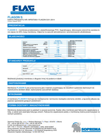 FLAGON S KARTA PRODUKTU NR: WPSIT0501 FLAGON S/01-2014 anulauje i zastępuje kt33-S PREZENTACJA FLAGON S – membrana produkowana z plastyfikowanego PVC. Sygnalizująca, dekoracyjna wierzchnia warstwa to nie więcej niż 25% masy membrany. Odporna na warunki atmosferyczne i promieniowanie ultrafioletowe. WŁAŚCIWOŚCI Grubość Waga Wytrzymałość na rozciąganie (wzdłuż i w poprzek) Wydłużenie przy zerwaniu (mm) (kg/m2) (N/mm²) (%) Wytrzymałość na rozdzieranie (N/mm) Odporność na uderzenie (mm) Odporność na obciążenie statyczne (kg) Giętkość w niskiej temperaturze (°C) Odporność na ciśnienie hydrostatyczne (6 h przy ciśnieniu 0,5 MPa) Trwałość po sztucznym starzeniu FLAGON S 1,5 (+ 10% - 5%) 1,95 (+ 10% - 5%) ≥ 15 ≥ 300 ≥ 80 ≥ 800 ≥ 20 ≤ -30 wodoodporna brak pęknięć METODA TESTOWANIA UNI EN 1849-2 UNI EN 1849-2 UNI EN 12311-2 met. B UNI EN 12311-2 met. B UNI EN 12310-2 UNI EN 12691 UNI EN 12730 UNI EN 495-5 UNI EN 1928 met. B UNI EN 1297 STANDARDY PRODUKCJI Grubość (mm) 1,5 Szerokość (m) 1,05 Długość (m) 20 Kolor wierzch / spód jasnoszary (RAL 7047) /ciemnoszary Możliwość produkcji membrany o długości innej niż podana w tabeli. ZASTOSOWANIE Membrana FLAGON S jest przeznaczona jako materiał uzupełniający do wszelkich systemów dachowych do wykończenia obróbek detali, wykonywania uszczelnień dylatacji. WYKONANIE Z membrany FLAGON S formuje sie mechanicznie i termicznie niezbędne elementy obróbki, a łączenie odbywa się poprzez zgrzewanie gorącym powietrzem FORMA DOSTAWY I MAGAZYNOWANIE Membrana dostarczana jest na paletach w pozycji poziomej. Każda rolka membrany jest fabrycznie zapakowana w folię, a całość jest zawinięta folią typu strech. Fabrycznie zapakowane palety z membraną można przechowywać na wolnym powietrzu Soprema Polska Sp. z o.o. ● Stefana Batorego 7 ● Pass ● 05-870 ● Błonie Tel.: +48 22 436 93 02 ● Fax: +48 22 436 93 06 E-mail: [email protected] ● www.soprema.pl NIP: 778-11-19-419 ● REGON: 630703900 ● KRS: 0000163897 Konto bankowe: Societe Generale 43184000072213616008101819 Sąd Rejonowy dla m.st. Warszawy ● XIII Wydział Gospodarczy KRS Wysokość Kapitału Zakładowego: 12 000 000 PLN CERTYFIKATY Wyrób przeznaczony jest jako element uzupełniający dla elastycznych wyrobów wodochronnych z tworzyw sztucznych. Dla takiego zastosowania nie ma opracowanej normy zharmonizowanej, w związku z czym nie jest wymagane oznakowanie znakiem CE. Zakłady produkcyjne posiadają certyfikaty: system zarządzania jakością UNI EN ISO 9001 system zarządzania środowiskowego UNI EN ISO 14001 UWAGI W związku z własnościami membrany, NIE podlega wymaganiom EEC 79/831 regulującym niebezpieczne substancje. Jeśli produkt będzie w formie odpadu, zalecamy wysłanie go do autoryzowanych wysypisk lub do spalarni z piecem do spalania śmieci wyposażonym w komorę i system oczyszczania spalin. Kolory membran mają barwę zbliżoną do palety RAL. Poszczególne partie produkcyjne wyrobów w standardowych kolorach mogą się nieznacznie różnić odcieniem powierzchni eksponowanej, co nie ma wpywu na ich właściwości użytkowe. W przypadku zamówień membran w kolorach na życzenie, zamówienie dodatkowej partii towaru może wiązać się z różnicami w odcieniach membrany. W sytuacji gdy aspekt estetyczny membrany ma istotne znaczenie, należy zaznaczyć aby cała zamawiana partia towaru pochodziła z tej samej partii produkcyjnej, ewentualnie w przypadku gdy materiał pochodzi z różnych partii produkcyjnych, należy porównać odcienie materiału przed jego zamontowaniem. Powyższe różnice odcieni nie mogą być podstawą do złożenia reklamacji. Soprema Polska Sp. z o.o. ● Stefana Batorego 7 ● Pass ● 05-870 ● Błonie Tel.: +48 22 436 93 02 ● Fax: +48 22 436 93 06 E-mail: [email protected] ● www.soprema.pl NIP: 778-11-19-419 ● REGON: 630703900 ● KRS: 0000163897 Konto bankowe: Societe Generale 43184000072213616008101819 Sąd Rejonowy dla m.st. Warszawy ● XIII Wydział Gospodarczy KRS Wysokość Kapitału Zakładowego: 12 000 000 PLN