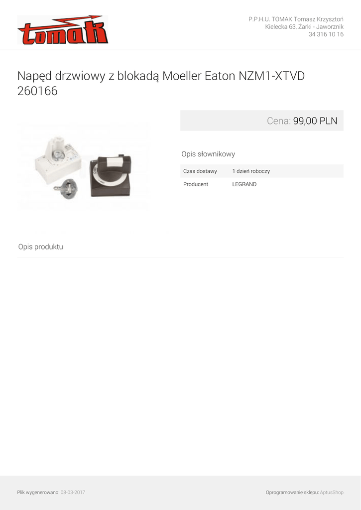 P.P.H.U. TOMAK Tomasz Krzysztoń Kielecka 63, Żarki - Jaworznik 34 316 10 16 Napęd drzwiowy z blokadą Moeller Eaton NZM1-XTVD 260166 Cena: 99,00 PLN Opis słownikowy Czas dostawy 1 dzień roboczy Producent LEGRAND Opis produktu Plik wygenerowano: 08-03-2017 Powered by TCPDF (www.tcpdf.org) Oprogramowanie sklepu: AptusShop