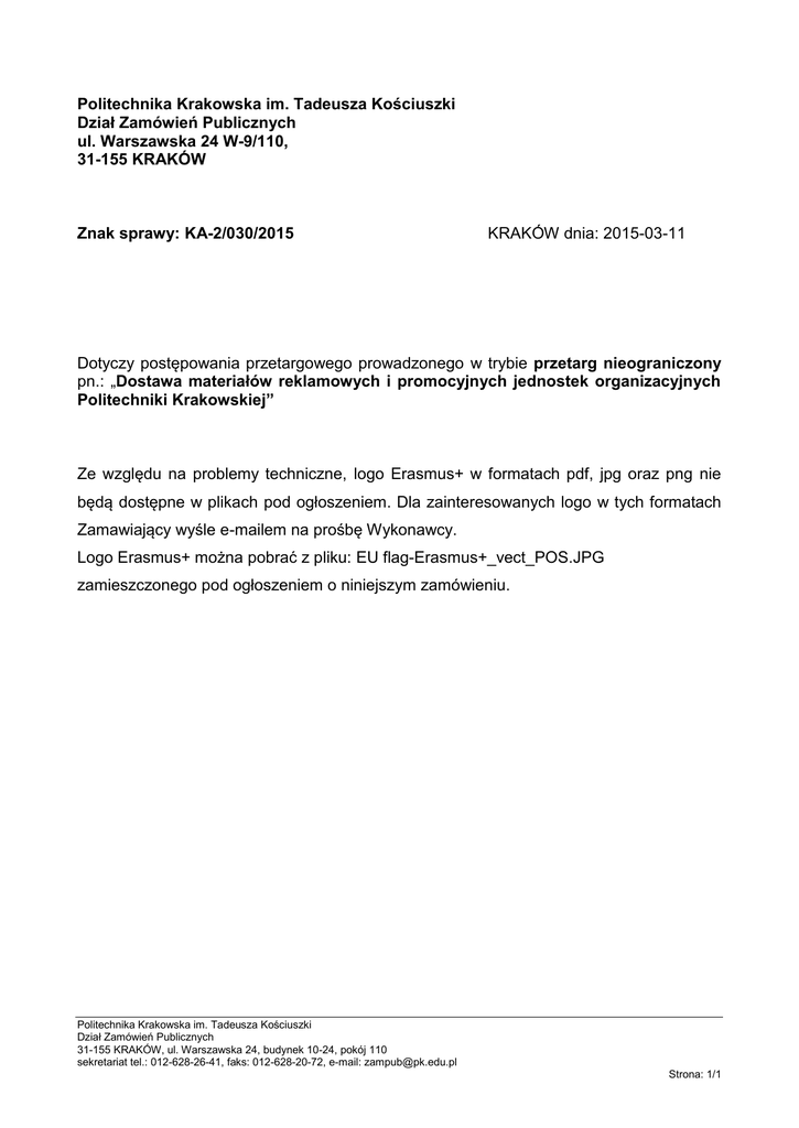 Politechnika Krakowska im. Tadeusza Kościuszki Dział Zamówień Publicznych ul. Warszawska 24 W-9/110, 31-155 KRAKÓW Znak sprawy: KA-2/030/2015 KRAKÓW dnia: 2015-03-11 Dotyczy postępowania przetargowego prowadzonego w trybie przetarg nieograniczony pn.: „Dostawa materiałów reklamowych i promocyjnych jednostek organizacyjnych Politechniki Krakowskiej” Ze względu na problemy techniczne, logo Erasmus+ w formatach pdf, jpg oraz png nie będą dostępne w plikach pod ogłoszeniem. Dla zainteresowanych logo w tych formatach Zamawiający wyśle e-mailem na prośbę Wykonawcy. Logo Erasmus+ można pobrać z pliku: EU flag-Erasmus+_vect_POS.JPG zamieszczonego pod ogłoszeniem o niniejszym zamówieniu. Politechnika Krakowska im. Tadeusza Kościuszki Dział Zamówień Publicznych 31-155 KRAKÓW, ul. Warszawska 24, budynek 10-24, pokój 110 sekretariat tel.: 012-628-26-41, faks: 012-628-20-72, e-mail: [email protected] Strona: 1/1