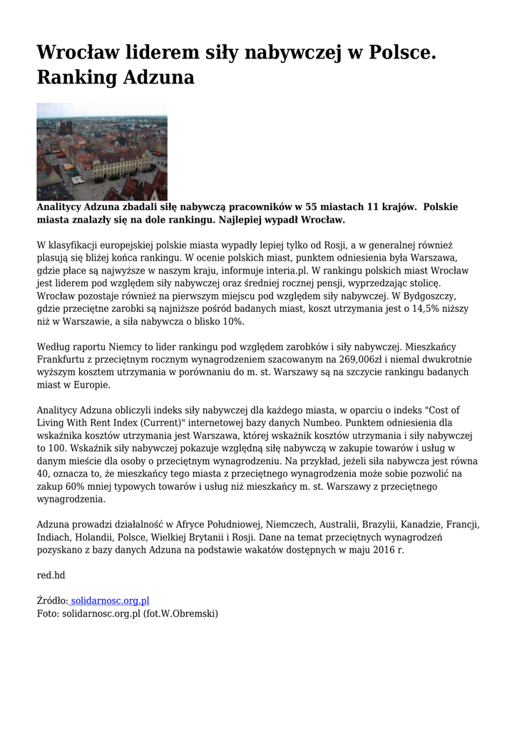 Wrocław liderem siły nabywczej w Polsce. Ranking Adzuna Analitycy Adzuna zbadali siłę nabywczą pracowników w 55 miastach 11 krajów. Polskie miasta znalazły się na dole rankingu. Najlepiej wypadł Wrocław. W klasyfikacji europejskiej polskie miasta wypadły lepiej tylko od Rosji, a w generalnej również plasują się bliżej końca rankingu. W ocenie polskich miast, punktem odniesienia była Warszawa, gdzie płace są najwyższe w naszym kraju, informuje interia.pl. W rankingu polskich miast Wrocław jest liderem pod względem siły nabywczej oraz średniej rocznej pensji, wyprzedzając stolicę. Wrocław pozostaje również na pierwszym miejscu pod względem siły nabywczej. W Bydgoszczy, gdzie przeciętne zarobki są najniższe pośród badanych miast, koszt utrzymania jest o 14,5% niższy niż w Warszawie, a siła nabywcza o blisko 10%. Według raportu Niemcy to lider rankingu pod względem zarobków i siły nabywczej. Mieszkańcy Frankfurtu z przeciętnym rocznym wynagrodzeniem szacowanym na 269,006zł i niemal dwukrotnie wyższym kosztem utrzymania w porównaniu do m. st. Warszawy są na szczycie rankingu badanych miast w Europie. Analitycy Adzuna obliczyli indeks siły nabywczej dla każdego miasta, w oparciu o indeks "Cost of Living With Rent Index (Current)" internetowej bazy danych Numbeo. Punktem odniesienia dla wskaźnika kosztów utrzymania jest Warszawa, której wskażnik kosztów utrzymania i siły nabywczej to 100. Wskaźnik siły nabywczej pokazuje względną siłę nabywczą w zakupie towarów i usług w danym mieście dla osoby o przeciętnym wynagrodzeniu. Na przykład, jeżeli siła nabywcza jest równa 40, oznacza to, że mieszkańcy tego miasta z przeciętnego wynagrodzenia może sobie pozwolić na zakup 60% mniej typowych towarów i usług niż mieszkańcy m. st. Warszawy z przeciętnego wynagrodzenia. Adzuna prowadzi działalność w Afryce Południowej, Niemczech, Australii, Brazylii, Kanadzie, Francji, Indiach, Holandii, Polsce, Wielkiej Brytanii i Rosji. Dane na temat przeciętnych wynagrodzeń pozyskano z bazy danych Adzuna na podstawie wakatów dostępnych w maju 2016 r. red.hd Źródło: solidarnosc.org.pl Foto: solidarnosc.org.pl (fot.W.Obremski)