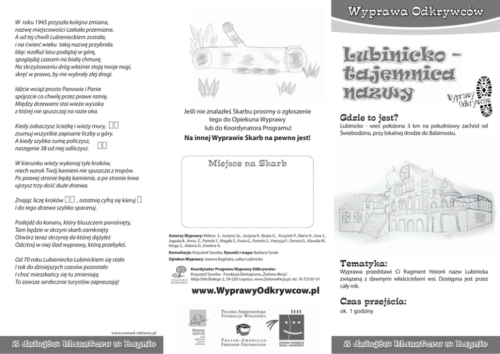 Wyprawa Odkrywców W roku 1945 przyszła kolejna zmiana, nazwę miejscowości czekała przemiana. A od tej chwili Lubienieckiem została, i na ćwierć wieku taką nazwę przybrała. Idąc wzdłuż lasu podążaj w górę, spoglądaj czasem na białą chmurę. Na skrzyżowaniu dróg właśnie stoją twoje nogi, skręć w prawo, by nie wybrały złej drogi. Idźcie wciąż prosto Panowie i Panie spójrzcie co chwilę przez prawe ramię. Między drzewami stoi wieża wysoka z której nie spuszczaj na razie oka. Kiedy zobaczysz ścieżkę i wieży mury, zsumuj wszystkie zapisane liczby u góry. A kiedy szybko sumę policzysz, następnie 38 od niej odliczysz. W kierunku wieży wykonaj tyle kroków, niech wzrok Twój kamieni nie spuszcza z tropów. Po prawej stronie będą kamienie, a po stronie lewa ujrzysz trzy dość duże drzewa. Lubinicko – tajemnica nazwy Jeśli nie znalazłeś Skarbu prosimy o zgłoszenie tego do Opiekuna Wyprawy lub do Koordynatora Programu! Na innej Wyprawie Skarb na pewno jest! Gdzie to jest? Lubinicko - wieś położona 3 km na południowy zachód od Świebodzina, przy lokalnej drodze do Babimostu. Miejsce na Skarb Znając liczę kroków , ostatnią cyfrą się kieruj I do tego drzewa szybko spaceruj. Podejdź do konaru, który bluszczem porośnięty, Tam będzie w skrzyni skarb zamknięty Otwórz teraz skrzynię do której dążyłeś Odciśnij w niej ślad wyprawy, którą przebyłeś. Autorzy Wyprawy: Milena S., Justyna Sz., Justyna R., Beata G. , Krzysiek P., Marta K., Ewa S., Jagoda B., Anna Z., Pamela T., Magda Z., Kasia G., Pamela Z., Patrycja F., Dorota G., Klaudia W., Kinga Z., Aldona D., Ewelina A. Konsultacje: Krzysztof Szustka, Rysunki i mapa: Barbara Tyrała Od 70 roku Lubieniecko Lubinickiem się stało I tak do dzisiejszych czasów pozostało I choć mieszkańcy się tu zmieniają To zawsze serdecznie turystów zapraszają! Opiekun Wyprawy: Joanna Bagińska, sołtys Lubinicka Koordynator Programu Wyprawy Odkrywców: Krzysztof Szustka - Fundacja Ekologiczna „Zielona Akcja”, Aleja Orła Białego 2, 59-220 Legnica, www.ZielonaAkcja.pl, tel. 76 723 81 01 www.WyprawyOdkrywcow.pl Tematyka: Wyprawa przedstawi Ci fragment historii nazw Lubinicka związaną z dawnymi właścicielami wsi. Dostępna jest przez cały rok. Czas przejścia: ok. 1 godziny www.nomad-reklama.pl Z dziejów klasztoru w Bagnie Z dziejów klasztoru w Bagnie Jak szukać skarbu? Wyprawę należy zacząć z placu przy wejściu do kościoła. Podczas wędrówki bacznie rozglądaj się i uważnie czytaj wskazówki. Przyda Ci się umiejętność liczenia i długopis do zapisywania. Trasa Wyprawy prowadzi wokół kościoła przez dróżki i ścieżki. Dostosuj swoje ubranie do panującej pogody. Wyprawę rozpoczynamy od głównego wejścia do Kościoła. Życzymy udanej zabawy! Liczbę drzew uważnie zsumowałeś i pierwszą cyfrę w końcu poznałeś. 1 Wioski nazwa stąd pochodzi, że komes Janusz z niskich terenów się wywodzi. Nazwa Magrnasdorf z dawna pochodzi I od Niemca się wywodzi W roku 1311 powstała i cała ludność ją poznała. Więc ją nazwał jak uważał i Lubinisco cystersom zaraz przekazał. Za kościołem pomnik niemiecki stoi, policz na ile pionowych kawałków się on kroi. Spod nich żwawo, wprost przed siebie tam przystanek jest dla Ciebie. Dalej w lewo chodnik zwodzi tak do Pałacu się dochodzi. Tym sposobem tą drugą liczbę zyskałeś i obok ją rzetelnie wpisałeś. 2 Teraz o nas więcej wiesz szukaj skarbu tam gdzie jest. Po dwóch wiekach znowu zmiana Wieś Merzdorfem jest nazwana W tym Pałacu tu opodal w karty przegrał nas gospodarz. Cystersi nazwę wioski znów zmienili, po 50 latach Villę Martini stworzyli. Kościół Świętego Marcina powstał i spokój na wiele lat pozostał. Dalej liczysz słupki w murze Wiedz, że są bardzo duże. 5 Za słupkami skręcasz w lewo, tam gdzie rośnie stare drzewo. Witamy w Lubinicku, miejscu mało znanym przez nas w sercu głęboko chowanym. Wielu właścicieli tutaj było i dlatego wiele nazw wioski utworzyło. Gdy teraz poznałeś rąbka tajemnicy nad Chrystusem Królem zlicz napisy. W miejsce wyznaczone liczbę tę wpisz 3 abyś tą drogą mógł dalej iść Gdy się zachwycisz miejsca widokiem idź dalej prosto pewnym krokiem. Nie skręcaj nigdzie w lewo i w prawo spójrz teraz w górę i podążaj żwawo. Spod pomnika Chrystusa Wielkiego tutaj przybyłeś do Króla Wszechświata naszego trafiłeś. Gdy przyjechałeś już do miejsca tego, to policz kasztanowe drzewa wokół kościoła naszego. Spod Chrystusa w dół drogą prostą idź gdzie trzy wielkie lipy rosną. Za lipami skrzynka stoi policz białe litery powoli Miniesz płot - sad tam będzie, policz drzewka w pierwszym rzędzie 6 Pobądź tu chwilę, bo droga czeka przed Tobą jeszcze podróż daleka. Z dziejów klasztoru w Bagnie 4 Z dziejów klasztoru w Bagnie Z dziejów klasztoru w Bagnie