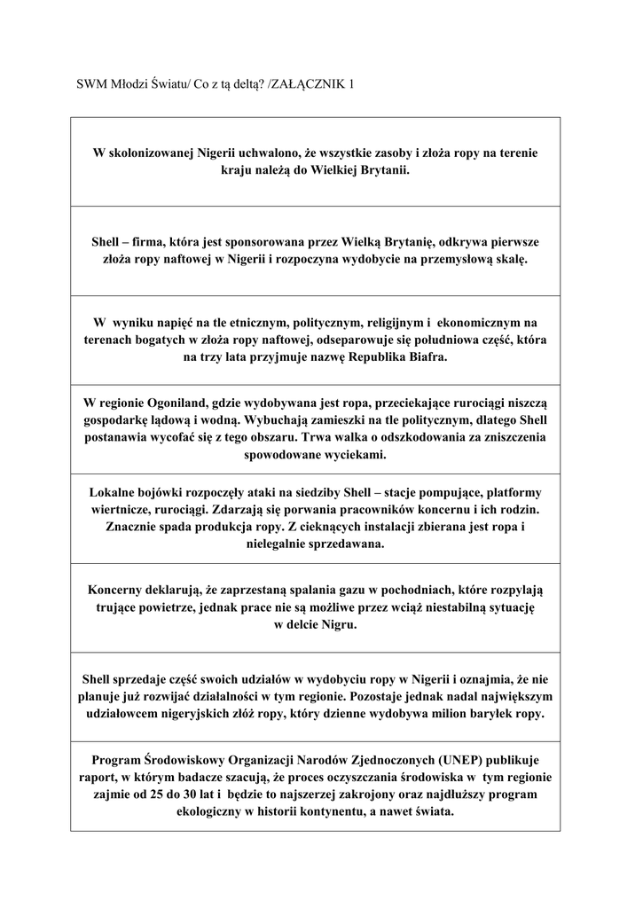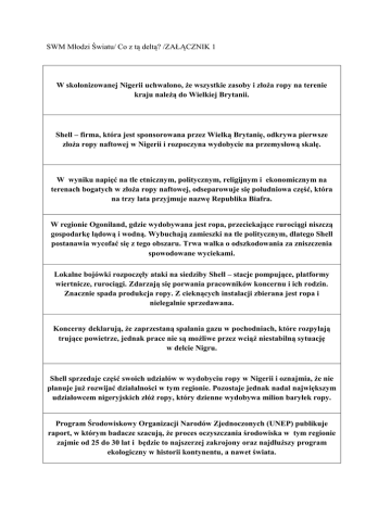 SWM Młodzi Światu/ Co z tą deltą? /ZAŁĄCZNIK 1 W skolonizowanej Nigerii uchwalono, że wszystkie zasoby i złoża ropy na terenie kraju należą do Wielkiej Brytanii. Shell – firma, która jest sponsorowana przez Wielką Brytanię, odkrywa pierwsze złoża ropy naftowej w Nigerii i rozpoczyna wydobycie na przemysłową skalę. W wyniku napięć na tle etnicznym, politycznym, religijnym i ekonomicznym na terenach bogatych w złoża ropy naftowej, odseparowuje się południowa część, która na trzy lata przyjmuje nazwę Republika Biafra. W regionie Ogoniland, gdzie wydobywana jest ropa, przeciekające rurociągi niszczą gospodarkę lądową i wodną. Wybuchają zamieszki na tle politycznym, dlatego Shell postanawia wycofać się z tego obszaru. Trwa walka o odszkodowania za zniszczenia spowodowane wyciekami. Lokalne bojówki rozpoczęły ataki na siedziby Shell – stacje pompujące, platformy wiertnicze, rurociągi. Zdarzają się porwania pracowników koncernu i ich rodzin. Znacznie spada produkcja ropy. Z cieknących instalacji zbierana jest ropa i nielegalnie sprzedawana. Koncerny deklarują, że zaprzestaną spalania gazu w pochodniach, które rozpylają trujące powietrze, jednak prace nie są możliwe przez wciąż niestabilną sytuację w delcie Nigru. Shell sprzedaje część swoich udziałów w wydobyciu ropy w Nigerii i oznajmia, że nie planuje już rozwijać działalności w tym regionie. Pozostaje jednak nadal największym udziałowcem nigeryjskich złóż ropy, który dzienne wydobywa milion baryłek ropy. Program Środowiskowy Organizacji Narodów Zjednoczonych (UNEP) publikuje raport, w którym badacze szacują, że proces oczyszczania środowiska w tym regionie zajmie od 25 do 30 lat i będzie to najszerzej zakrojony oraz najdłuższy program ekologiczny w historii kontynentu, a nawet świata.