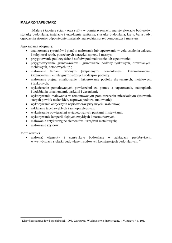 MALARZ-T AP E C I ARZ „ Ma l u j e i t a p e t u j e ś c i a n y o r a z s u f i t y w p o m i e s z c z e n i a c h , m a l u j e e l e w a c j e b u d y n k ó w , s to la rk ę b u d o w la n ą , in s ta la c je i u rz ą d z e n ia s a n ita rn e , ś lu s a rk ę b u d o w la n ą , k ra ty , b a lu s tra d y , o g ro d z e n ia s to s u ją c o d p o w ie d n ie m a te ria ły , n a rz ę d z ia , s p rz ę t p o m o c n ic z y i m a s z y n y . J e g o z a d a n ia o b e jm u ją : • a n a liz o w a n ie ry s u n k ó w i p la n ó w m a lo w a n ia lu b ta p e to w a n ia w c e lu u s ta le n i k o le jn o ś c i ro b ó t, p o trz e b n y c h n a rz ę d z i, s p rz ę tu i m a s z y n ; • p rz y g o to w a n ie p o d ło ż y ś c ia n i s u fitó w p o d m a lo w a n ie lu b ta p e to w a n ie ; • p rz y g o to w y w a n ie g ru n to w n ik ó w i g ru n to w a n ie p o d ło ż y ty n k o w y c h , d re m e b lo w y c h , b e to n o w y c h itp .; • m a lo w a n ie fa rb a m i w o d n y m i (w a p ie n n y m i, c e m e n to w y m i, k rz e m k a z e in o w y m i i e m u ls y jn y m i) ró ż n y c h ro d z a jó w p o d ło ż y ; • m a lo w a n ie o le jn e , e m a lio w a n ie i la k ie ro w a n ie p o d ło ż y d re w n ia n y c h , m i ty n k o w y c h ; • w y k a ń c z a n ie p o m a lo w a n y c h p o w ie rz c h n i z a p o m o c ą ta p e to w a n ia , n i o z d a b ia n ia o rn a m e n ta m i, p a s k a m i i d e s e n ia m i; • w y k o n y w a n ie m a lo w a n ia w re m o n to w a n y m p o m ie s z c z e n iu m ie s z k a ln y m s ta ry c h p o w ło k m a la rs k ic h , n a p ra w a p o d ło ż a , m a lo w a n ie ); • w y k o n y w a n ie o d rę c z n y c h n a p is ó w o ra z p rz y u ż y c iu s z a b lo n ó w ; • n a k le ja n ie ta p e t z w y k ły c h i s a m o p rz y le p n y c h ; • w y k a ń c z a n ie p o w ie rz c h n i w y ta p e to w a n y c h p a s k a m i i lis te w k a m i; • w y k o n y w a n ie la m p e rii o le jn y c h z w y k ły c h i m a rm u rk o w y c h ; • m a lo w a n ie a n ty k o ro z y jn e e le m e n tó w i u rz ą d z e ń m e ta lo w y c h ; • m a lo w a n ie s z y ld ó w ; ia z a k re s u w n ia n y c h , ia n o w y m i, e ta lo w y c h a k ra p ia n ia (u s u w a n ie Mo ż e r ó w n i e ż : • m a lo w a ć e le m e n ty i k o n s tru k c je b u d o w la n e w z a k ła d a c h p re fa b ry k a c ji, w w y t w ó r n i a c h s t o l a r k i b u d o w l a n e j i s t a l o w y c h k o n s t r u k c j a c h b u d o w l a n y c h . ”1 1 Klasyfikacja zawodów i specjalności, 1996, Warszawa, Wydawnictwo Statystyczne, t. V , zeszyt 7 , s. 10 1.