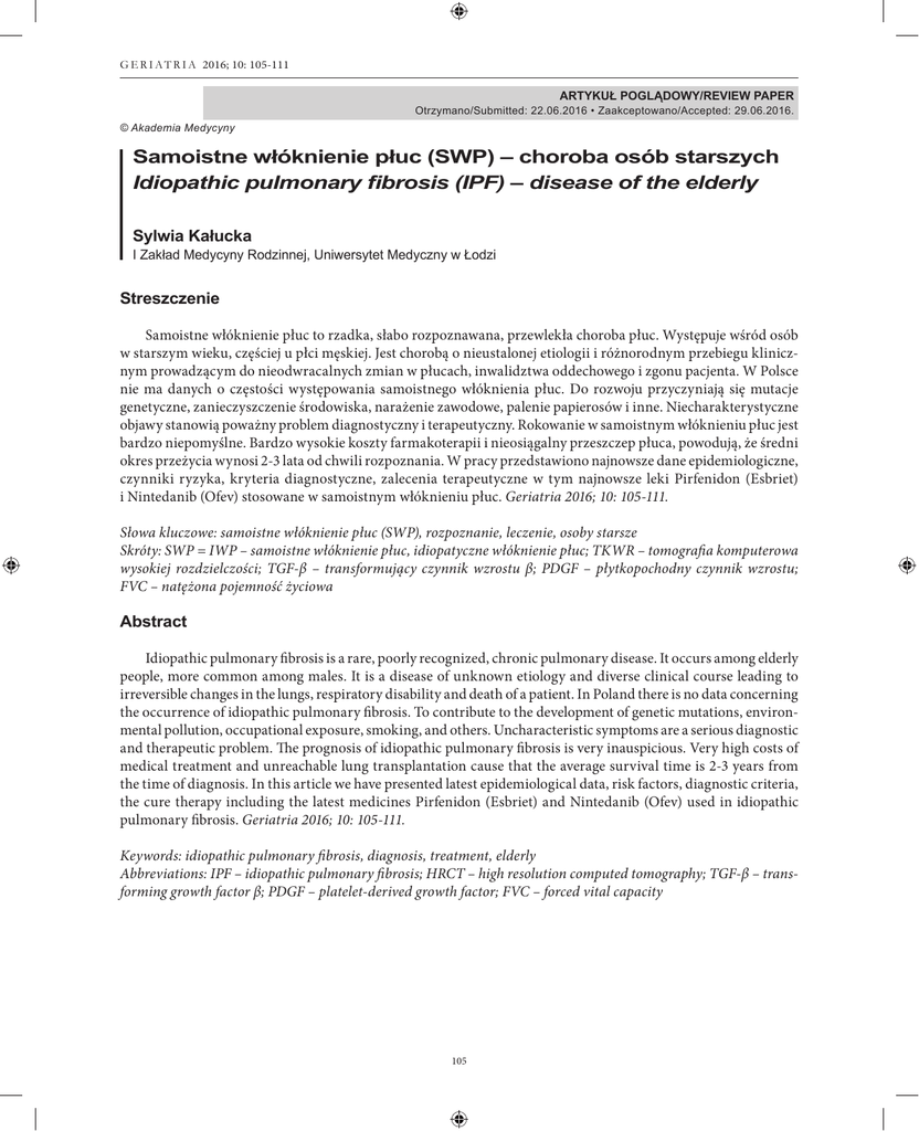 G E R I A T R I A 2016; 10: 105-111 ARTYKUŁ POGLĄDOWY/REVIEW PAPER Otrzymano/Submitted: 22.06.2016 • Zaakceptowano/Accepted: 29.06.2016. © Akademia Medycyny Samoistne włóknienie płuc (SWP) – choroba osób starszych Idiopathic pulmonary fibrosis (IPF) – disease of the elderly Sylwia Kałucka I Zakład Medycyny Rodzinnej, Uniwersytet Medyczny w Łodzi Streszczenie Samoistne włóknienie płuc to rzadka, słabo rozpoznawana, przewlekła choroba płuc. Występuje wśród osób w starszym wieku, częściej u płci męskiej. Jest chorobą o nieustalonej etiologii i różnorodnym przebiegu klinicznym prowadzącym do nieodwracalnych zmian w płucach, inwalidztwa oddechowego i zgonu pacjenta. W Polsce nie ma danych o częstości występowania samoistnego włóknienia płuc. Do rozwoju przyczyniają się mutacje genetyczne, zanieczyszczenie środowiska, narażenie zawodowe, palenie papierosów i inne. Niecharakterystyczne objawy stanowią poważny problem diagnostyczny i terapeutyczny. Rokowanie w samoistnym włóknieniu płuc jest bardzo niepomyślne. Bardzo wysokie koszty farmakoterapii i nieosiągalny przeszczep płuca, powodują, że średni okres przeżycia wynosi 2-3 lata od chwili rozpoznania. W pracy przedstawiono najnowsze dane epidemiologiczne, czynniki ryzyka, kryteria diagnostyczne, zalecenia terapeutyczne w tym najnowsze leki Pirfenidon (Esbriet) i Nintedanib (Ofev) stosowane w samoistnym włóknieniu płuc. Geriatria 2016; 10: 105-111. Słowa kluczowe: samoistne włóknienie płuc (SWP), rozpoznanie, leczenie, osoby starsze Skróty: SWP = IWP – samoistne włóknienie płuc, idiopatyczne włóknienie płuc; TKWR – tomografia komputerowa wysokiej rozdzielczości; TGF-β – transformujący czynnik wzrostu β; PDGF – płytkopochodny czynnik wzrostu; FVC – natężona pojemność życiowa Abstract Idiopathic pulmonary fibrosis is a rare, poorly recognized, chronic pulmonary disease. It occurs among elderly people, more common among males. It is a disease of unknown etiology and diverse clinical course leading to irreversible changes in the lungs, respiratory disability and death of a patient. In Poland there is no data concerning the occurrence of idiopathic pulmonary fibrosis. To contribute to the development of genetic mutations, environmental pollution, occupational exposure, smoking, and others. Uncharacteristic symptoms are a serious diagnostic and therapeutic problem. The prognosis of idiopathic pulmonary fibrosis is very inauspicious. Very high costs of medical treatment and unreachable lung transplantation cause that the average survival time is 2-3 years from the time of diagnosis. In this article we have presented latest epidemiological data, risk factors, diagnostic criteria, the cure therapy including the latest medicines Pirfenidon (Esbriet) and Nintedanib (Ofev) used in idiopathic pulmonary fibrosis. Geriatria 2016; 10: 105-111. Keywords: idiopathic pulmonary fibrosis, diagnosis, treatment, elderly Abbreviations: IPF – idiopathic pulmonary fibrosis; HRCT – high resolution computed tomography; TGF-β – transforming growth factor β; PDGF – platelet-derived growth factor; FVC – forced vital capacity 105 105