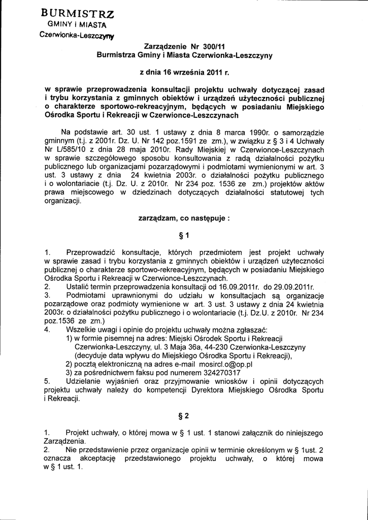 B URMISTRZ G M I N Yi M I A S T A Czemlonka-Leszczy.ly ZarzqdzenieNr 300/11 BurmistrzaGminy i MiastaCzerwionka-Leszczyny z dnia 16wrze6nia2011r. w sprawie przeprowadzeniakonsultacji projektu uchwaly dotyczqcejzasad i trybu korzystania z gminnych obiekt6w t urzqdzefi u2yteczno6cipublicznej o charakterzesportowo-rekreacyjtryffi, bgd4cych w posiadaniu Miejskiego O6rodkaSportui Rekreacjiw Czerwionce-Leszczynach Na podstawieart. 30 ust. 1 ustawyz dnia 8 marca 1990r.o samorzqdzie gminnym (t.i.22001r. Dz.U. Nr 142po2.1591 ze zm.),wzwiqzku z S 3 i4 Uchwaly Nr L/585/10z dnia 28 maja 2010r.Rady Miejskiejw Czenruionce-Leszczynach w sprawieszczeg6lowego pozytku sposobukonsultowania z radq dzialalnoSci publicznego pozarzqdowymi lub organizacjami i podmiotami wymienionymi w art. 3 ust. 3 ustawyz dnia 24 kwietnia2003r.o dziatalno6ci pozytkupublicznego (t.j. Dz. U. z 2010r. Nr 234 poz. 1536ze zm.) projekt6waktow i o wolontariacie prawa miejscowegow dziedzinachdotycz4cychdzialalnoScistatutowej tych organizacji. zarzqdzam,co nastgpuje : s1 1. Przeprowadzickonsultacje,kt6rych przedmiotemjest projekt uchwaly w sprawiezasadi trybu korzystania z gminnychobiektowi urzqdzenuZytecznoSci publicznej o charakterze sportowo-rekreacyjnym, bgdqcychw posiadaniu Miejskiego O6rodkaSportui Rekreacji w Czerwionce-Leszczynach. 2. Ustalicterminprzeprowadzenia konsultacji od 16.09.2011r. do 29.09.2011r. 3. Podmiotamiuprawnionymi do udzialu w konsultacjach sE organizacje pozarzqdowe podmioty oraz wymienione w art. 3 ust. 3 ustawyz dnia 24 kwietnia pozytkupublicznego 2003r.o dzialalnoSci (t.j.Dz.U.z 2010r.Nr 234 i o wolontariacie po2.1536ze zm.) 4. Wszelkieuwagii opiniedo projektuuchwatymoznazglaszac: 1)w formiepisemnej na adres:MiejskiO6rodek Sportui Rekreacji Czerwionka-Leszczyny, ul. 3 Maja 36a,44-230Czerwion ka-Leszczyny (decyduje datawptywudo Miejskiego O6rodkaSportui Rekreacji), 2) pocztqelektron icznEna adrese-maiI [email protected] 3) za posrednictwem faksupodnumerem 324270317 5. Udzielaniewyja6nienoraz przyjmowaniewnioskow i opinii dotyczqcych projektuuchwaly naleZydo kompetencjiDyrektoraMiejskiegoO5rodkaSportu i Rekreacji. s2 1. Projektuchwaly,o ktorejmowaw S 1 ust. 1 stanowizalqcznikdo niniejszego Zarzqdzenia. przezorganizacje 2. Nieprzedstawienie opiniiw terminieokre6lonym w S 1ust.2 oznacza akceptacjg przedstawionegoprojektu uchwaly, o ktoreJ mowa wS 1 ust.1. s3. 1. Sprawozdaniez przeprowadzonych konsultacjizostanie przedstawione RadzieMiejskiej. 2. Do sprawozdania,o ktorym mowa w ust. 1 Burmistrzzalqczywlasne je na stronieinternetowej stanowisko odnoSnie uzyskanych opiniii opublikuje Urzgdu Gminyi Miastaw Czenvionce-Leszczynach. s4. Wykonanie Zarzqdzeniapowierzam DyrektorowiMiejskiego OSrodka Sportu i Rekreacji. s5. Zarzqdzenie wchodziw zyciez dniemwydania. UchwalaNr .............. .............111 RadyMiejskiejw Czenuionce-Leszczynach z dnia 2011r. w sprawieustaleniazasadi trybu korzystaniaz gminnychobiekt6wi urzqdzefiu2yteczno5ci publicznejo charakterzesportowo-rekreacyjnym, bgdqcychw posiadaniuMiejskiegoO6rodkaSportu i Rekreacjiw Czenarionce-Leszczynach gminnym(t. Na podstawie art.40 ust.2 pkt4, art.41ust.1 ustawyz dnia8 marca1990rokuo samozqdzie j. Dz.U.22001r.Nr 142,poz.1591zp62niejszymizmianami) iart.4 ust.1 pkt2 iust.2 ustawyzdnia20 grudnia1996rokuo gospodarce (t.j.Dz.U.22011r. Nr 45,poz.236z po2niejszymi komunalnej zmianami) RadaMiejskaw Czeruvionce-Leszczynach uchwala: s1. publicznej, Ustalidzasadyi trybkozyslaniaz gminnychobiekt6wi urzqdzefiuZytecznoSci o charakteze bgdqcychw posiadaniu Miejskiego sportowo-rekreacyjnym, O6rodkaSportui RekreacjiCzerwionceLeszczynach, okreSlone w zalqczniku do niniejszej uchwaly. s2. BurmistzaGminyi MiastaCzerwionka-Leszczyny do ustaleniawysoko5cioplatzakorzystanie Upowaznid publicznej, z gminnychobiekt6wi uzqdzehu2ytecznoSci o kt6rychmowaw $ 1 uchwaly s3. Tracimoc: - uchwalanr XLVII/563/10 z dnia 26 marca2010 r. w sprawie RadyMiejskiejw Czerwionce-Leszczynach z krytejplywalniorazkqpieliska w Czenrvionce-Leszczynach ustalenia zasadkorzystania s4. Gminyi MiastaCzerwionka-Leszczyny. Wykonanie Uchwalypowiezasig Burmistzowi s5. Uchwalawchodziw Zycie po uplywie14 dni od jej ogloszeniaw DziennikuUrzqdowymWojew6dztwa Slqskiego. A, l4{e ?' zArAczNrK do UchwalyNr ...........................111 RadyMiejskiejw Czenrionce-Leszczynach z dnia 2011r. Zasadyitryb korzystaniaz gminnychobiekt6wi urz4dzeriu2yteczno5cipublicznejo charakterze sportowo-rekreacyjnym, bgd4cychw posiadaniuMiejskiegoO5rodkaSportu i Rekreacjiw Czenrionce-Leszczynach s1. llekro6w niniejszej uchwalemowao: - rozumiesiqprzezto Gmingi MiastoCzenvionka-Leszczyny 1) GminielubGminiei MieScie ; - rozumiesiq pzez to MiejskiOSrodek 2) O6rodku Sportui Rekreacjiw Czerwionce(MOSiR); Leszczynach - rozumiesig przezto obiektyi 3) Gminnychobiektachi uz4dzeniachu2yteczno5ci publicznej publicznej uzqdzeniauZytecznoSci o charaktezesportowo-rekreacyjnym, bgdqcew posiadaniu Miejskiego O5rodkaSportui Rekreacji w Czerwionce-Leszczynach; 4) lmprezie- rozumiesig pzez to planowane zajqcie- na podstawieUmowy- obiektui pzez przeprowadzenia pzedstawienia, uzqdzenia otganizatora w celu spotkania, koncertu, zawodow, pokazulubzabawy. treningu, s2. publicznej Gminneobiektyi urzEdzenia u2ytecznoSci sq o96lnodostgpne. s3. publicznej 1. Korzystanie z obiekt6wi urzqdzefiu2ytecznoSci mo2eodbywadsiq: 1) odplatnie, 2) nieodplatnie. publicznym pzypadkach 2. W uzasadnionych interesem dopuszcza sig udzielenie zniZek,kt6respowodujq publicznej. okreSlenie oplatna poziomieni2szymod kosztoweksploatacji obiekt6wi uuqdzertuZyteczno5ci s4. jest umowazawartaz OSrodkiem. publicznej Podstawq do kozystaniaz obiekt6wi uzqdzehu2ytecznoSci s5. publicznej 1. Obiektyi urzqdzenia u2ytecznoSci z wyjqtkiemkrytejplywalnii kqpieliska miejskiego udostgpniane sq nieodplatnie w wymiarze i terminie uzgodnionym z OSrodkiem na potzeby: 1) zalgAtreningowych i uczestnictwa we wsp6lzawodnictwie sportumlodzieZowego sekcjiMOS|Ri klub6wsportowych majqcychswojqsiedzibgw Gminiei Mie5cieCzerwion