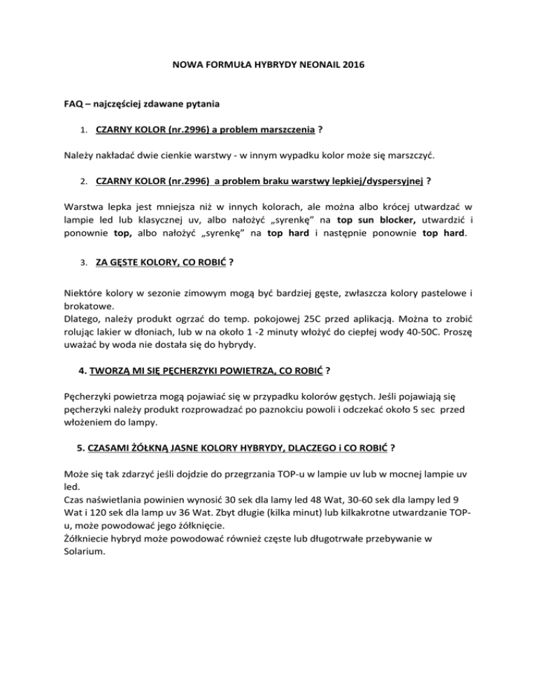 NOWA FORMUŁA HYBRYDY NEONAIL 2016 FAQ – najczęściej zdawane pytania u 1. CZARNY KOLOR (nr.2996) a problem marszczenia ? Należy nakładać dwie cienkie warstwy - w innym wypadku kolor może się marszczyć. 2. CZARNY KOLOR (nr.2996) a problem braku warstwy lepkiej/dyspersyjnej ? Warstwa lepka jest mniejsza niż w innych kolorach, ale można albo krócej utwardzać w lampie led lub klasycznej uv, albo nałożyć „syrenkę” na top sun blocker, utwardzić i ponownie top, albo nałożyć „syrenkę” na top hard i następnie ponownie top hard. 3. ZA GĘSTE KOLORY, CO ROBIĆ ? Niektóre kolory w sezonie zimowym mogą być bardziej gęste, zwłaszcza kolory pastelowe i brokatowe. Dlatego, należy produkt ogrzać do temp. pokojowej 25C przed aplikacją. Można to zrobić rolując lakier w dłoniach, lub w na około 1 -2 minuty włożyć do ciepłej wody 40-50C. Proszę uważać by woda nie dostała się do hybrydy. J 4. TWORZĄ MI SIĘ PĘCHERZYKI POWIETRZA, CO ROBIĆ ? Pęcherzyki powietrza mogą pojawiać się w przypadku kolorów gęstych. Jeśli pojawiają się pęcherzyki należy produkt rozprowadzać po paznokciu powoli i odczekać około 5 sec przed włożeniem do lampy. eh 5. CZASAMI ŻÓŁKNĄ JASNE KOLORY HYBRYDY, DLACZEGO i CO ROBIĆ ? e Może się tak zdarzyć jeśli dojdzie do przegrzania TOP-u w lampie uv lub w mocnej lampie uv led. Czas naświetlania powinien wynosić 30 sek dla lamy led 48 Wat, 30-60 sek dla lampy led 9 Wat i 120 sek dla lamp uv 36 Wat. Zbyt długie (kilka minut) lub kilkakrotne utwardzanie TOPu, może powodować jego żółknięcie. Żółkniecie hybryd może powodować również częste lub długotrwałe przebywanie w Solarium.