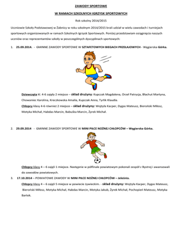 ZAWODY SPORTOWE W RAMACH SZKOLNYCH IGRZYSK SPORTOWYCH Rok szkolny 2014/2015 Uczniowie Szkoły Podstawowej w Żabnicy w roku szkolnym 2014/2015 brali udział w wielu zawodach i turniejach sportowych organizowanych w ramach Szkolnych Igrzysk Sportowych. Poniżej przedstawiam osiągnięcia naszych uczniów oraz reprezentantów szkoły w poszczególnych dyscyplinach sportowych: 1. 25.09.2014. - GMINNE ZAWODY SPORTOWE W SZTAFETOWYCH BIEGACH PRZEŁAJOWYCH - Węgierska Górka. Dziewczęta kl. 4-6 zajęły 2 miejsce – skład drużyny: Kupczak Magdalena, Orzeł Patrycja, Błachut Martyna, Chowaniec Karolina, Kreczkowska Amalia, Kupczak Anna, Tyrlik Klaudia. Chłopcy klasy 4-6 również 2 miejsce – skład drużyny: Wojtyła Kacper, Dygas Mateusz, Bieroński Miłosz, Motyka Michał, Habdas Marcin, Babuśka Marcin, Żyrek Michał. 2. 29.09.2014 - GMINNE ZAWODY SPORTOWE W MINI PIŁCE NOŻNEJ CHŁOPCÓW – Węgierska Górka. Chłopcy klasy 4 – 6 zajęli 1 miejsce. Następnie w półfinale powiatowym pokonali zespół z Bystrej i awansowali do zawodów powiatowych. 3. 17.10.2014 – POWIATOWE ZAWODY W MINI PIŁCE NOŻNEJ CHŁOPCÓW – Jeleśnia. Chłopcy klasy 4 – 6 zajęli 5 miejsce w powiecie żywieckim. - skład drużyny: Wojtyła Kacper, Dygas Mateusz, Bieroński Miłosz, Motyka Michał, Habdas Marcin, Motyka Jakub, Żyrek Michał, Pochopień Mateusz, Motyka Bartek. 4. 11.12.2014 - GMINNE ZAWODY SPORTOWE W MINI PIŁCE KOSZYKOWEJ DZIEWCZĄT I CHŁOPCÓW – Cisiec. Dziewczęta kl. 4-6 zajęły 1 miejsce – skład drużyny: Kupczak Magdalena, Orzeł Patrycja, Błachut Martyna, Kreczkowska Amalia, Kupczak Anna, Tyrlik Klaudia, Błachut Kinga, Gołek Marysia, Potasiak Paulina, Gluza Ola. Chłopcy klasy 4-6 również 1 miejsce – skład drużyny: Wojtyła Kacper, Dygas Mateusz, Madej Mateusz, Motyka Jakub, Habdas Marcin, Kupczak Mikołaj, Żyrek Michał, Motyka Dawid, Wolny Karol, Kozieł Dawid. 5. 03.12.2015 - GMINNE ZAWODY SPORTOWE W TENISIE STOŁOWYM CHŁOPCÓW – Cięcina. Chłopcy klasy 4-6 zajęli 1 miejsce – skład drużyny: Wojtyła Kacper, Dygas Mateusz, Madej Mateusz, 6. 13.01.2015 - POWIATOWE ZAWODY SPORTOWE W MINI PIŁCE KOSZYKOWEJ DZIEWCZĄT – Lipowa Dziewczęta kl. 4-6 zajęły 5 miejsce – skład drużyny: Kupczak Magdalena, Orzeł Patrycja, Błachut Martyna, Kreczkowska Amalia, Kupczak Anna, Tyrlik Klaudia, Błachut Kinga, Gołek Marysia, Potasiak Paulina, Gluza Ola. 7. 14.01.2015- POWIATOWE ZAWODY SPORTOWE W MINI PIŁCE KOSZYKOWEJ CHŁOPCÓW - Lipowa Chłopcy klasy 4-6 zajęli 6 miejsce – skład drużyny: Wojtyła Kacper, Dygas Mateusz, Madej Mateusz, Motyka Jakub, Habdas Marcin, Kupczak Mikołaj, Żyrek Michał, Motyka Dawid, Wolny Karol, Kozieł Dawid, Babuśka Marcin, Pytlarz Jakub. Do rozegrania zostały zawody powiatowe chłopców w tenisie stołowym w Jeleśni – zawody powiatowe chłopców, gminne zawody w mini piłce ręcznej dziewcząt i chłopców w Węgierskiej Górce oraz zawody gminne w czwórboju lekkoatletycznym dziewcząt i chłopców także w Węgierskiej Górce. Opracował: mgr DARIUSZ GLUZA