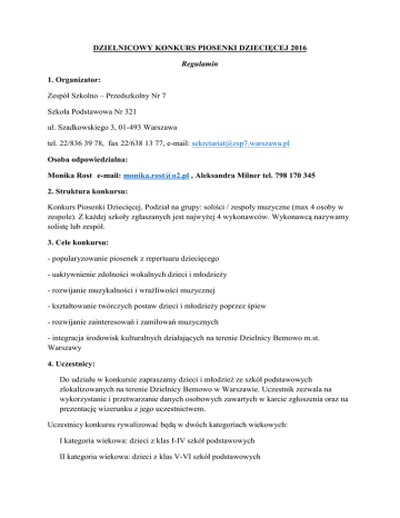 DZIELNICOWY KONKURS PIOSENKI DZIECIĘCEJ 2016 Regulamin 1. Organizator: Zespół Szkolno – Przedszkolny Nr 7 Szkoła Podstawowa Nr 321 ul. Szadkowskiego 3, 01-493 Warszawa tel. 22/836 39 78, fax 22/638 13 77, e-mail: [email protected] Osoba odpowiedzialna: Monika Rost e-mail: [email protected] , Aleksandra Milner tel. 798 170 345 2. Struktura konkursu: Konkurs Piosenki Dziecięcej. Podział na grupy: soliści / zespoły muzyczne (max 4 osoby w zespole). Z każdej szkoły zgłaszanych jest najwyżej 4 wykonawców. Wykonawcą nazywamy solistę lub zespół. 3. Cele konkursu: - popularyzowanie piosenek z repertuaru dziecięcego - uaktywnienie zdolności wokalnych dzieci i młodzieży - rozwijanie muzykalności i wrażliwości muzycznej - kształtowanie twórczych postaw dzieci i młodzieży poprzez śpiew - rozwijanie zainteresowań i zamiłowań muzycznych - integracja środowisk kulturalnych działających na terenie Dzielnicy Bemowo m.st. Warszawy 4. Uczestnicy: Do udziału w konkursie zapraszamy dzieci i młodzież ze szkół podstawowych zlokalizowanych na terenie Dzielnicy Bemowo w Warszawie. Uczestnik zezwala na wykorzystanie i przetwarzanie danych osobowych zawartych w karcie zgłoszenia oraz na prezentację wizerunku z jego uczestnictwem. Uczestnicy konkursu rywalizować będą w dwóch kategoriach wiekowych: I kategoria wiekowa: dzieci z klas I-IV szkół podstawowych II kategoria wiekowa: dzieci z klas V-VI szkół podstawowych 5. Kryteria oceny: Powołane przez Organizatora jury oceniać będzie: dobór repertuaru, staranność i swoboda wykonania (intonacja, dykcja, interpretacja), poczucie rytmu oraz ogólny wyraz artystyczny. 6. Warunki uczestnictwa: Soliści/ zespół muzyczny przygotowuje jedną dowolną piosenkę z repertuaru dziecięcego. Czas trwania prezentacji – do 4 minut. Karty zgłoszenia do 4 maja 2016r należy dostarczyć do Organizatora konkursu W tytule prosimy napisać: „Konkurs muzyczny ZSP7 ” faksem 22/638 13 77 lub pocztą elektroniczną na adres [email protected]. 7. Organizacja konkursu: • Do konkursu zgłaszać można maksymalnie czterech wykonawców z jednej placówki. Konkurs odbędzie się 20.05.2016r. w Ośrodku Profilaktyczno – Wychowawczym „MICHAEL” w Warszawie, ul. Ks. Bronisława Markiewicza1. Grafik występów zostanie opublikowany na stronie internetowej SP 321 (6 maj 2016r.) oraz przesłany mailem do szkół. • Powołane przez Organizatora jury przyzna trzy nagrody w każdej kategorii wiekowej oraz wyróżnienia według uznania. Rozdanie nagród połączone z występem publicznym nastąpi dnia 4.06.2016r godz. 10.00 w czasie Pikniku Rodzinnego ul. Szadkowskiego 3 (scena plenerowa) Lista osób nagrodzonych i wyróżnionych zostanie opublikowana na stronie internetowej SP 321 oraz rozesłana do szkół do 24 maja 2016r Wszyscy uczniowie biorący udział w konkursie oraz ich nauczyciele otrzymają dyplomy. • • 7. Dane techniczne: - uczestnicy mogą wykorzystać akompaniament na żywo (keyboard)) lub podkład muzyczny w postaci półplaybacku w formacie audio CD. - płyta CD powinna być podpisana (imię i nazwisko uczestnika) i nr utworu - Organizator zapewnia nagłośnienie i keyboard. 8. Postanowienia końcowe: Sprawy nie ujęte w regulaminie rozstrzyga Organizator w porozumieniu z jury. Szczegółowe informacje można uzyskać u Koordynatora konkursu - pani Moniki Rost ([email protected]) lub pani Aleksandry Milner ( tel: 798 170 345 )