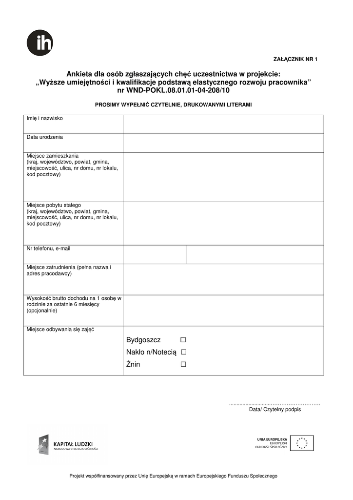 ZAŁĄCZNIK NR 1 Ankieta dla osób zgłaszających chęć uczestnictwa w projekcie: „Wyższe umiejętności i kwalifikacje podstawą elastycznego rozwoju pracownika” nr WND-POKL.08.01.01-04-208/10 PROSIMY WYPEŁNIĆ CZYTELNIE, DRUKOWANYMI LITERAMI Imię i nazwisko Data urodzenia Miejsce zamieszkania (kraj, województwo, powiat, gmina, miejscowość, ulica, nr domu, nr lokalu, kod pocztowy) Miejsce pobytu stałego (kraj, województwo, powiat, gmina, miejscowość, ulica, nr domu, nr lokalu, kod pocztowy) Nr telefonu, e-mail Miejsce zatrudnienia (pełna nazwa i adres pracodawcy) Wysokość brutto dochodu na 1 osobę w rodzinie za ostatnie 6 miesięcy (opcjonalnie) Miejsce odbywania się zajęć Bydgoszcz Nakło n/Notecią Żnin □ □ □ ............................………………………. Data/ Czytelny podpis Projekt współfinansowany przez Unię Europejską w ramach Europejskiego Funduszu Społecznego Preferowany sposób uczestnictwa w szkoleniach zawodowych Prosimy zaznaczyć to szkolenia zawodowe, w którym najbardziej chcieliby Państwo uczestniczyć znakiem „X” w miejscu pod opisem szkolenia. Zaznaczenie szkolenia nie oznacza, że będą Państwo na pewno w nim uczestniczyć. Ostateczny przydział osób do poszczególnych szkoleń nastąpi na podstawie listy rankingowej uczestników projektu. Osoby na wyższych miejscach listy rankingowej będą miały pierwszeństwo w wyborze szkolenia zawodowego. Szkolenie 1: „Doskonalenie procesu sprzedaży i obsługi klienta” (organizacja procesu sprzedaży, promocji i doskonalenia kompetencji osób zajmujących się obsługą klienta, metody zwiększania efektywności sprzedaży), 32 godziny lekcyjne, 4 dni zajęć, w tym 8 godzinny moduł: „Doskonalenie umiejętności społecznych” (komunikacja interpersonalna, asertywność, konstruktywne rozwiązywanie sytuacji konfliktowych). Dodatkowo jedna godzina lekcyjna konsultacji indywidualnych/coachingu (ocena mocnych i słabych stron osoby, określenie krótko i długo terminowych celów i zobowiązań). □ Szkolenie 2: „Skuteczny kierownik zespołu” (pozyskiwanie, doskonalenie i motywowanie pracowników, strategie personalne, doskonalenie procesu kadrowego, ocena, coaching, budowanie systemów motywacyjno – lojalnościowych), 32 godziny lekcyjne, 4 dni zajęć, w tym 8 godzinny moduł: „Doskonalenie umiejętności społecznych” (komunikacja interpersonalna, asertywność, konstruktywne rozwiązywanie sytuacji konfliktowych). Dodatkowo jedna godzina lekcyjna konsultacji indywidualnych/coachingu (ocena mocnych i słabych stron osoby, określenie krótko i długo terminowych celów i zobowiązań). □ Uwaga! Szkolenia zawodowe odbywać się będą w miastach, w których deklarowali Państwo chęć uczestniczenia w Projekcie. Terminy tych szkoleń zostaną ustalone później. Mogą się one odbywać w dni powszednie w godzinach popołudniowych (15.30-22.00), lub w soboty i niedziele w godzinach rannych (8.00-14.30) i popołudniowych (15.00-21.30). Jedna godzina konsultacji indywidualnych/coachingu i jedna godzina zajęć indywidualnych językowych (połączone w 2 godzinny moduł indywidualny) będą się odbywać zawsze w Bydgoszczy w dni powszednie oraz w soboty i niedziele w godzinach od 8.00 do 21.00. Projekt współfinansowany przez Unię Europejską w ramach Europejskiego Funduszu Społecznego