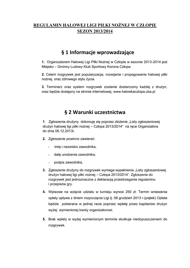 REGULAMIN HALOWEJ LIGI PIŁKI NOŻNEJ W CZŁOPIE