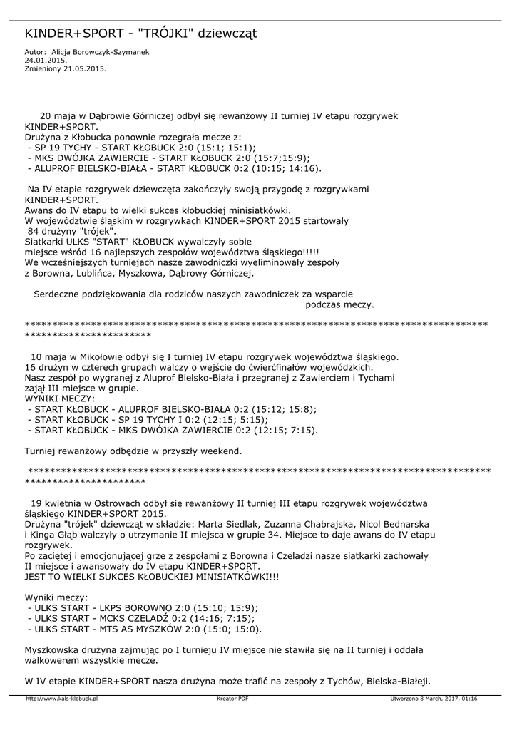 KINDER+SPORT - "TRÓJKI" dziewcząt Autor: Alicja Borowczyk-Szymanek 24.01.2015. Zmieniony 21.05.2015. 20 maja w Dąbrowie Górniczej odbył się rewanżowy II turniej IV etapu rozgrywek KINDER+SPORT. Drużyna z Kłobucka ponownie rozegrała mecze z: - SP 19 TYCHY - START KŁOBUCK 2:0 (15:1; 15:1); - MKS DWÓJKA ZAWIERCIE - START KŁOBUCK 2:0 (15:7;15:9); - ALUPROF BIELSKO-BIAŁA - START KŁOBUCK 0:2 (10:15; 14:16). Na IV etapie rozgrywek dziewczęta zakończyły swoją przygodę z rozgrywkami KINDER+SPORT. Awans do IV etapu to wielki sukces kłobuckiej minisiatkówki. W województwie śląskim w rozgrywkach KINDER+SPORT 2015 startowały 84 drużyny "trójek". Siatkarki ULKS "START" KŁOBUCK wywalczyły sobie miejsce wśród 16 najlepszych zespołów województwa śląskiego!!!!! We wcześniejszych turniejach nasze zawodniczki wyeliminowały zespoły z Borowna, Lublińca, Myszkowa, Dąbrowy Górniczej. Serdeczne podziękowania dla rodziców naszych zawodniczek za wsparcie podczas meczy. ************************************************************************************ *********************** 10 maja w Mikołowie odbył się I turniej IV etapu rozgrywek województwa śląskiego. 16 drużyn w czterech grupach walczy o wejście do ćwierćfinałów wojewódzkich. Nasz zespół po wygranej z Aluprof Bielsko-Biała i przegranej z Zawierciem i Tychami zajął III miejsce w grupie. WYNIKI MECZY: - START KŁOBUCK - ALUPROF BIELSKO-BIAŁA 0:2 (15:12; 15:8); - START KŁOBUCK - SP 19 TYCHY I 0:2 (12:15; 5:15); - START KŁOBUCK - MKS DWÓJKA ZAWIERCIE 0:2 (12:15; 7:15). Turniej rewanżowy odbędzie w przyszły weekend. ************************************************************************************ ********************** 19 kwietnia w Ostrowach odbył się rewanżowy II turniej III etapu rozgrywek województwa śląskiego KINDER+SPORT 2015. Drużyna "trójek" dziewcząt w składzie: Marta Siedlak, Zuzanna Chabrajska, Nicol Bednarska i Kinga Głąb walczyły o utrzymanie II miejsca w grupie 34. Miejsce to daje awans do IV etapu rozgrywek. Po zaciętej i emocjonującej grze z zespołami z Borowna i Czeladzi nasze siatkarki zachowały II miejsce i awansowały do IV etapu KINDER+SPORT. JEST TO WIELKI SUKCES KŁOBUCKIEJ MINISIATKÓWKI!!! Wyniki meczy: - ULKS START - LKPS BOROWNO 2:0 (15:10; 15:9); - ULKS START - MCKS CZELADŹ 0:2 (14:16; 7:15); - ULKS START - MTS AS MYSZKÓW 2:0 (15:0; 15:0). Myszkowska drużyna zajmując po I turnieju IV miejsce nie stawiła się na II turniej i oddała walkowerem wszystkie mecze. W IV etapie KINDER+SPORT nasza drużyna może trafić na zespoły z Tychów, Bielska-Białeji. http://www.kals-klobuck.pl Kreator PDF Utworzono 8 March, 2017, 01:16 Czekamy cierpliwie na wyniki meczy z grup 35 i 36. *********************************************************************************** ************ 12 kwietnia (niedziela) na hali Gimnazjum w Kłobucku rozegrany został I turniej III etapu rozgrywek KINDER+SPORT dla okręgu częstochowsko zawierciańskiego. Do Kłobucka przyjechały drużyny z Ostrów, Borowna, Częstochowy, Dąbrowy Górniczej, Myszkowa, Czeladzi. Obsługę sędziowską sprawowały zawodniczki ULKS START KŁOBUCK, grające na co dzień w Kobiecej Amatorskiej Lidze Siatkówki powiatu kłobuckiego: Dorota Szymczyńska, Izabela Supernak, Marta Winecka, Barbara Masternak i Dorota Kubicka. Zespoły po wcześniejszych awansach trafiły do grupy 33 i 34. Kłobucka trójeczka (Marta Siedlak, Zuzanna Chabrajska, Nicol Bednarska i Kinga Głąb) rozegrała swoje mecze (grupa 34) z Borownem, Myszkowem i Czeladzią. Wyniki spotkań w grupie 34 podczas I turnieju: ULKS START KŁOBUCK - LKPS BOROWNO 2:0 (17:15; 15:8); ULKS START KŁOBUCK - MTS AS MYSZKÓW 2:0 (17:15; 15:11); ULKS START KŁOBUCK - MCKS CZELADŹ 0:2 (9:15; 9:15); MTS AS MYSZKÓW - LKPS BOROWNO 0:2 (12:15; 11:15); MTS AS MYSZKÓW - MCKS CZELADŹ 0:2 (9:15; 6:15); MCKS CZELADŹ - LKPS BOROWNO 2:0 (6:15; 9:15). Wyniki grupy 34 po I turnieju III etapu rozgrywek KINDER+SPORT 2015: I miejsce - MCKS CZELADŹ - 6 pkt., II miejsce - ULKS START KŁOBUCK - 5 pkt., III miejsce - LKPS BOROWNO - 4 pkt., IV miejsce - MTS AS MYSZKÓW - 3 pkt.. Kłobucka drużyna, aby awansować musi po II turnieju utrzymać II miejsce w grupie. Do IV etapu rozgrywek przechodzą zespoły z miejsca I i II. Grupa 33 - Ostrowy, Częstochowa, Dąbrowa Górnicza i Zawiercie (drużyna usprawiedliwiła swoją nieobecność i wszystkie mecze rozegra podczas II turnieju). Wyniki grupy 33: UKS DĄBROWIAK D. G. - KS CZĘSTOCHOWIANKA 2:0 (15:13; 15:11); UKS DĄBROWIAK - UKS TYTAN OSTROWY 2:1 (11:15; 15:10; 11:5); KS CZĘSTOCHOWIANKA - UKS TYTAN OSTROWY 1:2 (15:11; 15:17; 7:11). ********************************************************************************** **** 29 marca - II rewanżowy turniej II etapu rozgrywek KINDER+SPORT w Czeladzi. Kłobuckie siatkareczki spisały się rewelacyjnie pokonując swoje rywalki w grupie we wszystkich meczach 2:0 lub 2:1. Ponieważ drużyna "Dąbrowiaka" Dąbrowa Górnicza usprawiedliwiła swoją nieobecność podczas I turnieju II etapu to w niedzielnych zawodach rozgrywała zaległe mecze. Nasza "trójeczka" ponownie pokonała zespoły z Borowna 2:0 a drużynę z Dąbrowy w pierwszym meczu 2:1 i w drugim 2:0. WYNIKI II TURNIEJU II ETAPU KINDER+SPORT: - "DĄBROWIAK" DĄBROWA GÓRNICZA - ULKS "START" KŁOBUCK - 1:2 (12:15; 15:13; 6:11); - LKPS BOROWNO IV - ULKS "START" KŁOBUCK - 0:2 (10:15; 6:15); - LKPS BOROWNO I - ULKS "START" KŁOBUCK - 0:2 (12:15; 7:15); - "DĄBROWIAK" DĄBROWA GÓRNICZA - ULKS "START" KŁOBUCK - 0:2 (12:15; 7:15). PUNKTACJA W GRUPIE 18: - ULKS "START" KŁOBUCK - 12 pkt., - "DĄBROWIAK" DĄBROWA GÓRNICZA - 8 pkt., http://www.kals-klobuck.pl Kreator PDF Utworzono 8 March, 2017, 01:16 - LKPS BOROWNO I - 4 pkt., - LKPS BOROWNO IV - 0 pkt.. Kłobucka drużyna ULKS "START" awansuje do III etapu rozgrywek KINDER+SPORT z I miejsca!!! W kolejnych dwóch turniejach dziewczęta zagrają z zespołami: - MT