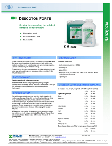 N ARZĘDZIA DESCOTON FORTE Środek do manualnej dezynfekcji narzędzi i endoskopów Nie zawiera fenoli Na liście DGHM / VAH Na liście RKI 0482 TYP PREPARATU Dzięki starannie dobranej kompozycji substancji czynnych Descoton Forte ma szerokie spektrum działania przy możliwie najniższym stężeniu użytkowym, nie pozostawiając przy tym przykrego zapachu. Zawiera bardzo efektywne inhibitory korozji. Środek bardzo ekonomiczny ze względu na niskie stężenia robocze i długi czas aktywności roztworu roboczego, który wynosi do 14 dni. Ulega biodegradacji. ZASTOSOWANIE MIKROBIOLOGIA Descoton Forte działa: - bakteriobójczo (włącznie z MRSA) - prątkobójczo - grzybobójczo - wirusobójczo wg RKI (HBV / HIV, HAV, BVDV, Vaccinia, Adeno, Polio, Papova / Polyoma) - sporobójczo Szybka dezynfekcja połączona z myciem Descoton Forte dobrze nadaje się do dezynfekcji narzędzi chirurgicznych wszelkiego rodzaju, włącznie z narzędziami z chirurgii MI, osprzętem anestezjologicznym i endoskopami giętkimi i sztywnymi. SPOSÓB UŻYCIA STĘŻENIA UŻYTKOWE I CZAS DZIAŁANIA B, (włącznie Tbc, MRSA), F wg VAH / DGHM / prEN WI 33/34/35 1,0% 60 min. Szybka dezynfekcja 2,0% 15 min. Narzędzia, natychmiast po użyciu, włożyć w stanie otwartym do roztworu użytkowego. Wszystkie powierzchnie i zagłębienia, które mają zostać zdezynfekowane, muszą być całkowicie pokryte roztworem użytkowym. Wymieniać roztwór zależnie od zabrudzenia. Po dezynfekcji narzędzia dokładnie opłukać pod bieżącą wodą i wysuszyć. Środek nadaje się do wszystkich metod cyrkulacyjnych. Do konserwacji zawiasów stosować Silikonspray lub Spezial Ölspray. Spory 3,0% 12 godz. Wskazówka: przy bardzo silnie zabrudzonych narzędziach poleca się dodatkowe środki myjące, jak Instru Plus, Desco Cleaner. Przy stosowaniu Desco Cleaner czas aktywności skraca się do jednego dnia. HBV / HIV 0,5% 60 min. 1,5% 30 min. 2,0% 15 min. HCV / BVDV 0,5% 5 min. Vaccinia 1,0% 15 min. HAV 6,0% 120 min. Adeno 1,0% 30 min. 2,0% 15 min. Papova / Polyoma 1,0% 60 min. Polio 2,0% 60 min. Wirusy wg RKI 2,0% 60 min. Czas ekspozycji dla dezynfekcji w razie epidemii zgodnie z RKI MEDIM Sp. z o.o. • ul. Puławska 45B• 05-500 Piaseczno tel. (022 tel. (022) 570 90 00 • faks (022) 570 90 01 • [email protected] 3,0% 120 min. 5,0% 60 min. Rev. 05.06.2008 Rok założenia 1990 • Konsultacje • Dostawy • Szkolenia • Instalacje • Serwis techniczny ® KARL STORZ - ENDOSKOPE – endoskopia medyczna • INTUITIVE SURGICAL – roboty chirurgiczne Da Vinci • DR. SCHUMACHER – środki do mycia i dezynfekcji • MEDISAFE – myjnie ultradźwiękowe • PROGRAM HIGIENY SZPITALNEJ – materiały eksploatacyjne i wyposażenie CS Środek do manualnej dezynfekcji narzędzi i endoskopów EKSPERTYZY SKŁAD 100 g preparatu zawiera: 7,6 g methanalu 4,5 g aldehydu glutarowego Wszystkie tenzydy zawarte w produkcie ulegają biodegradacji. DANE FIZYKO - CHEMICZNE Forma / kolor: klarowny, zielony płyn Wartość pH koncentratu: 4,0 +/- 0,5 Wartość pH roztworu 1,0% ok. 5,6 Prof. Dr. Werner, higienista, Schwerin: Ekspertyza dot. dezynfekcji narzędzi wg wytycznych DGHM / VAH, 08.04.1998; Ekspertyza w sprawie wpisania na listę RKI zgodnie z § 18 lfSG, 30.07.1997. N ARZĘDZIA DESCOTON FORTE Prof. Dr. Schubert, higienista, Frankfurt nad Menem: Ekspertyza dot. dezynfekcji narzędzi wg wytycznych nowego DGHM / VAH 9/2001 (zgodnie z europejską normą prEN WI 33/34/35), 06.03.2006. Dr. Steinmann, wirusolog, Brema: Ekspertyzy dot. skuteczności niszczenia: wirusów hepatitis B z dn. 11.10.1999; wirusów hepatitis A z dn. 09.09.2002; wirusów polio z dn. 10.03.2008; wirusów Vaccinia z dn. 17.04.2006; wirusów Adeno z dn. 05.07.2006; wirusów Papova / Polyoma z dn. 24.05.2006; wirusów BVDV z dn. 09.10.2006. Dr. Färber, higienista, Giessen: Ekspertyza dot. przestojów z dn. 12.06.97; Ekspertyza dot. skuteczności sporobójczej, 05.10.1998. DOSTĘPNE OPAKOWANIA Dermatest, Dr. Voss, dermatolog: Test Epicutan, 29.04.1997. Pojedyncze opakowania Jedn. sprzedaży PZN 2 L butelka PE z uchwytem 6x2L 4606538 5 L kanister PE 3x5L 4606544 DOZOWNIKI Pompka dozująca do butelki 2-litrowej oraz kanistra 5-litrowego, kran do kanistra, otwieracz do kanistra, automat dozujący. UWAGI Nie poleca się stosowania w wannach na narzędzia firmy KMTS! Descoton Forte pierwotnie może wywołać na skórze objawy podrażnienia. Dlatego należy unikać kontaktu skóry i oczu z roztworem użytkowym i koncentratem. Zabrudzone preparatem miejsca ciała spłukać dokładnie dużą ilością wody. Podczas pracy ze środkami dezynfekcyjnymi, należy nosić rękawice i okulary ochronne. Nie spożywać. Dr. Memmert, biolog, Bazylea: Środowiskowo-chemiczna ekspertyza dot. biodegradacji, 12.11.1997. Firma Olympus-Winter & Ibe: Test tolerancji materiałowej endoskopów, 12.10.1999. Firma Pentax: Test tolerancji materiałowej endoskopów, 23.01.2001. Firma Karl Storz Endoskope: Test tolerancji materiałowej endoskopów, 18.03.1999. S. Bosse, Melsungen: Badanie wyników mycia środkiem Descoton Forte, marzec 1998. Firma Richard Wolf GmbH: Test tolerancji materiałowej endoskopów, 28.11.2002. REJESTRACJA Figuruje na aktualnej liście środków dezynfekcyjnych DGHM / VAH. Zgłoszony do Federalnego Urzędu Środowiska w Berlinie. Przyjęty na listę RKI zgodnie z § 18, lfSG. Wpis do Rejestru Wyrobów Medycznych: PL/DR 000709. Zarejestrowany jako wyrób medyczny zgodnie z wytycznymi UE 93/42 EEC. MEDIM Sp. z o.o. • ul. Puławska 45B• 05-500 Piaseczno tel. (022 tel. (022) 570 90 00 • faks (022) 570 90 01 • [email protected] Rev. 05.06.2008 Rok założenia 1990 • Konsultacje • Dostawy • Szkolenia • Instalacje • Serwis techniczny ® KARL STORZ - ENDOSKOPE – endoskopia medyczna • INTUITIVE SURGICAL – roboty chirurgiczne Da Vinci • DR. SCHUMACHER – środki do mycia i dezynfekcji • MEDISAFE – myjnie ultradźwiękowe • PROGRAM HIGIENY SZPITALNEJ – materiał